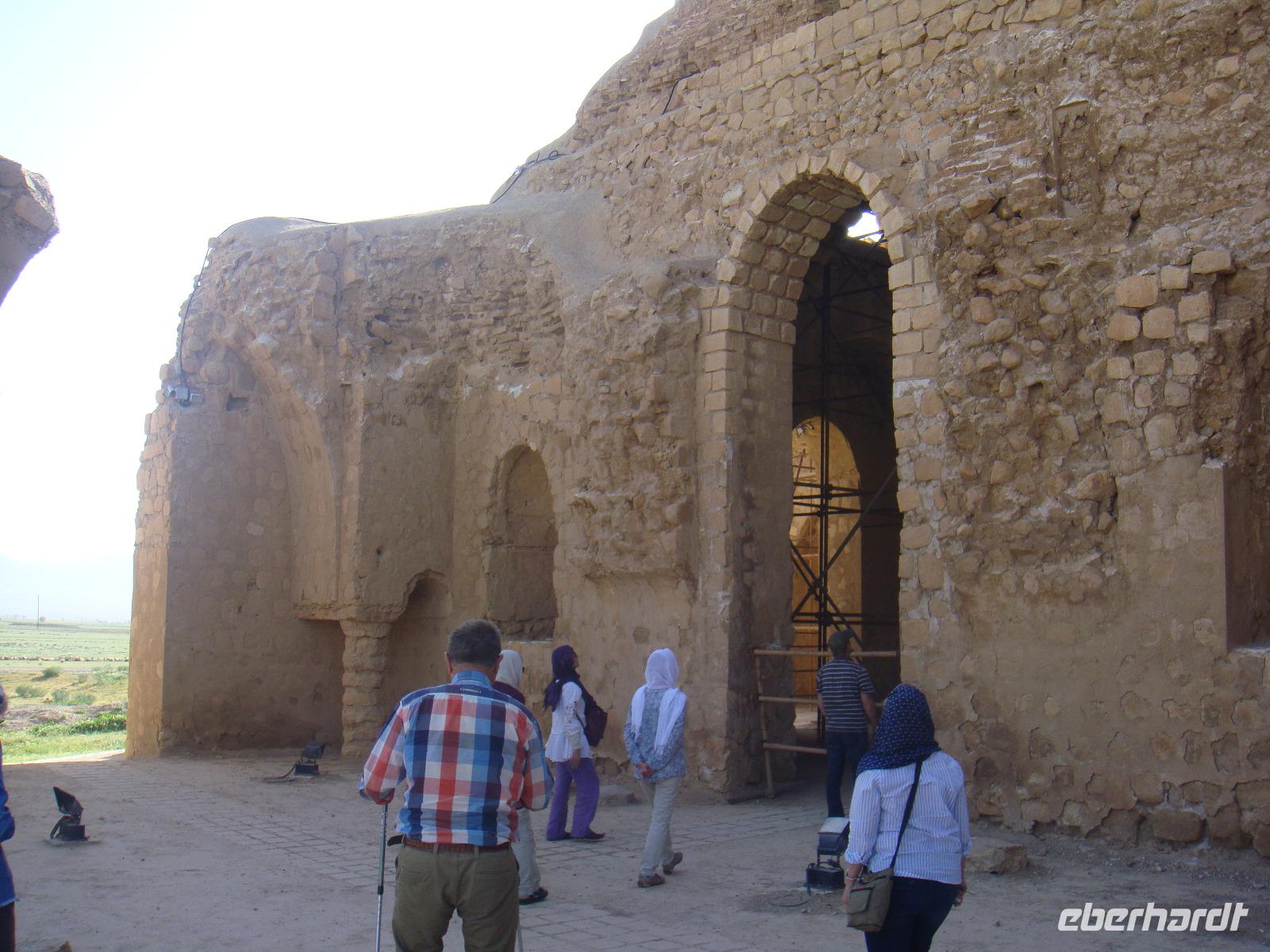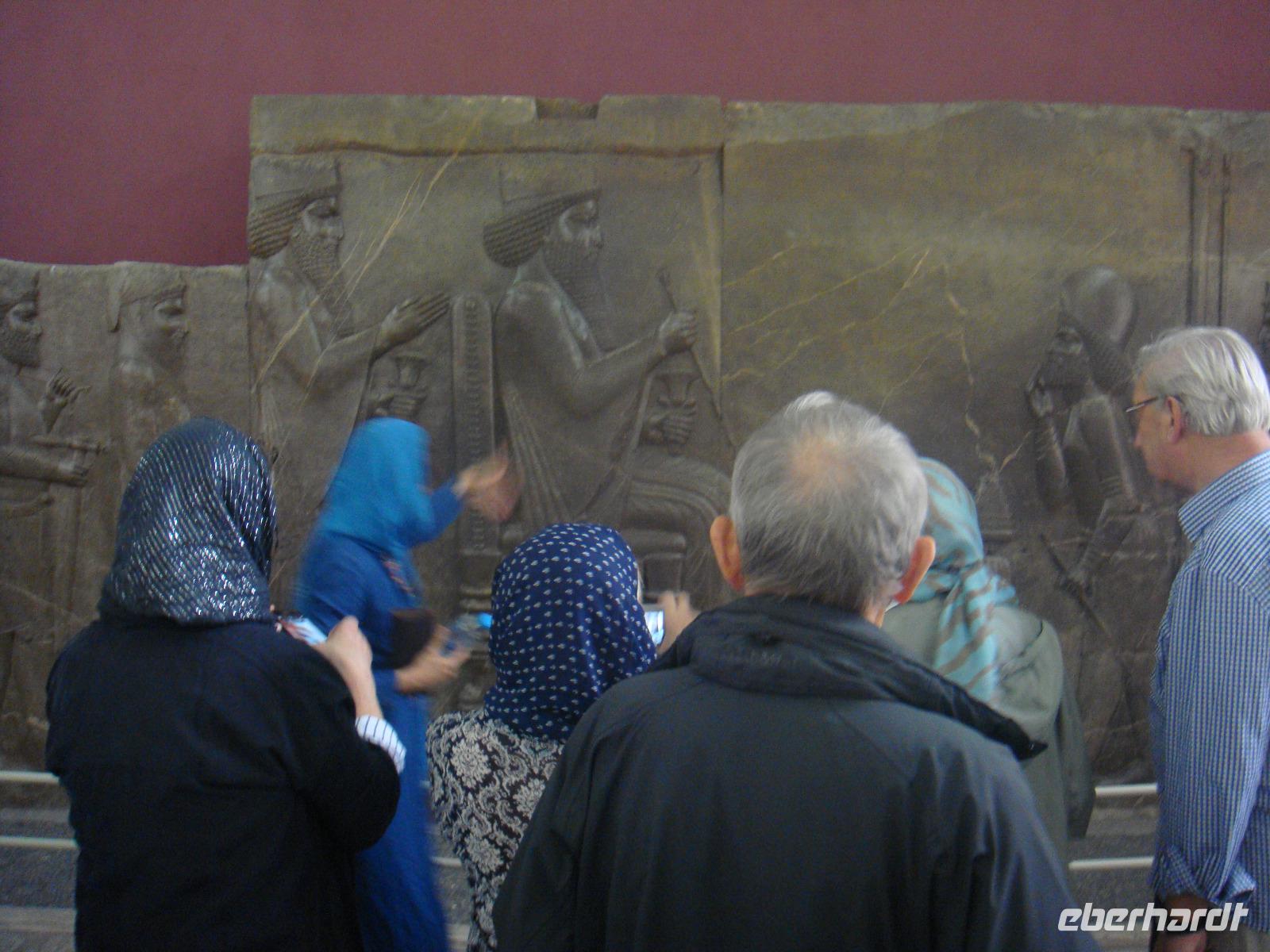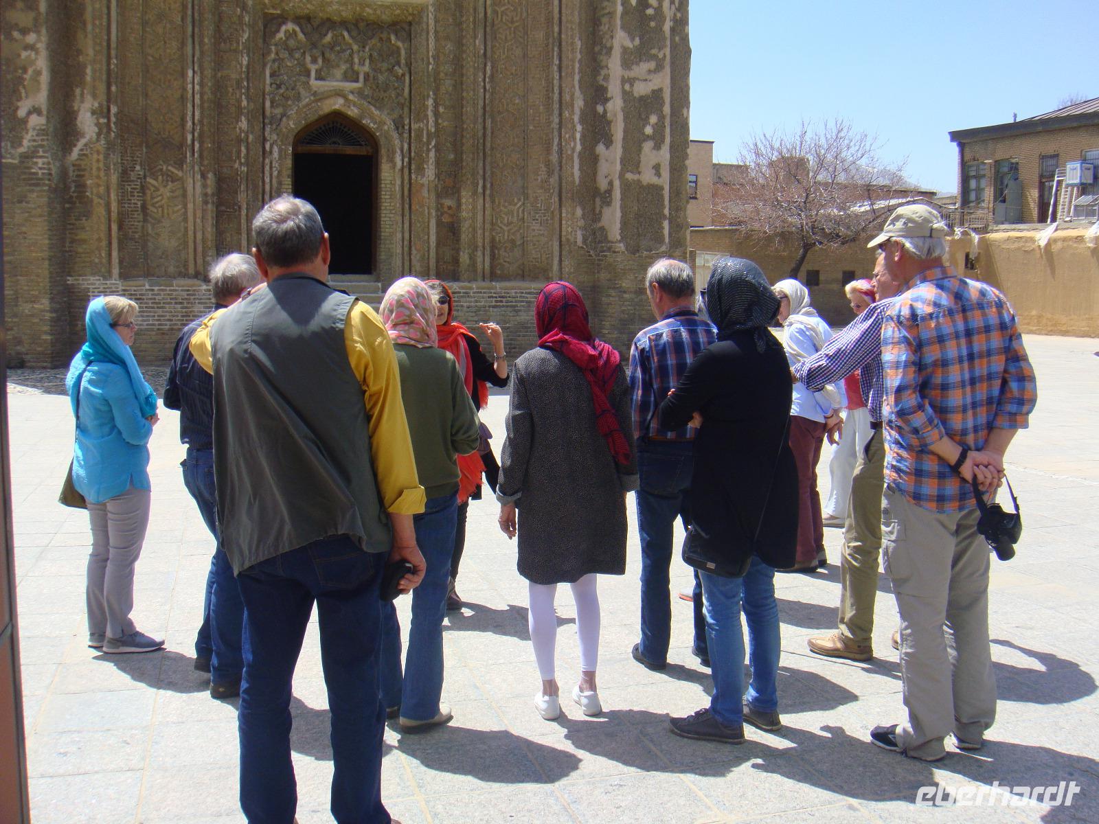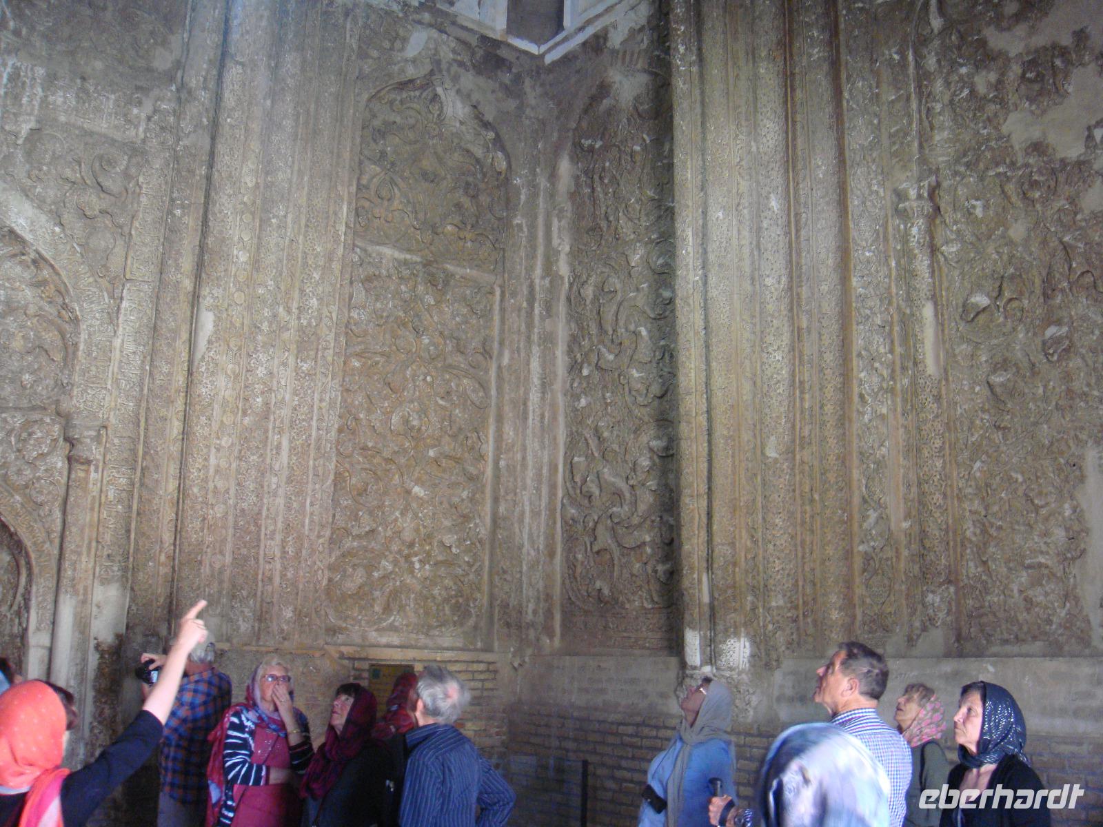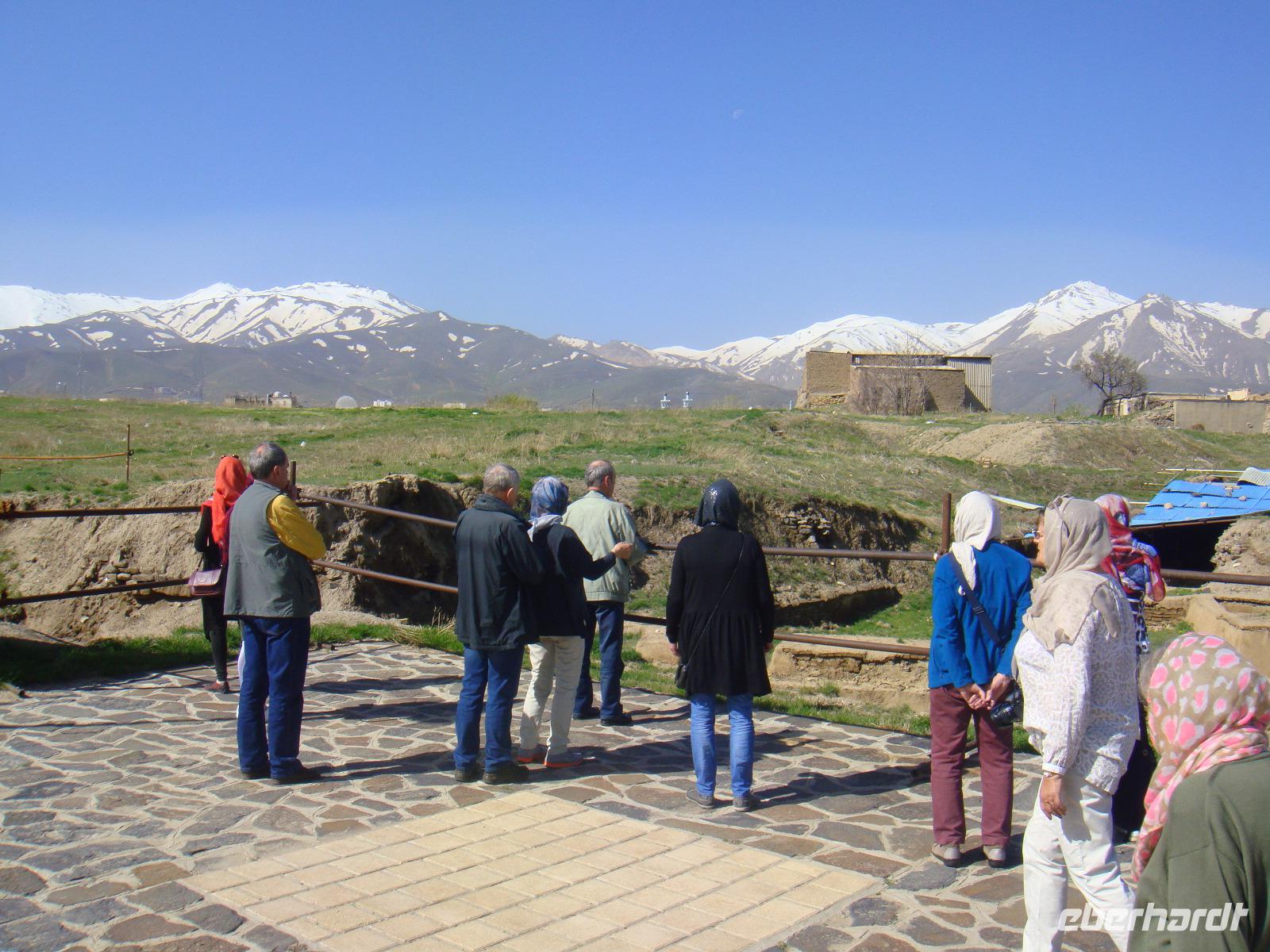Als erstes besuchen wir in Hamadan den Hegmataneh-Hügel, auf dem sich Hagmatana, die Hauptstadt der Meder befand (ca. 715-550 v.Chr.). Die freigelegten Gassen und Hausmauern auf dem Hügel stammen aus der späteren seleukidischen und parthischen Zeit. Nach dem Rundgang über das Ausgrabungsgelände erhalten wir im dazugehörigen, sehr informativen Museum wunderbare Einblicke. Den Abschluss bildet die ebenfalls auf dem Gelände stehende, ca. 160 Jahre alte, armenische Kirche. Vom Hegmataneh- Hügel gehen wir zum Mausoleum von Esther und Mordachai. Esther war die Frau von König Xerxes und rettete die jüdische Bevölkerung Susas durch Fürbitte bei ihrem Gemahl vor den Progromen. Die Rettung soll der Anlass für das jüdische Purimfest sein. Anschließend besuchten wir den Gonbad-e Alavian Grabbau, eine Anlage aus der späten seldschukischen bis ilkhanidischen Zeit. Bekannt ist er auch unter dem Namen Seldschuken-Grab. Weiter geht es zum Mausoleum von Bu Ali. Er war der bekannteste persische Mediziner, Gelehrte und Philosoph des 11.Jahrhunderts und ist im Abendland unter dem Namen Avicenna bekannt. Uns ist er durch den Roman „Der Medicus" von Noah Gordon und dessen Verfilmung bekannt. Auf dem Rückweg zum Bus kaufe ich Pistiazien und Mandeln welche wir bei unserer Tee- Pause am steinernen Löwen, verköstigen. Es ist eine stark verwitterte Skulptur, welche laut Legende auf Anweisung Alexander des Großen in Gedenken an seinen hier verstorbenen General Hephaistion in Auftrag gegeben wurde. Danach fuhren wir ins Gandj Nameh (Schatzbuch) -Tal, welches unweit von Hamadan, an einem Ausläufer des Alvand-Gebirges liegt. Der Grund für unseren Besuch waren die beiden in den Fels geschlagenen Inschriften aus der Zeit von Darius I. und Xerxes I.. Diese sind jeweils in drei Blöcke aufgeteilt, welche in altpersischer, neu-elamischer und neu-babylonischer Keilschrift den zoroastrischen Gott Ahura Mazda und die jeweiligen weltlichen Herrscher, Darius bzw. Xerxes, preisen. Voller Eindrücke fahren wir zum Hotel und den heutigen Abend verbringen wir bei einer Iranischen Familie. Die junge Studentin hat uns als Dankeschön zu sich in Ihr Haus zum Abendessen eingeladen. Hier zeigt sich die unglaubliche Freundlichkeit der Iraner. Wir würden fürstlich bekocht und kamen ins Gespräch. Die Frau des Hauses hatte leckere Speisen bereitet. Wir tauschen Adressen aus und bekommen zum Abschied ein Gruppenbild und eine kleine Schale geschenkt. Völlig überwältigt von dieser Herzlichkeit fahren wir zurück in unser Hotel