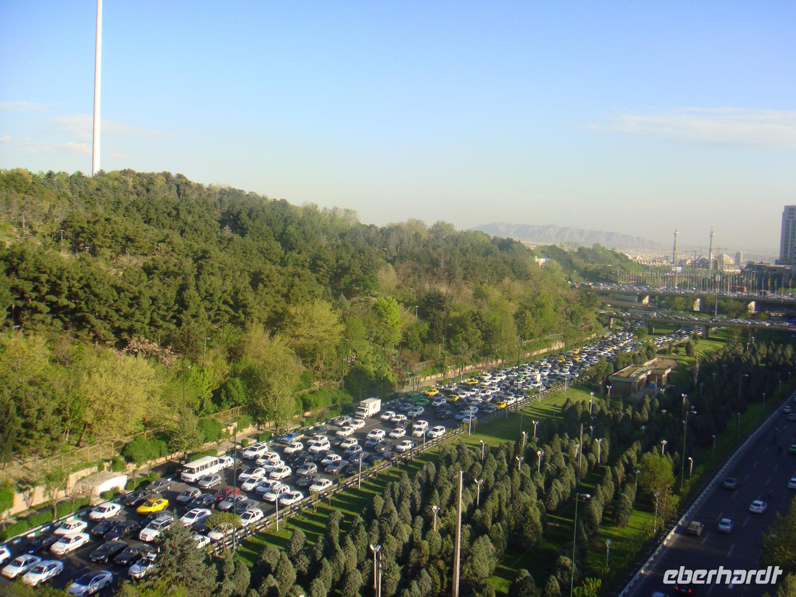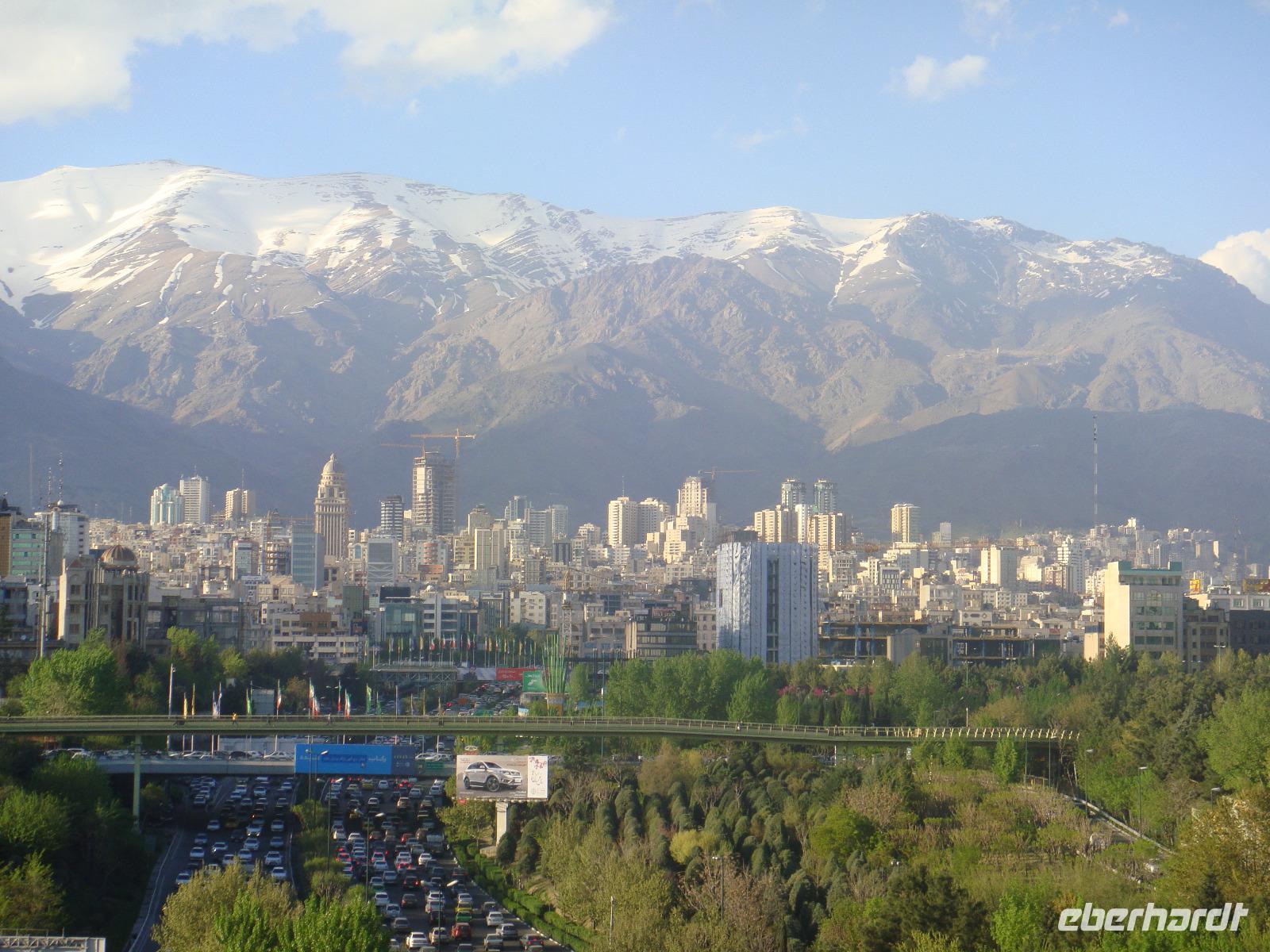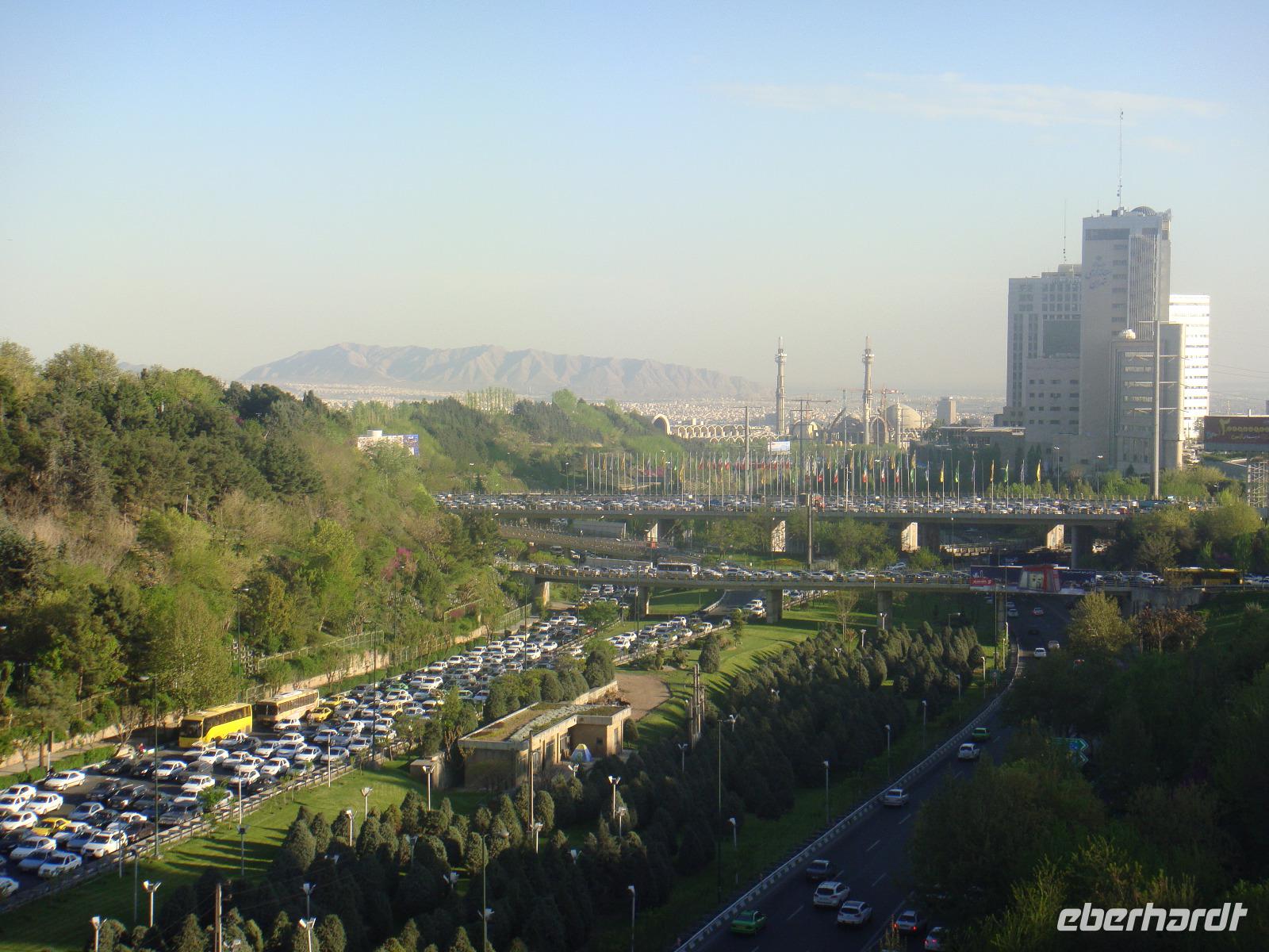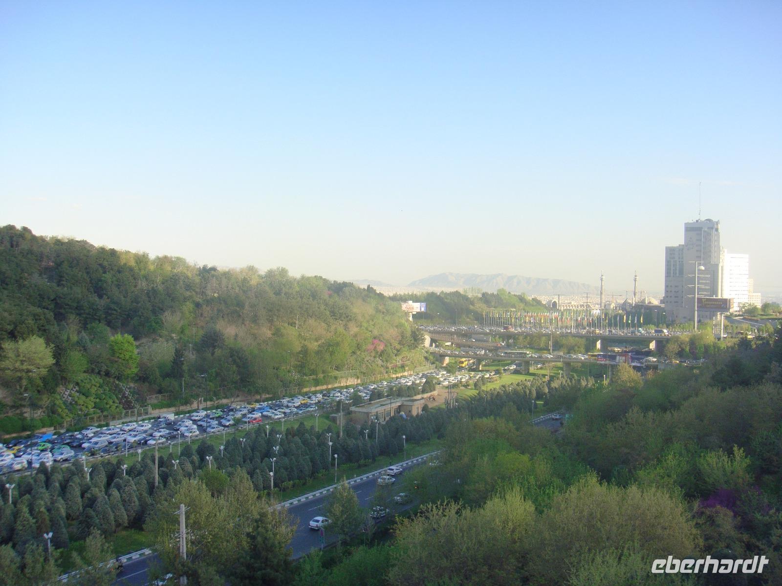 Nach einer kurzen Nacht aber einem guten Frühstück mit grandioser Aussicht starten wir in das Abendteuer Teheran. Schon auf unserer Fahrt zum iranischen Nationalmuseum lernen wir den Verkehr dieser ca. 13 Millionen Einwohner Stadt hautnah kennen, denn wir stecken schon im ersten Stau. Simin gibt uns im Nationalmuseum einen guten Überblick über den Iran und dessen Zeitgeschichte. Auf geht's zum Golestan-Palast. Der Palast wurde Ende des 18. Bzw. Anfang des 19. Jahrhunderts errichtet und bis zur Errichtung der Islamischen Republik war er der offizielle Sitz des persischen Monarchen. Besonders eindrucksvoll waren für uns der Marmorthron und die Residenz der qajarischen Könige im Empfangspalast (Emarat-e Salam). Eine wahre Glitzerwelt. Anschließend genießen wir eine kleine Kaffeepause und schlendern weiter zum Basar. Viele Händler bieten Ihre Waren an und wir sind umgeben von dem quirligen Treiben. Besichtigung macht hungrig und so nehmen wir nach dem Bummel unser Mittagessen in einem kleinen Restaurant in der Nähe des Basars ein. Als nächster Programmpunkt steht der Fernsehturm Teherans. Simin führt uns jedoch zur Tabiat- Brücke. Das aushalten im Stau hat sich gelohnt. Die Brücke befindet sich im Norden der Stadt und wurde 2014 fertiggestellt. Sie wurde von einer jungen Architektin Leila Araghian entworfen. Die Fußgängerbrücke ist 270 Meter lang und verbindet über eine Stadtautobahn zwei Parks. Sie bietet den Iranern einen idealen Ort um sich etwas zu erholen, zu spazieren und Fotos mit der wunderbaren Kulisse des Elburs-Gebirges zu schießen.
