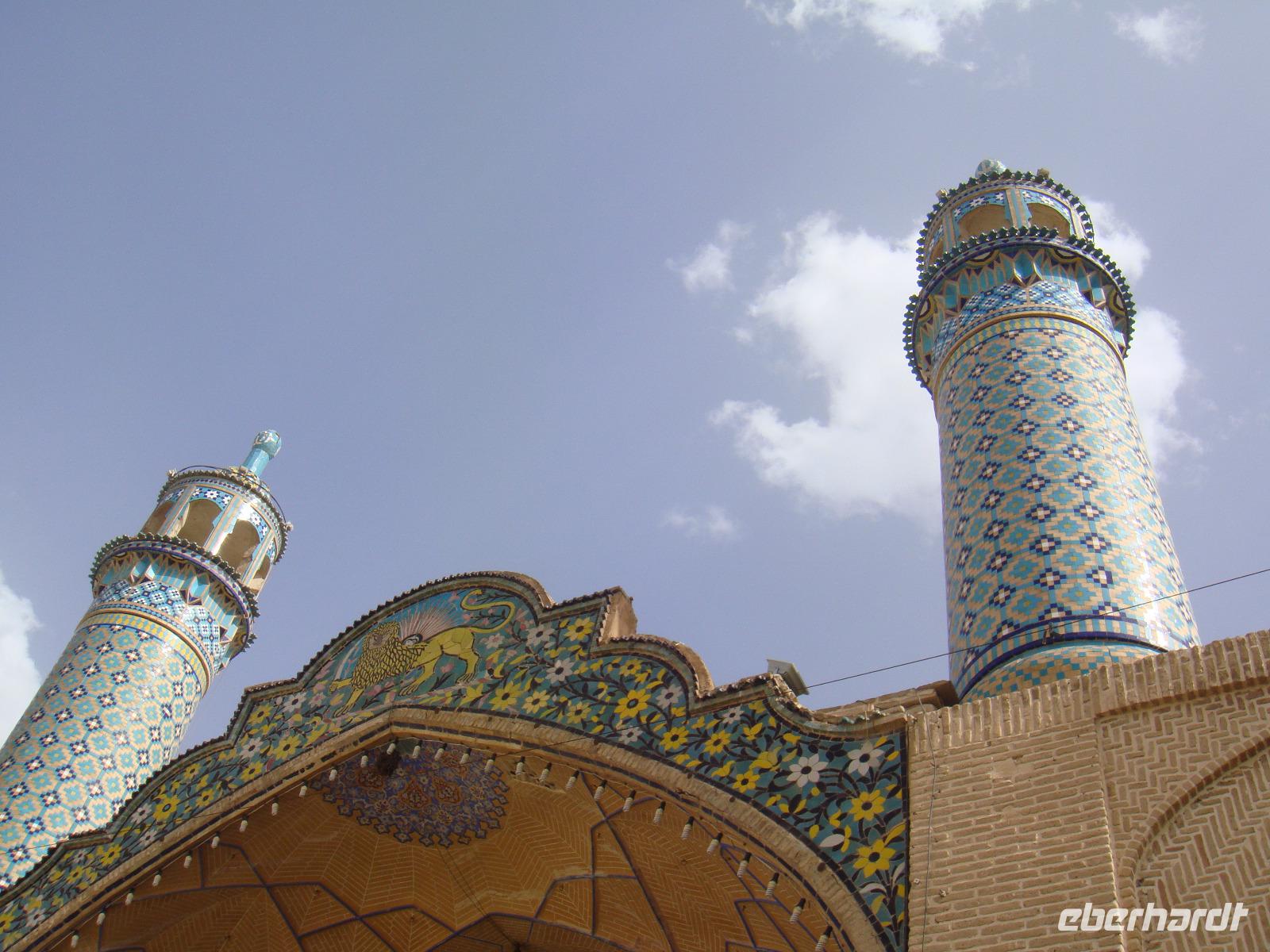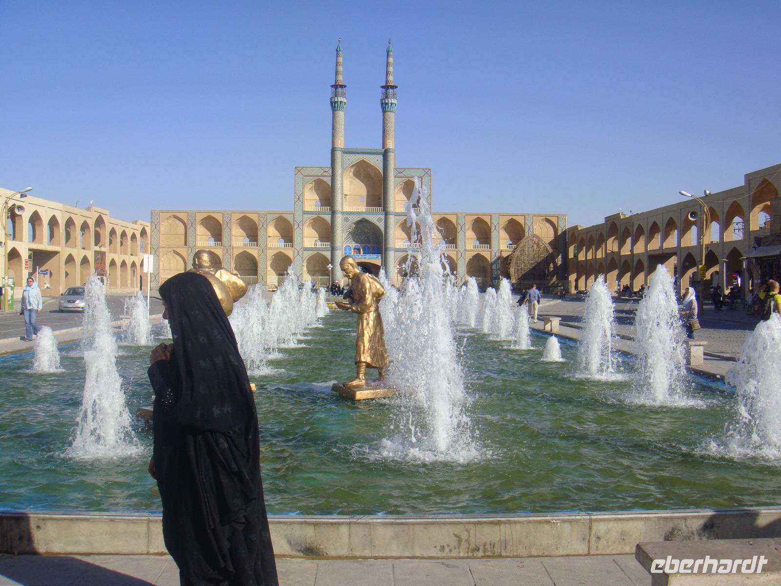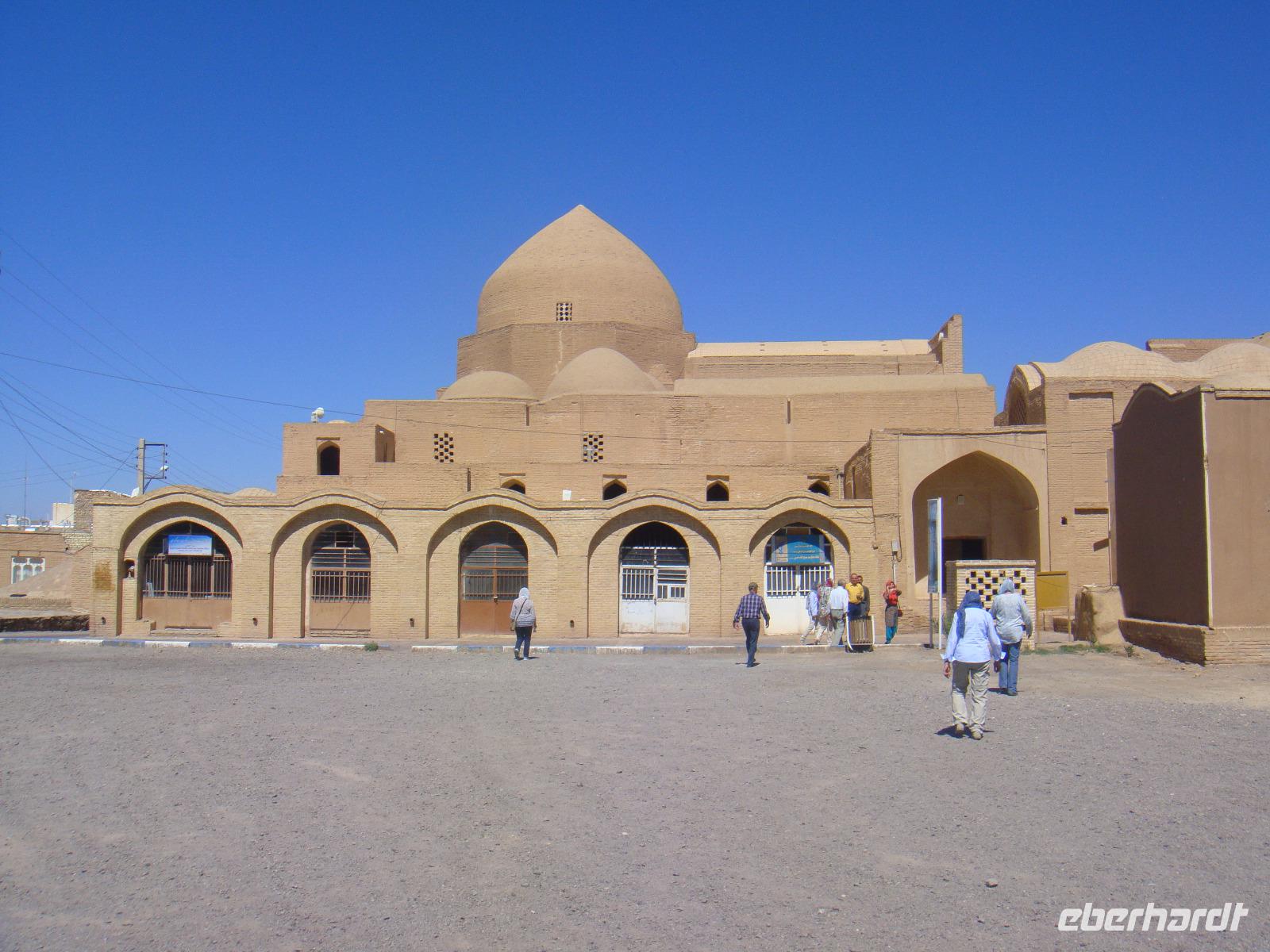 Die Sonne strahlt und spendet wohlwollige Wärme. Nach dem Frühstück begeben wir uns auf die Schnellstraße in Richtung Yazd. Heute liegen ca. 350 Km vor uns. Unsere Fahrt führt uns über Ardestan. Hier besuchen wir die Freitags-Moschee von Adestan und freuen uns über diese Fahrtpause. Es geht weiter nach Meybod. Dieser Ort zählt bereits zur Province Yazd. Simin führt uns hier zu einer imposanten Zitadelle, welche aus dem 14. Jh. Bewohnt wurde diese bis Anfang des 20. Jh. Für unser Picknick finden wir heute einen Platz in der der Nähe einer Karawanserei in Meybod. Hier stärken wir uns und vertreten uns vor der Weiterfahrt noch etwas die Füße. In Yazd angekommen halten wir für einen kurzen Stopp auf dem Chaqmaq Platz. Unser nächster Besuch ist die Jame-Moschee. Diese Moschee aus dem 12. Jh. stammend ist eine der größten Versammlungsmoscheen. Anschließend bummeln wir durch die Gassen der Altstadt von Yazd. Eine wirklich schöne Stadt. Unser letzter Stopp gilt dem zoroastrischen Feuertempel. Sein Feuer im Inneren stammt von einem anderen Ort und soll bereits seit 1500 Jahren brennen. Diese ewige ist das Symbol für die Anwesenheit Gottes, da Feuer, Wasser, Luft und Erde den Zoroastriern heilig sind. Wir verabschieden uns vom Feuertempel und fahren zu unserem heutigen Hotel. Dabei kommen wir in den Genuss den Amir Chaqmaq Platz im Abendlicht zu bewundern. Hier konnten wir den fantastischen, mit Minaretten bestückten Arkadenbau bei warmem Abendlicht bewundern. Auch nach Eintritt der Dunkelheit verlor er durch die effektvolle Beleuchtung nichts von seiner Faszination. Am Rand des Platzes steht ein Nakhl, ein riesiges Holzgerüst, welches vor dem Ashura-Trauerfest mit schwarzen Tüchern behängt wird. Die Männer tragen es während der Prozessionen auf ihren Schultern. Schließlich erreichen wir unser Hotel und nach dem Abendessen geht ein weiterer toller Tag zu Ende.