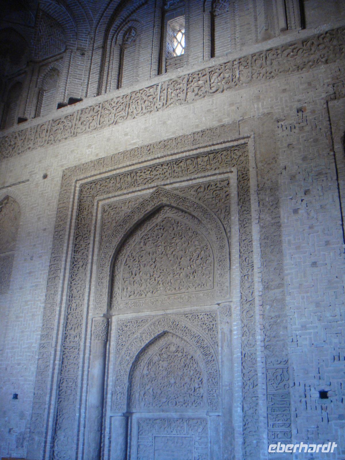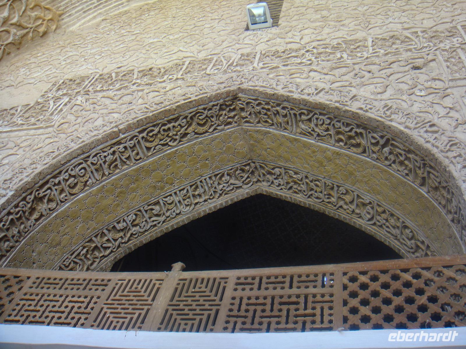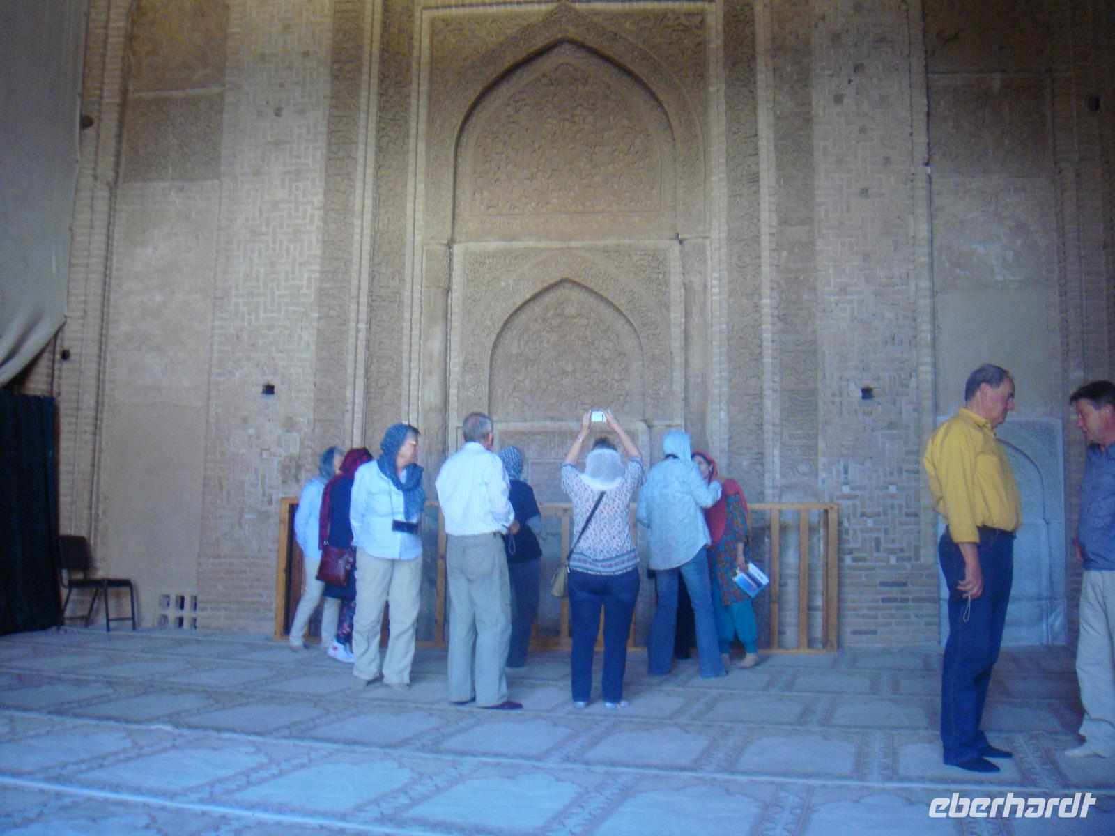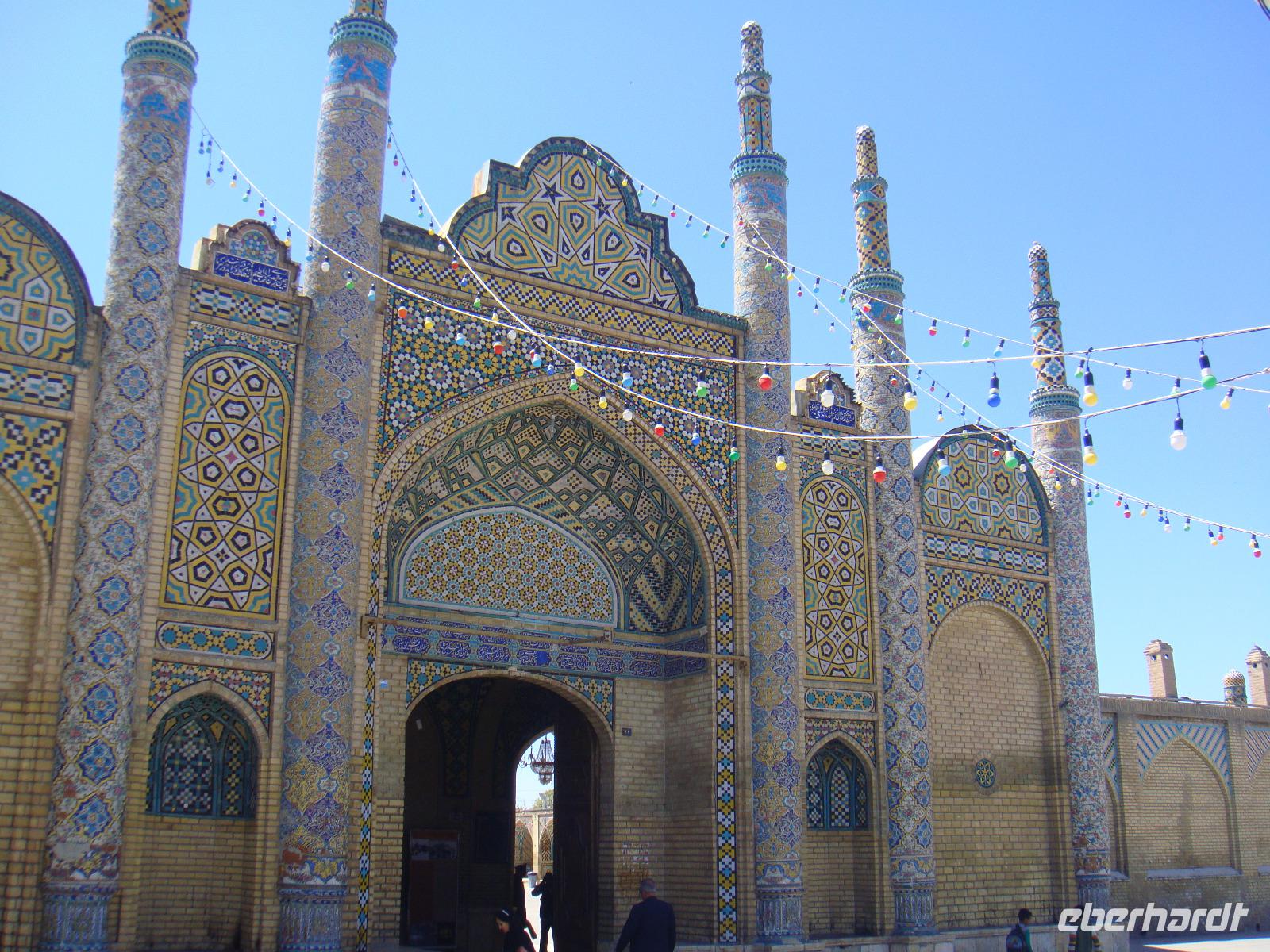 Die Sonne strahlt und spendet wohlwollige Wärme. Nach dem Frühstück begeben wir uns auf die Schnellstraße in Richtung Yazd. Heute liegen ca. 350 Km vor uns. Unsere Fahrt führt uns über Ardestan. Hier besuchen wir die Freitags-Moschee von Adestan und freuen uns über diese Fahrtpause. Es geht weiter nach Meybod. Dieser Ort zählt bereits zur Province Yazd. Simin führt uns hier zu einer imposanten Zitadelle, welche aus dem 14. Jh. Bewohnt wurde diese bis Anfang des 20. Jh. Für unser Picknick finden wir heute einen Platz in der der Nähe einer Karawanserei in Meybod. Hier stärken wir uns und vertreten uns vor der Weiterfahrt noch etwas die Füße. In Yazd angekommen halten wir für einen kurzen Stopp auf dem Chaqmaq Platz. Unser nächster Besuch ist die Jame-Moschee. Diese Moschee aus dem 12. Jh. stammend ist eine der größten Versammlungsmoscheen. Anschließend bummeln wir durch die Gassen der Altstadt von Yazd. Eine wirklich schöne Stadt. Unser letzter Stopp gilt dem zoroastrischen Feuertempel. Sein Feuer im Inneren stammt von einem anderen Ort und soll bereits seit 1500 Jahren brennen. Diese ewige ist das Symbol für die Anwesenheit Gottes, da Feuer, Wasser, Luft und Erde den Zoroastriern heilig sind. Wir verabschieden uns vom Feuertempel und fahren zu unserem heutigen Hotel. Dabei kommen wir in den Genuss den Amir Chaqmaq Platz im Abendlicht zu bewundern. Hier konnten wir den fantastischen, mit Minaretten bestückten Arkadenbau bei warmem Abendlicht bewundern. Auch nach Eintritt der Dunkelheit verlor er durch die effektvolle Beleuchtung nichts von seiner Faszination. Am Rand des Platzes steht ein Nakhl, ein riesiges Holzgerüst, welches vor dem Ashura-Trauerfest mit schwarzen Tüchern behängt wird. Die Männer tragen es während der Prozessionen auf ihren Schultern. Schließlich erreichen wir unser Hotel und nach dem Abendessen geht ein weiterer toller Tag zu Ende.
