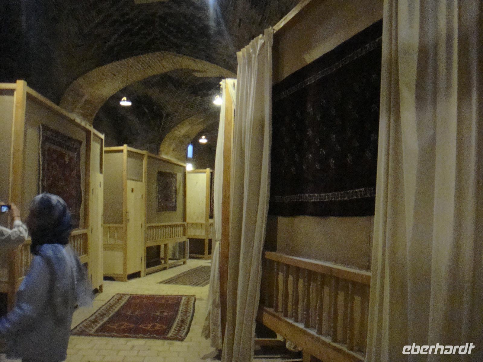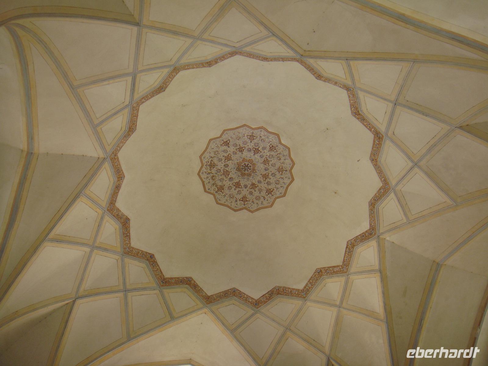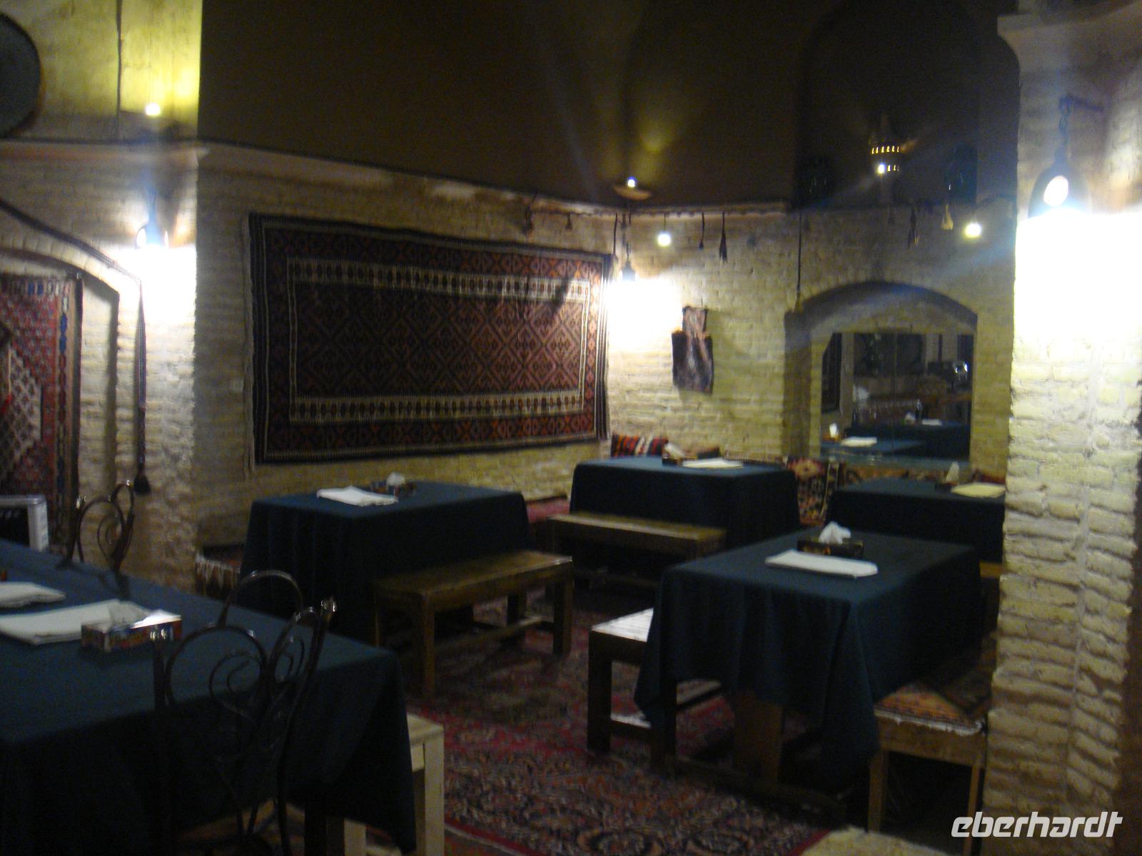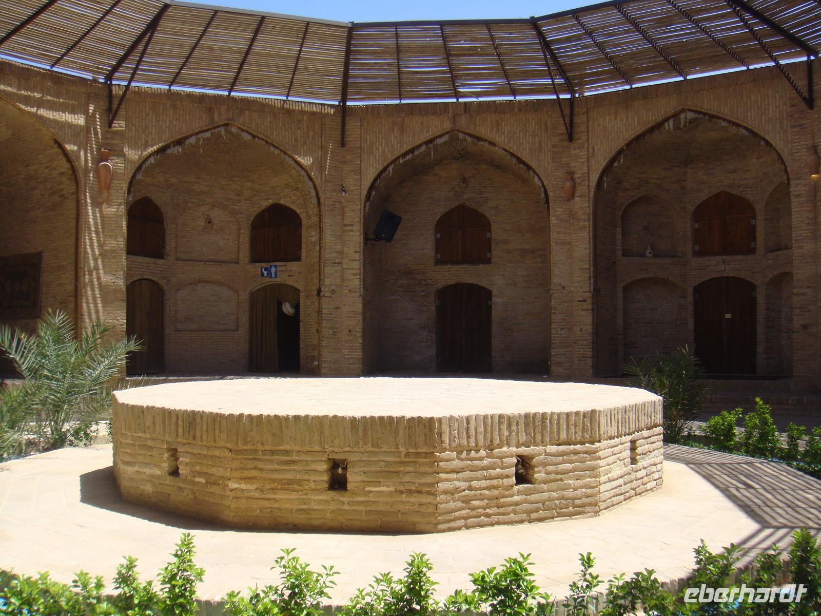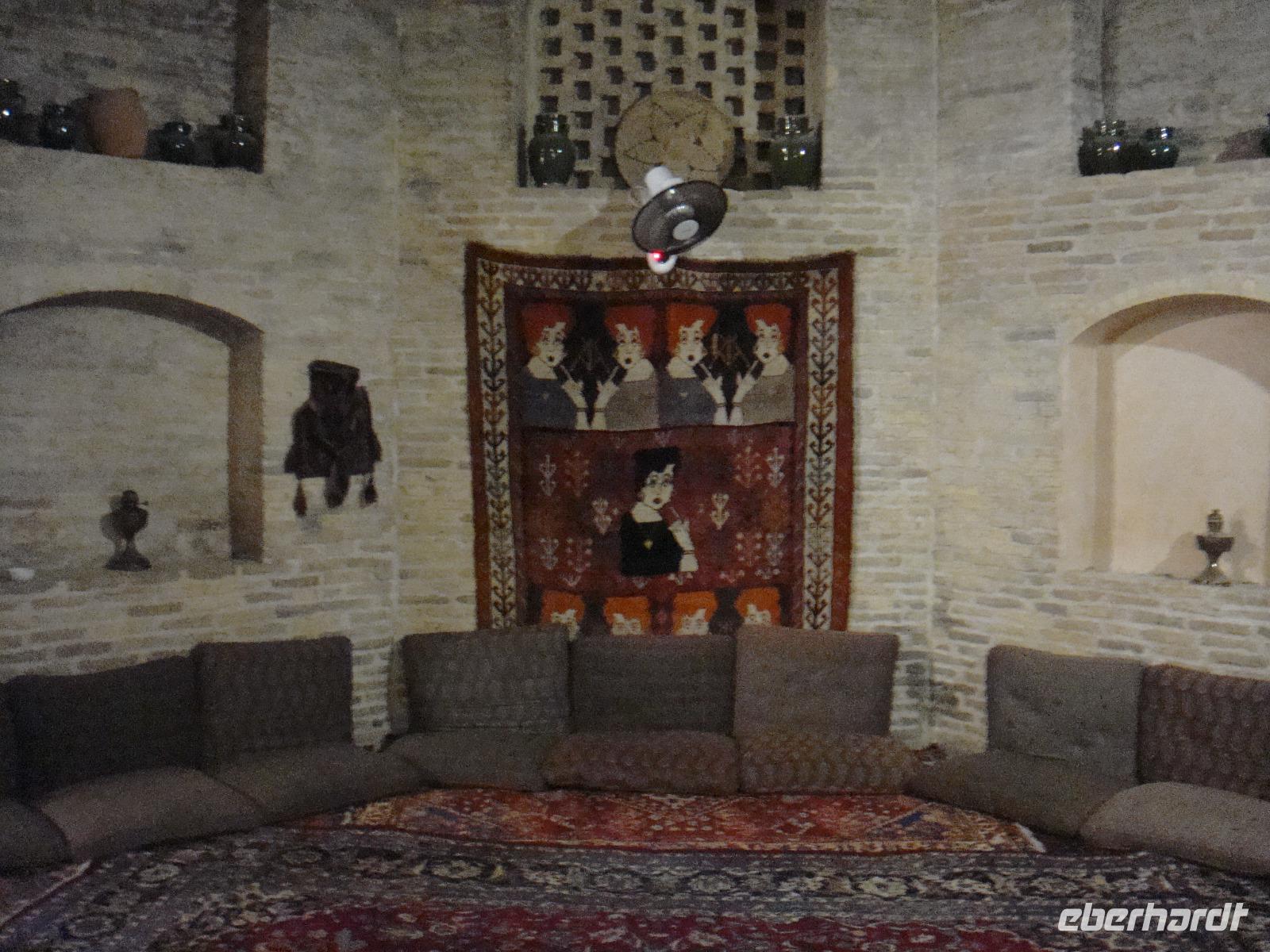 Neuer Tag, neue Abendteuer. Nach dem gemütlichen Frühstück starten wir durch. Mit der Genehmigung in der Hand fahren wir zur Altstadt von Kerman. Wir besuchen ein altes Haman und bummeln anschließend über den Bazar. Kerman ist auch eine Stadt der Kupferkünste wie wir überall sehen können. Nach dem Besuch einer kleinen Mosche begeben wir uns zu einer Tee-Pause in ein wunderschönes Teehaus. Dies war ursprünglich ein Haman und während wir unseren Tee genießen lauschen wir typischer Musik. Anschließend unternehmen einen Ausflug in das Oasenstädtchen Mahan. Nach nur 35 Km erreichen wir Mahan und besichtigen das Grab Shah Namathullah Valis. Es handelt sich hier um die Grabstätte eines persischen Dichters. Besichtigungen machen hungrig und wir machen unser Picknick. Am Nachmittag geht es zum Schahzadeh-Garten (Prinzengarten) und wieder sind wir beeindruckt von einer weiteren schönen Gartenanlage. Der 5,5 ha große Garten wu Der Kadscharenprinz Mohammad Hasan Khan Katschar Sardari Iravani hatte hier ca. 5,5 h Gartenfläche anlegen. Damals fanden hier viele Gedenkfeiern statt und heute werden Teile des Schlosses als Restaurant genutzt. So kommen auch wir in den Genuss eines tollen Cafee´s. Wir begeben uns auf den Rückweg und gehen zum Abendessen. Heute in einem anderen aber auch sehr leckerem Lokal.
