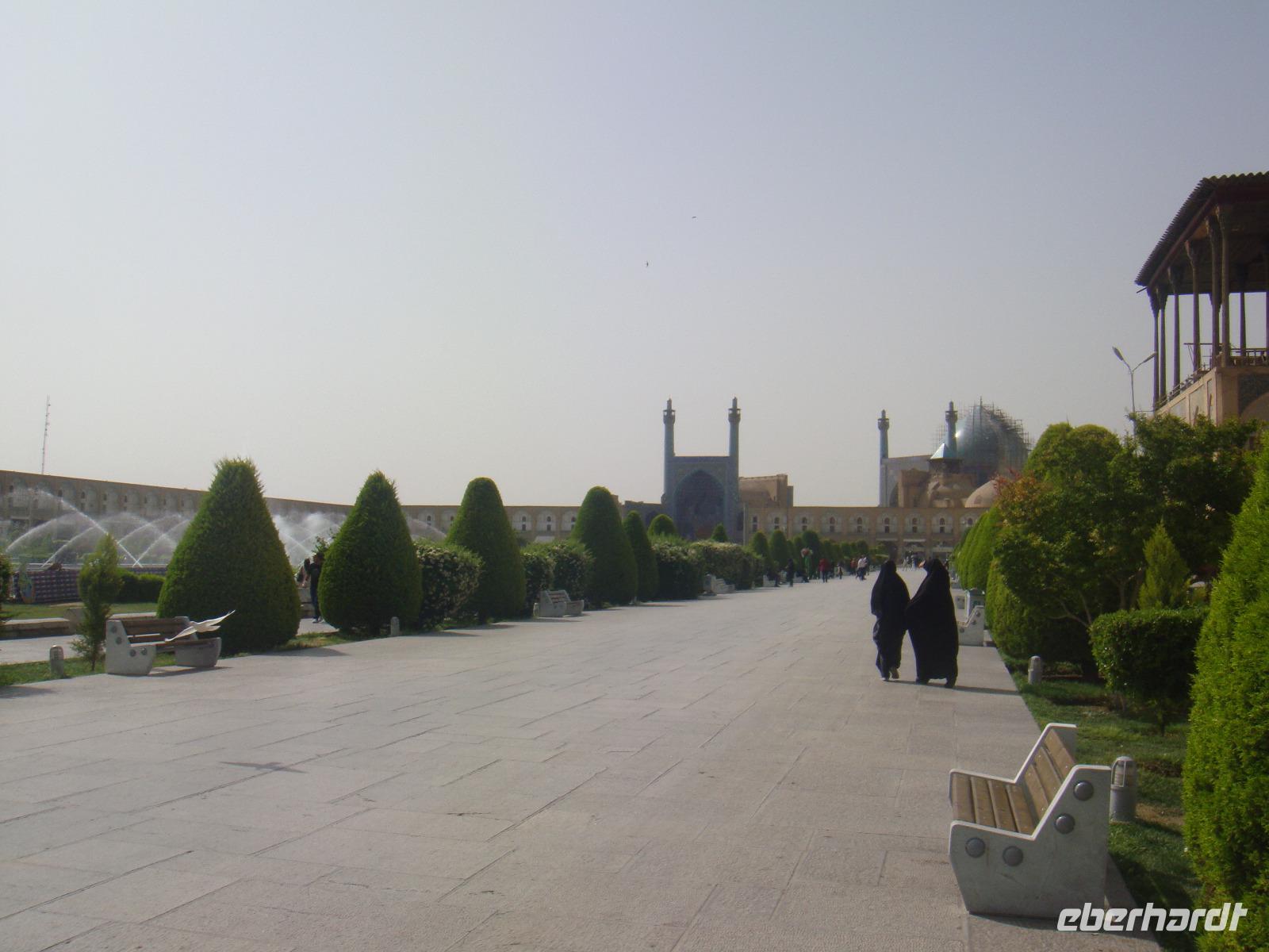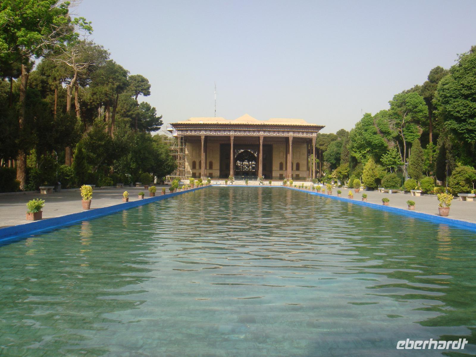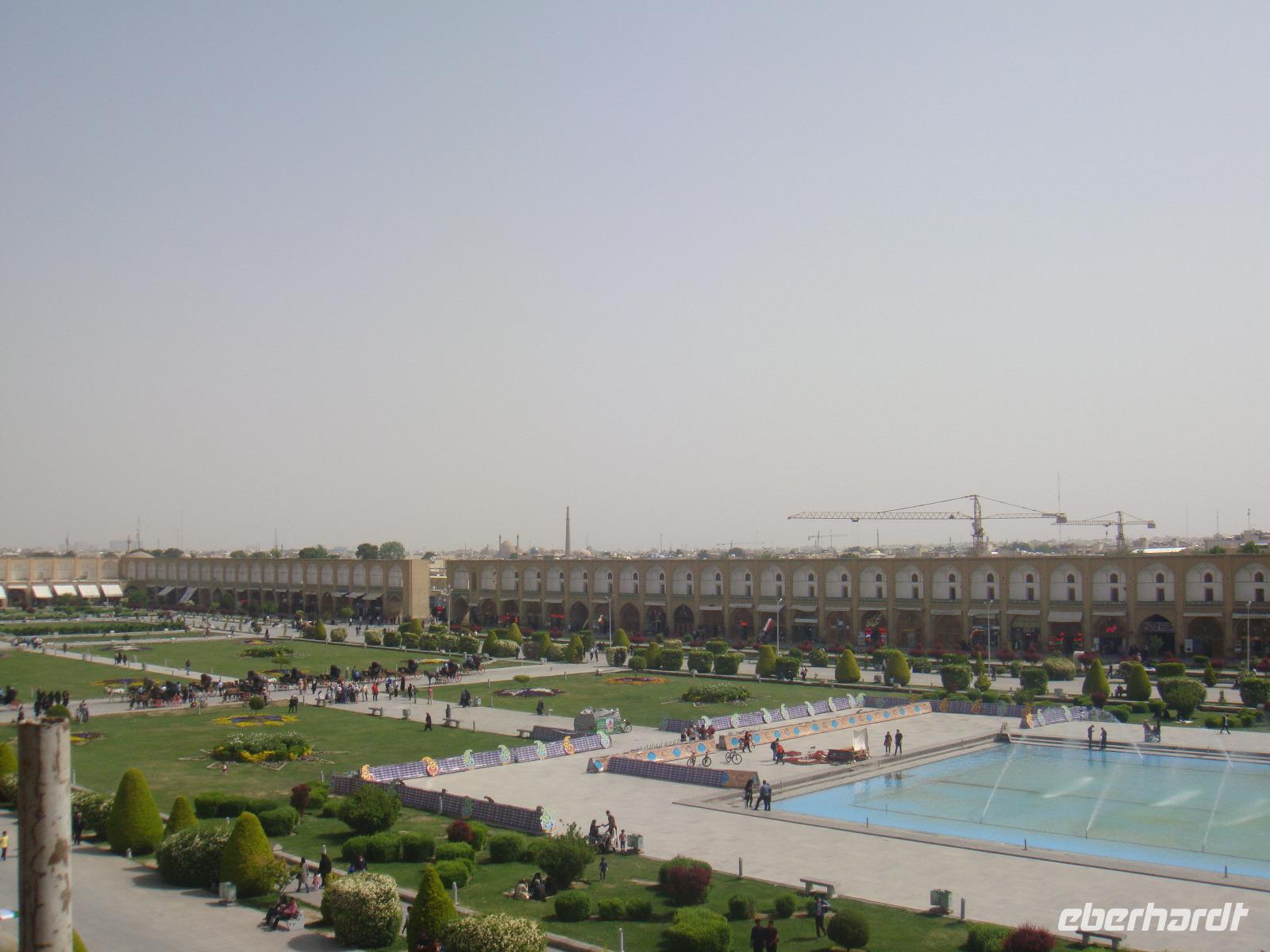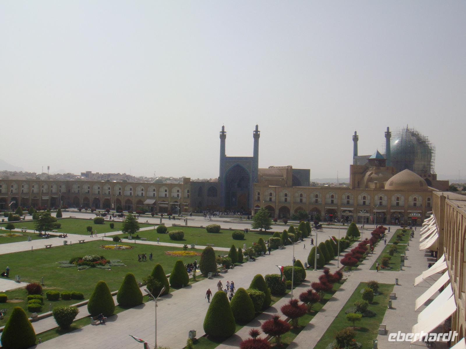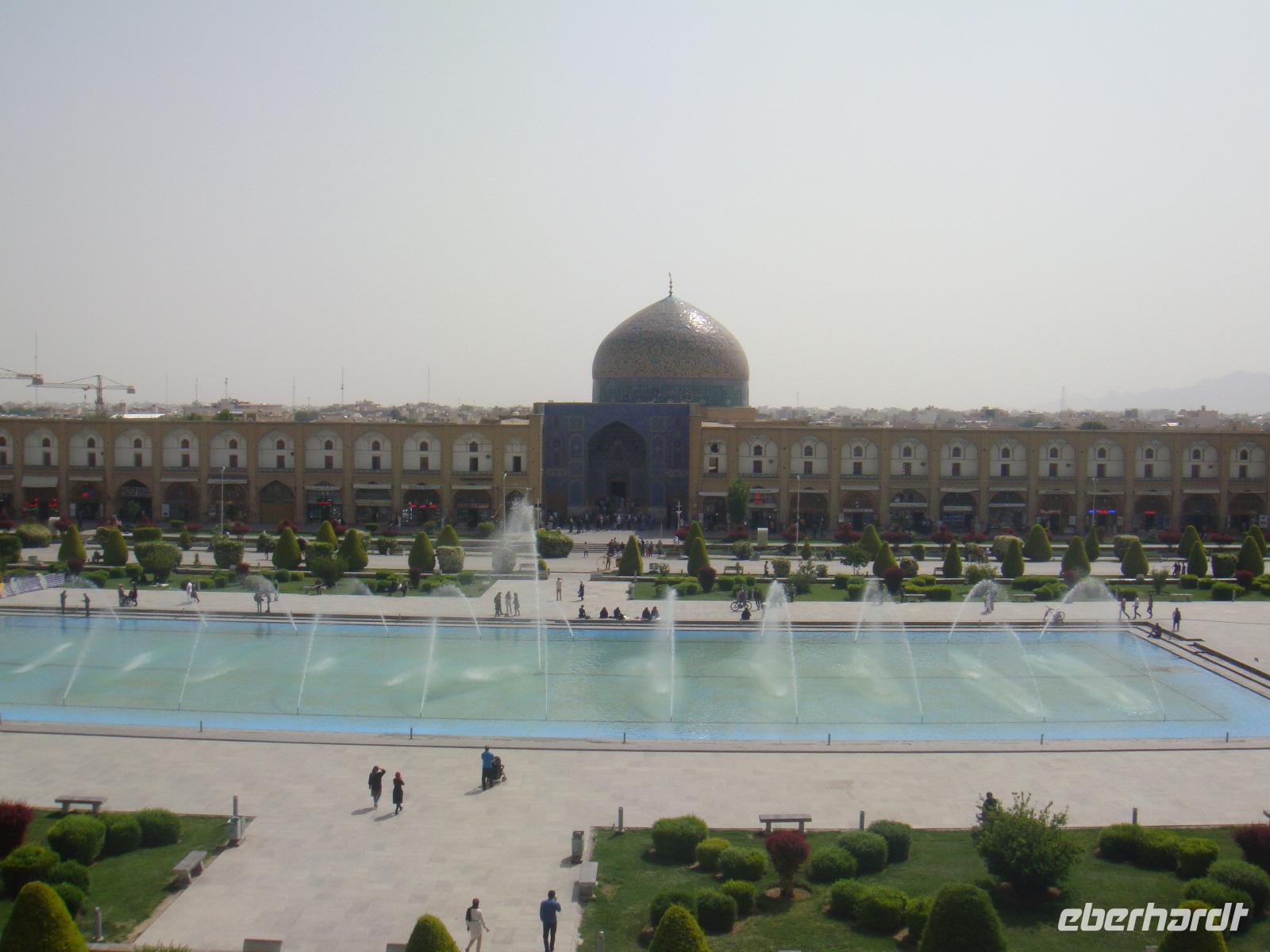 Den letzten Tag unserer Reise genießen wir in vollen Zügen. Die Stadt hat ein sehr anziehendes Stadtbild, sie ist sehr sauber und es gibt viele Grünanlagen. Zunächst besuchen wir den Palast der 40 Säulen. Mit einer großen Gartenanlage mit einem langgezogenen Wasserbecken, an dessen Ende sich ein gewaltiger Palast erhebt ist sehr beeindruckend. Das Dach des Palastes wird von zwanzig Säulen aus Zedernholz gestützt. Die Verdopplung der Säulen durch die Spiegelung im Wasserbecken gab dem Palast seinen Namen (40-Säulen-Palast). Im Inneren des Palastes sind die Wände mit Gemälden von politischen Ereignissen des 16.-18. Jahrhunderts geschmückt. Unweit vom 40-Säulen-Palast befindet sich der Maydan-e Naqsh-e Jahan-Platz bzw. auch Imam-Platz, dem Abbild der Welt. Er zählt zu den schönsten Plätzen der Welt. Wir besichtigen die 2 angrenzend stehenden Moscheen, die Lotfullah-Moschee (Privatmoschee der safawidischen Königsfamilien) und die Imam-Moschee. Interessant war der Besuch einer Tischdecken-Druckerei, in der die Muster per Hand auf die Baumwolle gestempelt werden. Von einer gewaltigen Veranda im 3. Stock kann man den gesamten Imam-Platz fantastisch überschauen. Leider stand uns aufgrund von Bauarbeiten nicht die gesamte Fläche zur Verfügung, aber selbst vom zugänglichen Teil gelangen uns einmalige Fotoaufnahmen. Anschließend bummelten wir über den prächtigen Bazar. Nun sind die letzten Einkäufe getätigt und Simin lädt zu einem köstlichem Safran Eis ein. Zum Abschluss fährt Sie noch mit uns in das jüdische Viertel. Es geht zurück zum Hotel und wir erleben in Hotel Restaurant mit einem herrlichem Panoramablick einen schönen Abschluss der. Nun heißt es Kofferpacken und fertig machen für den Abflug.