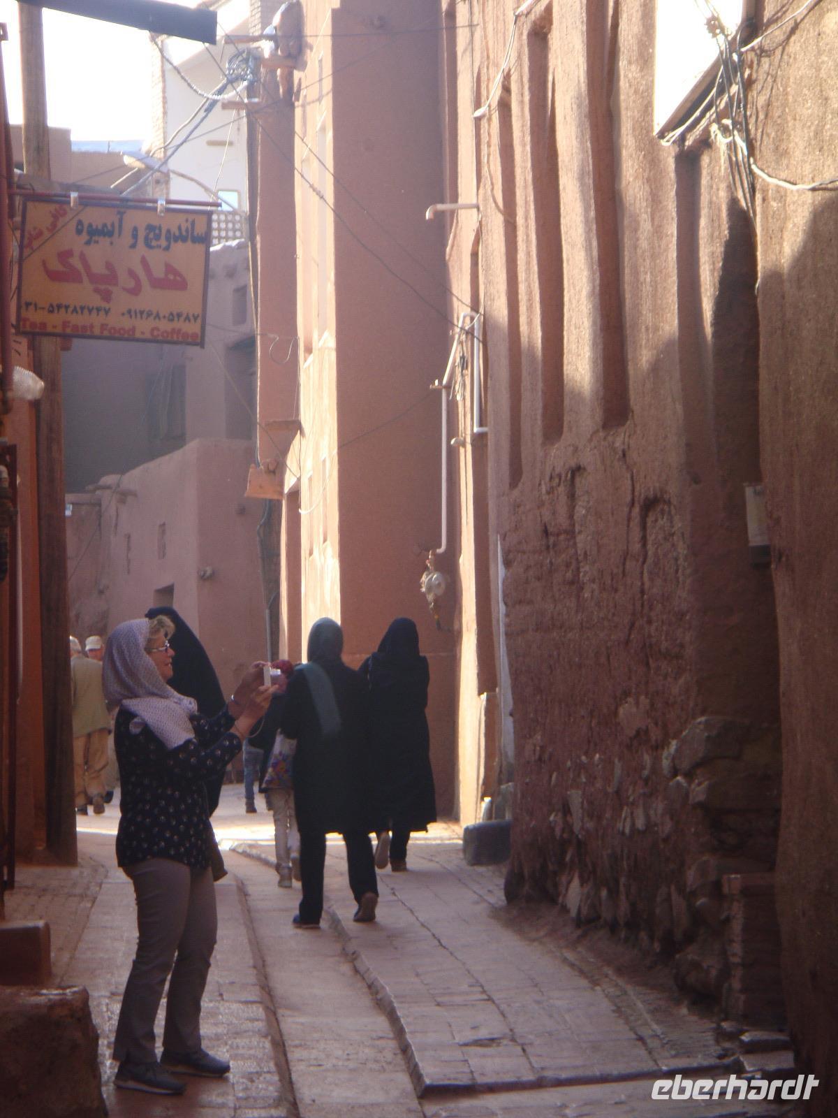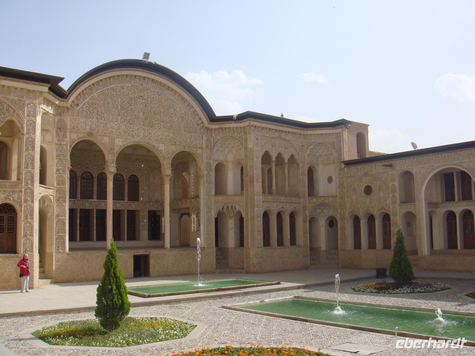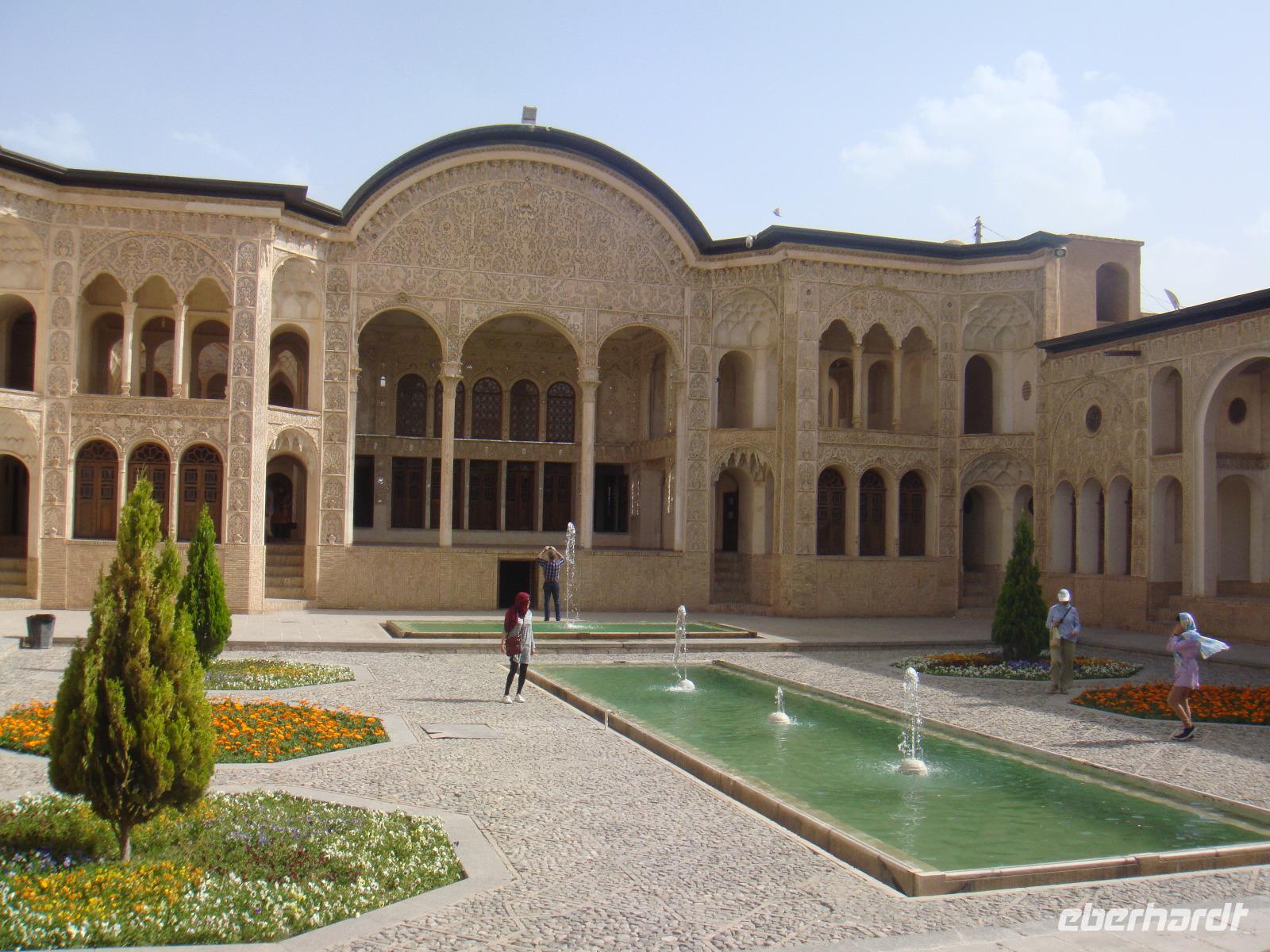 Heute liegt ein langer Tag mit ca. 570 Km vor uns. Von Hamadan aus fuhren wir auf der Autobahn in östliche Richtung nach Qom und von dort weiter nach Kashan. Am Nachmittag erreichten wir die Stadt und besuchten als erstes das Borujerdi-Haus. Wie überall im Orient sieht man von außen nicht, welche Pracht sich im Inneren verbirgt. Der Gebäudekomplex war und ist in einen öffentlichen, für Besucher zugänglichen Bereich und in einen privaten Bereich aufgeteilt. Im Innenhof spiegelt sich die Fassade in einem großen Wasserbassin. Nach diesem Besuch stärken wir uns wieder bei einem fürstlichen Picknick- Anschließend geht es zum Fin-Garten. Er ist vermutlich der älteste persische Garten und seine Existenz geht bis auf die achämenidische Zeit zurück. In diesem paradiesischen Garten hat sich auch eine Tragödie abgespielt. Auf Veranlassung des Shahs Nasseruddin wurde hier im Jahre 1852 der Premierminister Amir Kabir ermordet, da er sich als beliebter Politiker gegen den Ausverkauf Persiens eingesetzt hatte. Trotz dieser Geschichte fühlen wir uns in diesem Garten sehr wohl und wandeln gemütlich hindurch. Weiter geht es in Richtung Abyaneh und wir besuchen eines der alten Häuser aus dem 16. Jh. Nach kurzen Erläuterungen erkunden wir das Areal dieses wunderbaren Anwesens und nehmen Kurs auf das Dorf Abyaneh. Ca. 55 Km von Kaschan entfernt kommen wir über eine Serpentinenstraße in diesem typischen iranischen Dorf an. Wir spazieren durch das wohl älteste Dorf und deren schmalen Gassen und mit den rötlichen Lehmziegelhäusern. Überall treffen wir auf freundliche Menschen. In ihren für diesen Ort typischen Gewändern. Die Frauen tragen weiße, mit bunten Blumenmustern verzierte Kopftücher und die Männer Pluderhosen. Eine kleine Tee-Pause rundet diesen Besuch ab und wir begeben uns auf unsere letzte Etappe für den heutigen Tag. Am Abend erreichen wir unsere Unterkunft in Matin Abad. Wir beziehen unsere Zimmer in einer sehr schönen Karawanserei und gehen gemeinsam zum Abendessen. Unter sternenklaren Himmel verbringen wir mitten in der Wüste die Nacht.