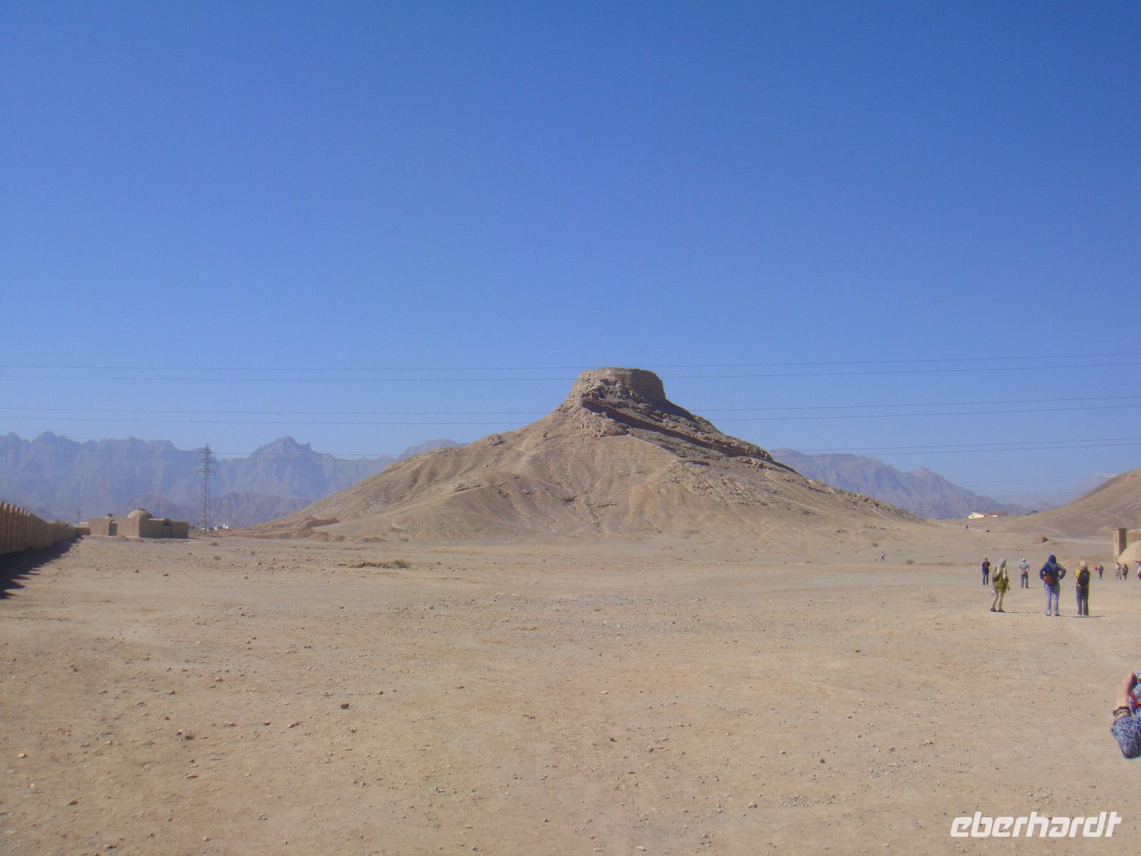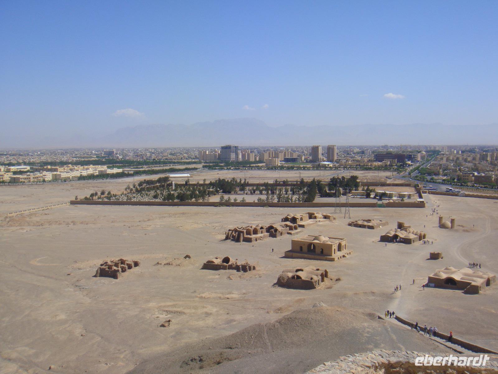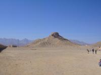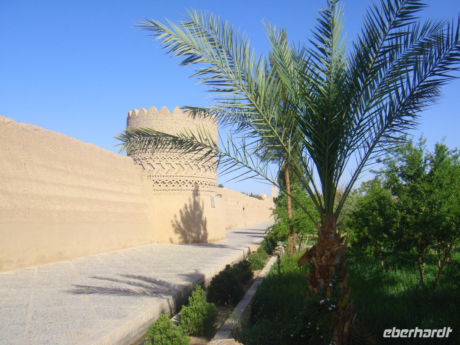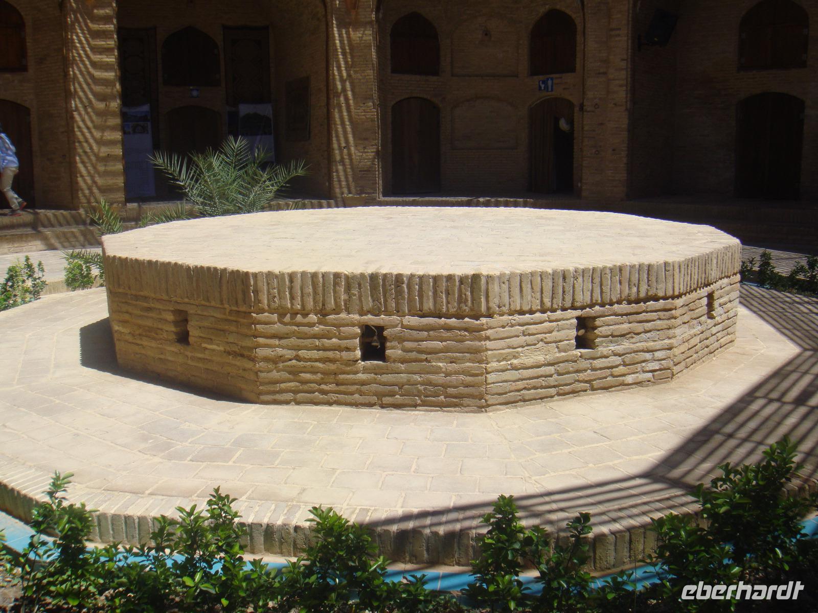 Den heutigen Tag beginnen wir mit dem Besuch des Dowlatabad- Gratens. Wir spazieren durch diese riesig ausgedehnte Gartenanlage mit Pavillon und Windturm. Das Zentrum der Anlage bildet wieder ein langes flaches Wasserbassin, an dem uns Simin die Funktionsweise des Zu- und Abflusses demonstrierte. Im Pavillon konnten wir anschaulich verfolgen, wie die Luftzirkulation in den Windtürmen zur Kühlung und Entlüftung funktioniert. Es wird etwas zügig. Vom Garten geht es direkt zu den „Türmen des Schweigens". Die Türme sind zwei auf Bergkuppen errichtete, ummauerte Heiligtümer am Stadtrand von Yazd. Da die Erde, das Feuer und das Wasser den Anhängern Zarathustras heilig sind, dürfen auch ihre Verstorbenen damit nicht in Berührung kommen. Man brachte sie nach der rituellen Waschung auf die Plattformen der Türme und überließ sie dort den Geiern. Nach einigen Tagen wurden die Knochen eingesammelt, gereinigt und in Öl gesalbten Krügen aufbewahrt. Nun nehmen wir unsere Fahrt weiter in Richtung Kerman auf. Unterwegs sehen Qanate, die seit Jahrhunderten die Wasserversorgung der Wüstenstädte über hunderte Kilometer sicherstellen. Viele dieser Anlagen werden auch heute noch genutzt, obwohl Wasserpumpen und moderne Wasserleitungen die historischen Anlagen immer mehr ersetzen. Simin bietet uns auch die Möglichkeit so etwas zu besichtigen. Am Nachmittag kommen wir in Kerman an. Wir beziehen unsere Zimmer und haben bis zum Abendessen noch etwas Zeit für die Erholung. Am Abend fahren wir zum Essen in einem kleinen Lokal in der Stadt. Wir sitzen draußen und lassen es uns schmecken. Gleich neben dem Restaurant befindet sich ein Süßwarenladen. Vor unserer Rückfahrt zum Hotel wird dieser von uns natürlich besucht. Glücklich und zufrieden kommen wir im Hotel an.