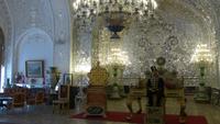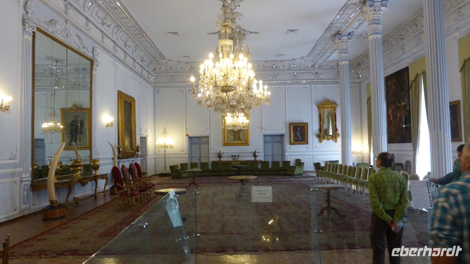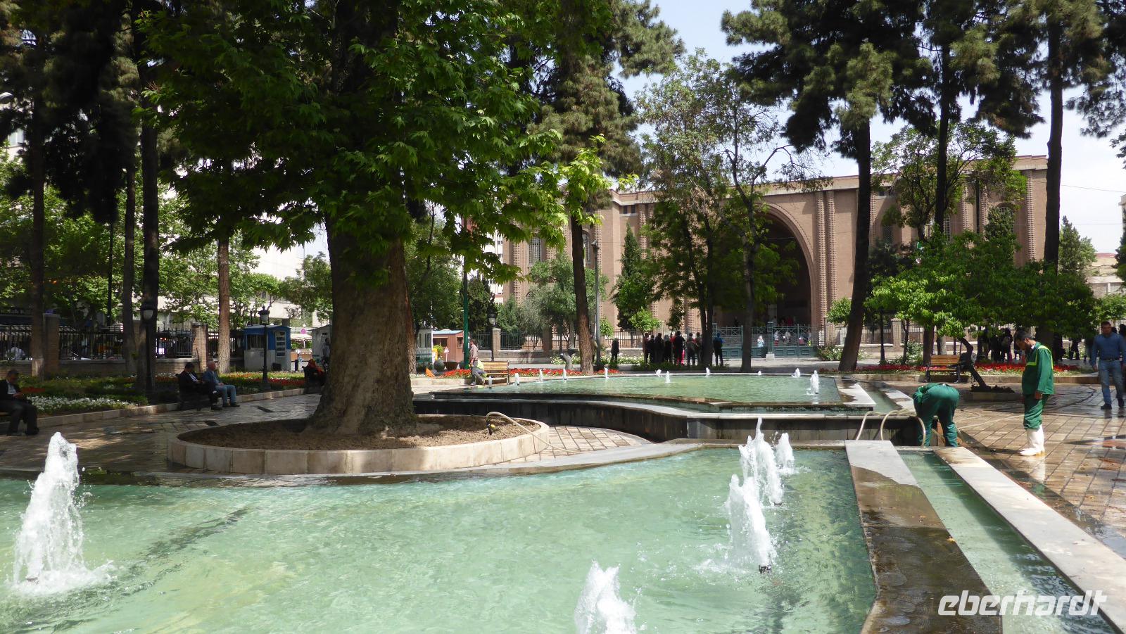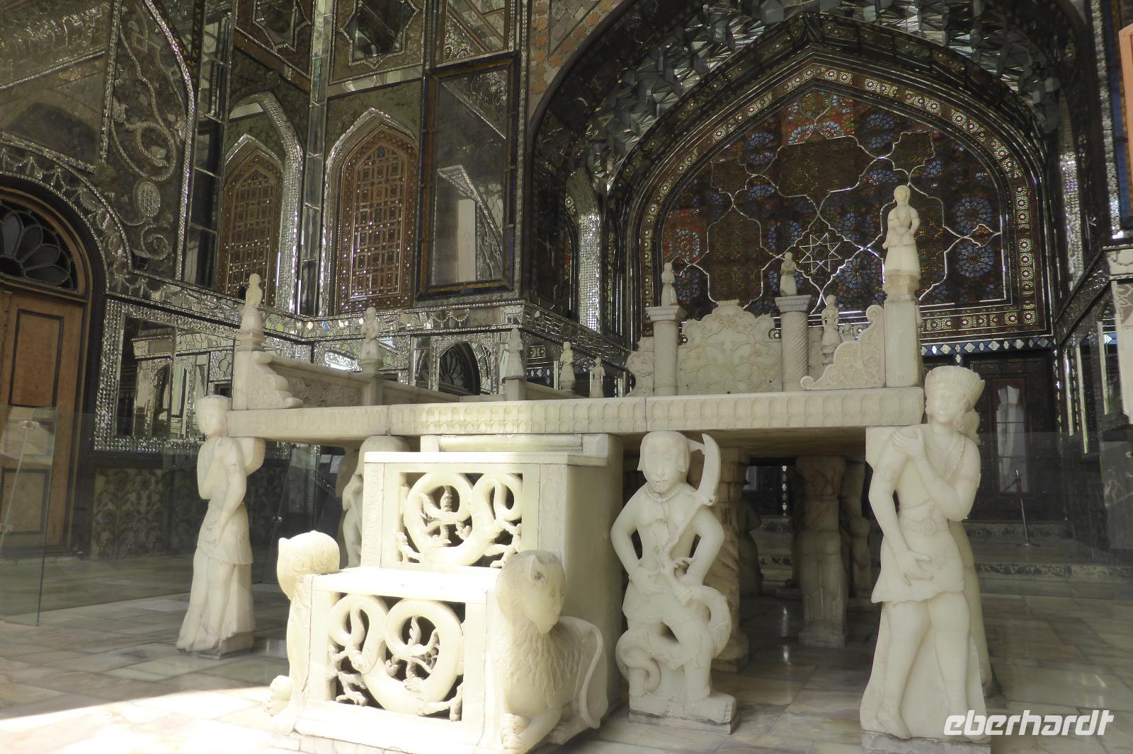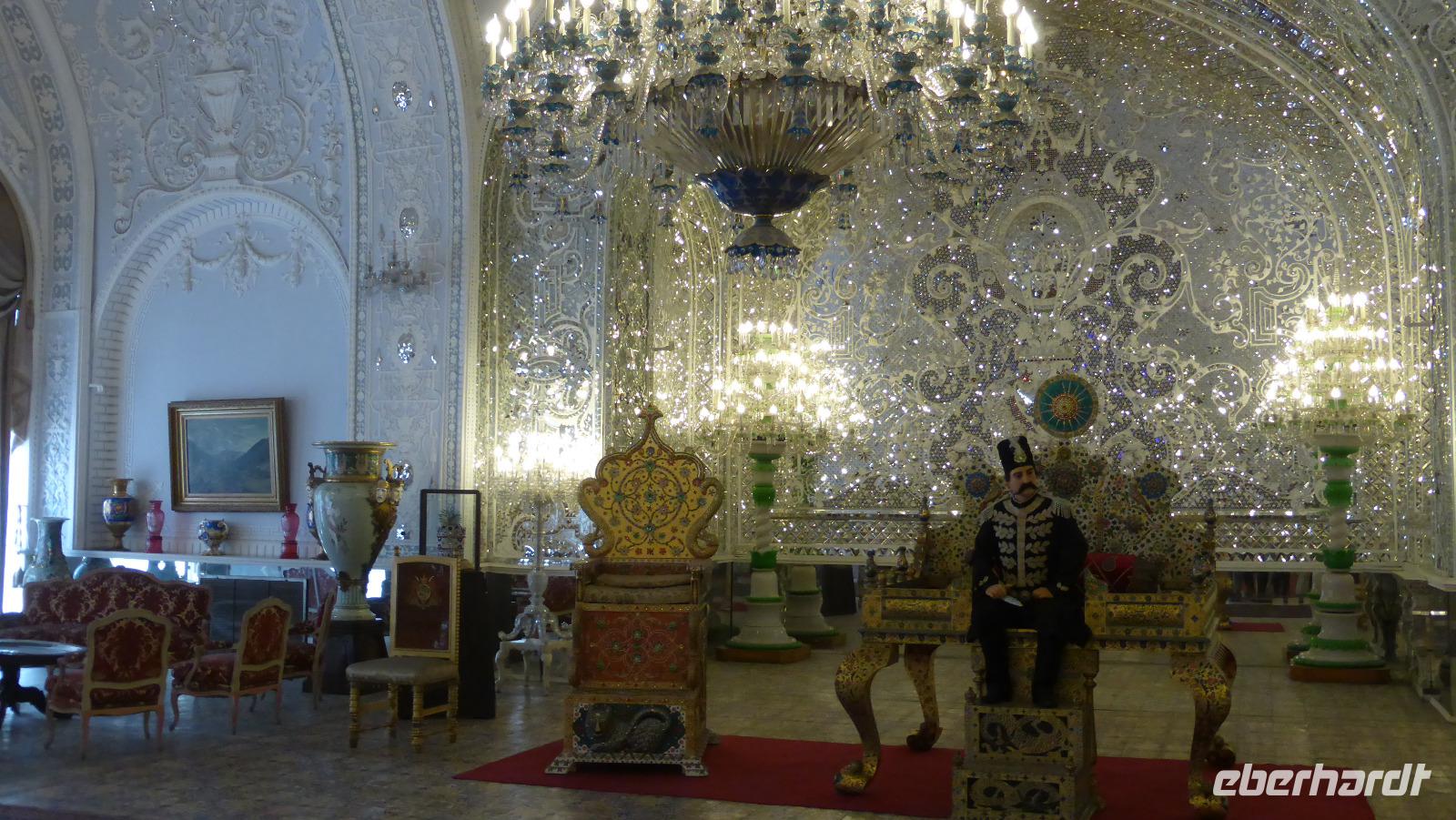 Inzwischen ist es sonnig und angenehm warm, passendes Wetter für den Besuch des Golestan-Palastes mit seinem großen Garten. In der weitläufigen Anlage besichtigen wir den Marmorthronsaal mit einem Thron aus Alabaster, das Grab von Naser ad-Din Schah, den Empfangspalast mit Elfenbeinsaal, Spiegel- und Krönungssaal. Im Talar salam, so heißt der Krönungssaal, fand 1967 die berühmte Krönung Farah Dibas zur Kaiserin und die Selbstkrönung des Schahs Mohammad Reza Pahlavi zum „Schah-in-Schah" statt. Im Garten des Golestan-Palastes nutzen wir das schöne Wetter für eine Kaffeepause. Ein Kaffee kostet mit Steuern 178.000 Rial. Wenn man diesen Preis durch 40.000 teilt, hat man den Europreis