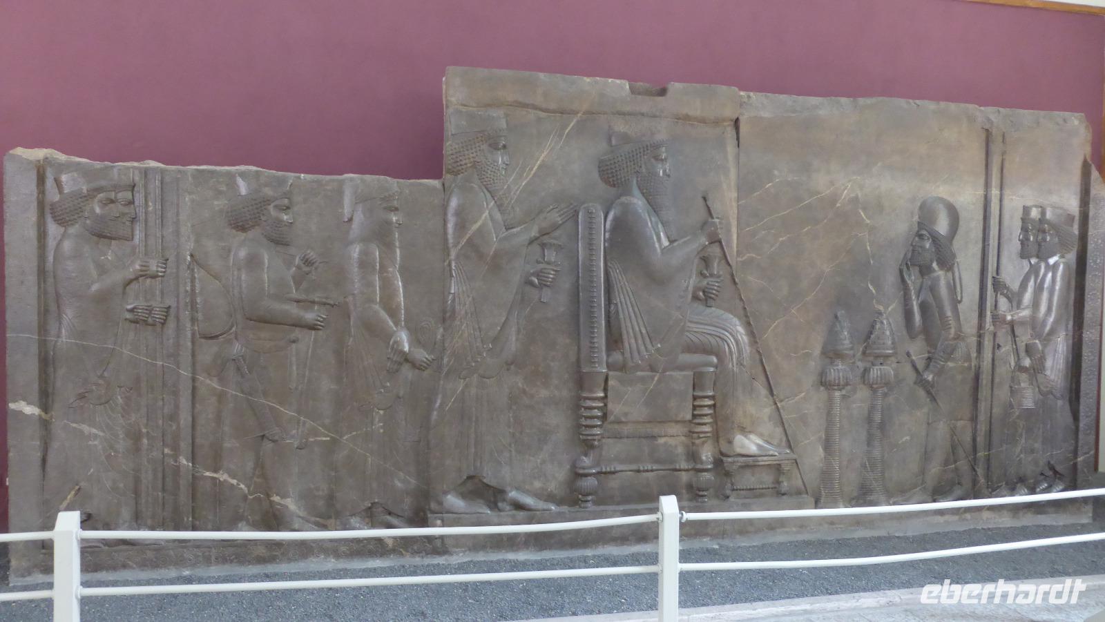 Bergab in die Stadt hinein arbeitet sich unser Bus durch den dichten Verkehr bis zum Nationalmuseum vor. Hier erläutert uns unser iranischer Reiseleiter Hamid die interessantesten Exponate aus der persischen Hochkultur. Zu den wertvollsten Ausstellungsstücken zählen das Thronrelief mit König Dareios aus dem Schatzhaus von Persepolis und die Dareios-Statue aus Susa.