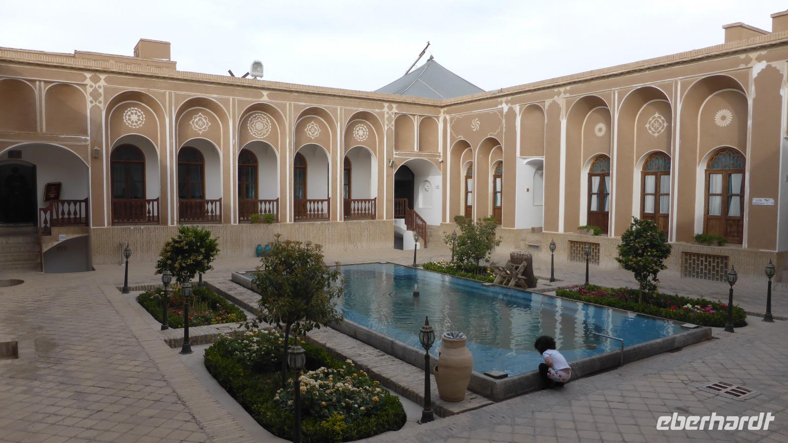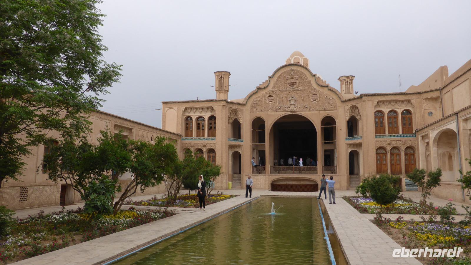 Nach einer Kaffee-/Teepause erreichen wir mittags Kashan, die Stadt der Kacheln, welche ihr den Namen gaben. Wir halten am Fin-Garten. Das iranische Hochland ist geprägt von Steppen und Wüsten. Das Wunderbarste was sich ein Bewohner hier erträumen konnte, war etwas Grünes, ein Schatten spendender, wasserdurchfluteter Ort - ein Garten. Und so entstanden im Iran viele wunderschöne Gartenanlagen wie zum Beispiel hier in Kashan.