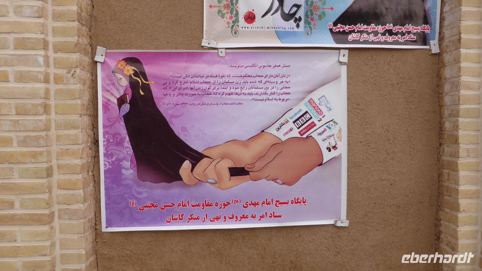 Nach unserer Mittagspause begeben wir uns in Kashans Altstadt. Im historischen Boroujerdi Haus erläutert uns Hamid die typische Aufteilung des Kaufmannhauses in Empfangs-, Sommer- und Winterräume. Wirkt das Haus außen noch schlicht, so zeigt sich im Innenhof und Empfangsbereich der ganze Reichtum des Kaufmanns. Diesen hat er übrigens mit Waffenhandel im 19. Jhd. erlangt. Die Altstadt ist von Lehmarchitektur geprägt und in den Gassen riecht es nach Rosenöl, welches auch hier produziert wird. An der Moschee fällt uns ein Plakat auf, mit welchem vor dem Einfluss des Westens gewarnt wird (siehe Fotogalerie).