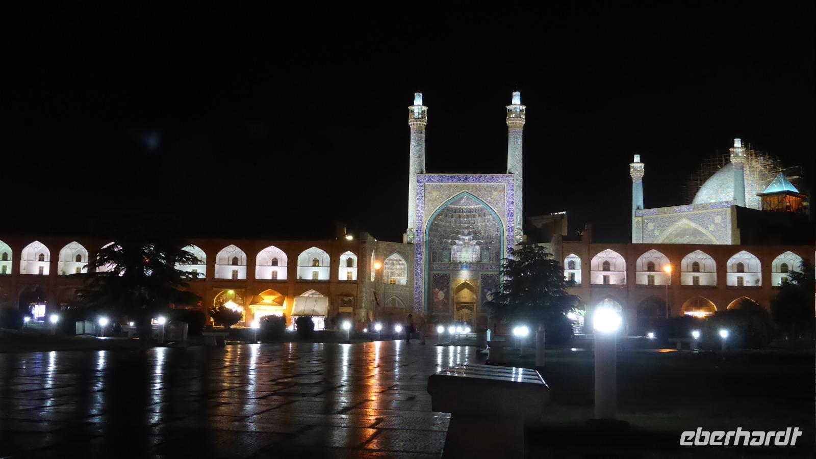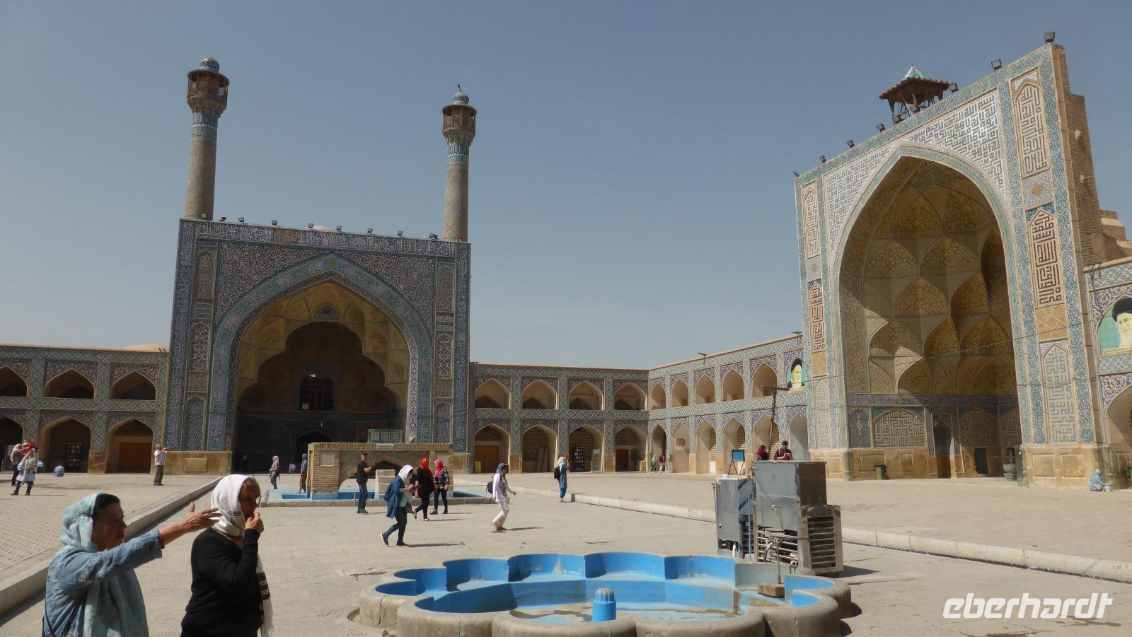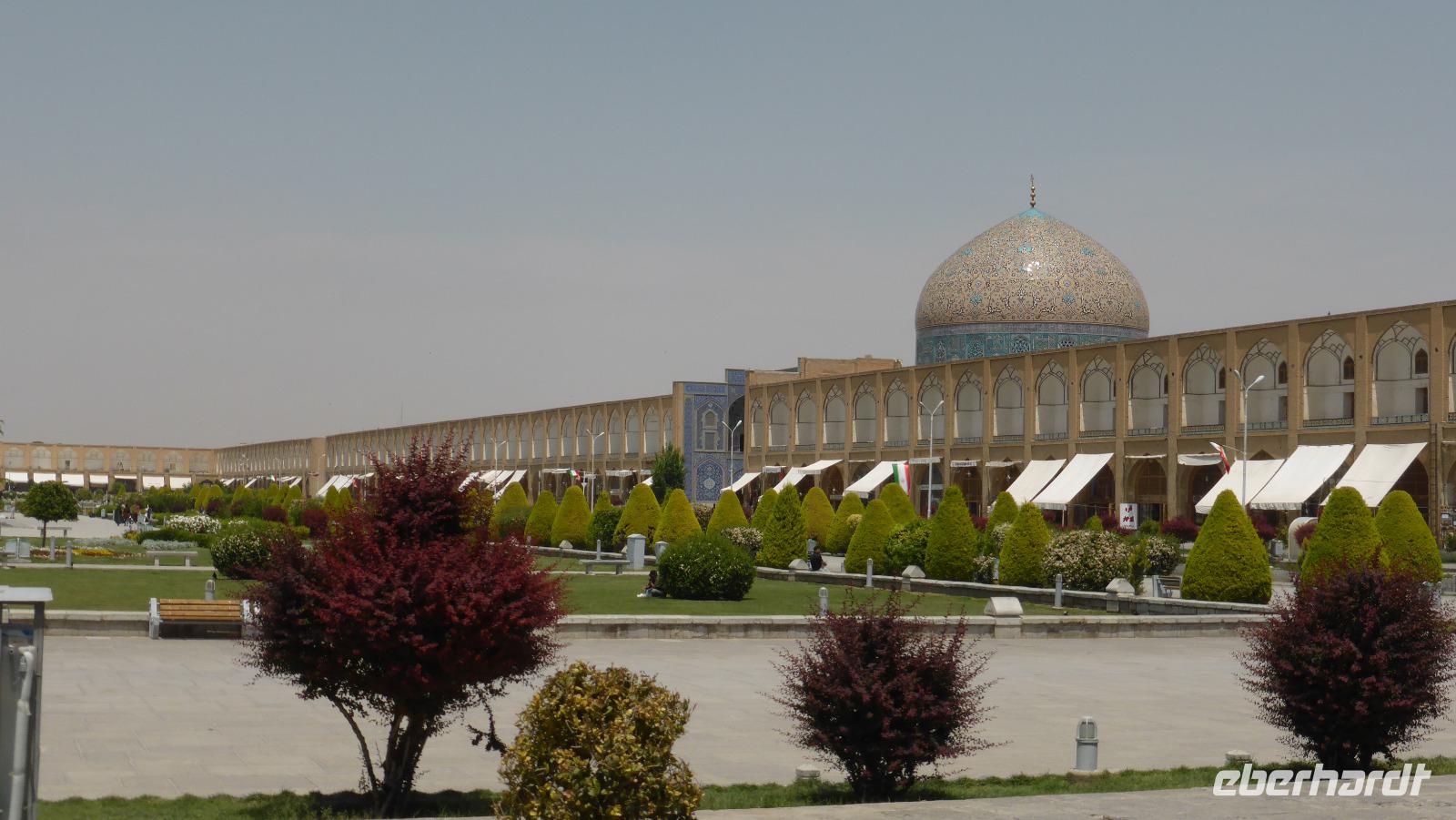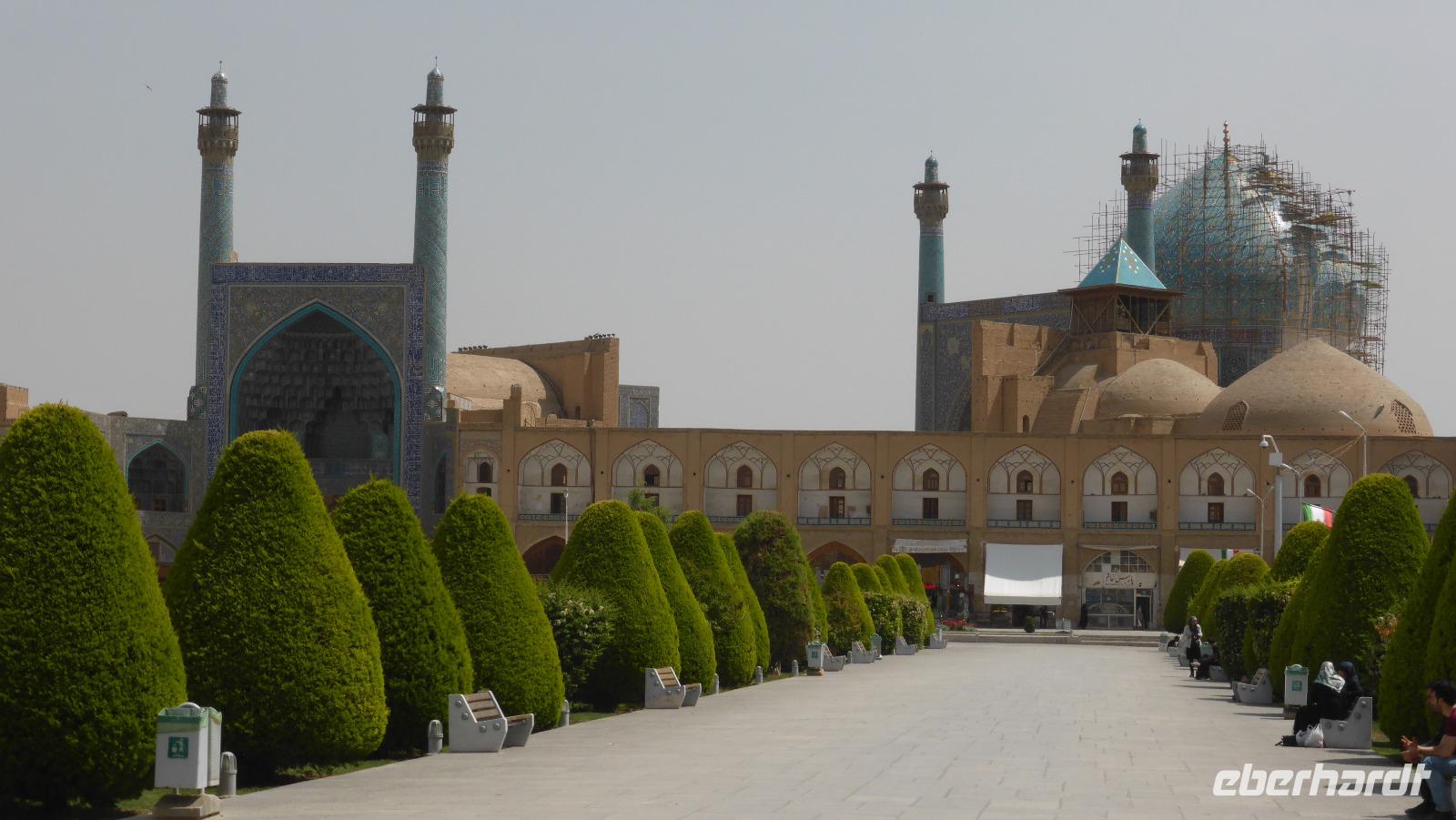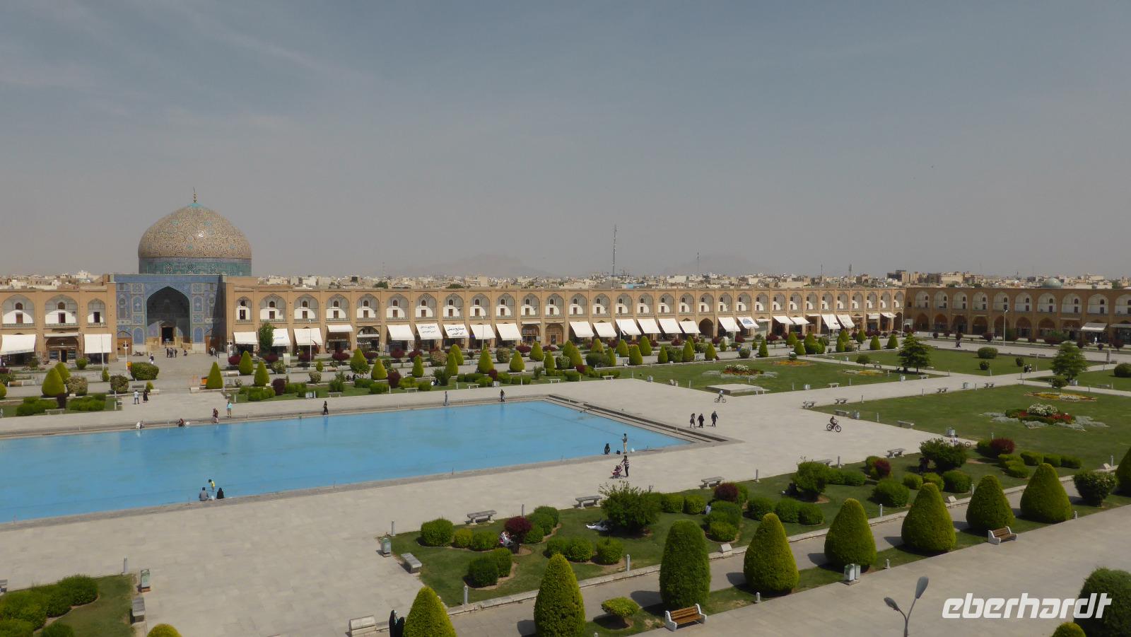 Der zweitgrößte Platz der Welt (UNESCO-Weltkulturerbe) wird von zweistöckigen Arkadengängen umfasst. Dazwischen stechen zwei Moscheen und ein Palast hervor. Wir beginnen mit der Besichtigung der Imam-Moschee. In nur 18 Jahren erbaut, strahlt sie mit ihren azurblauen Kacheln mit dem blauen Himmel um die Wette.
