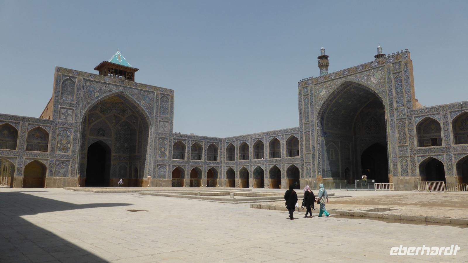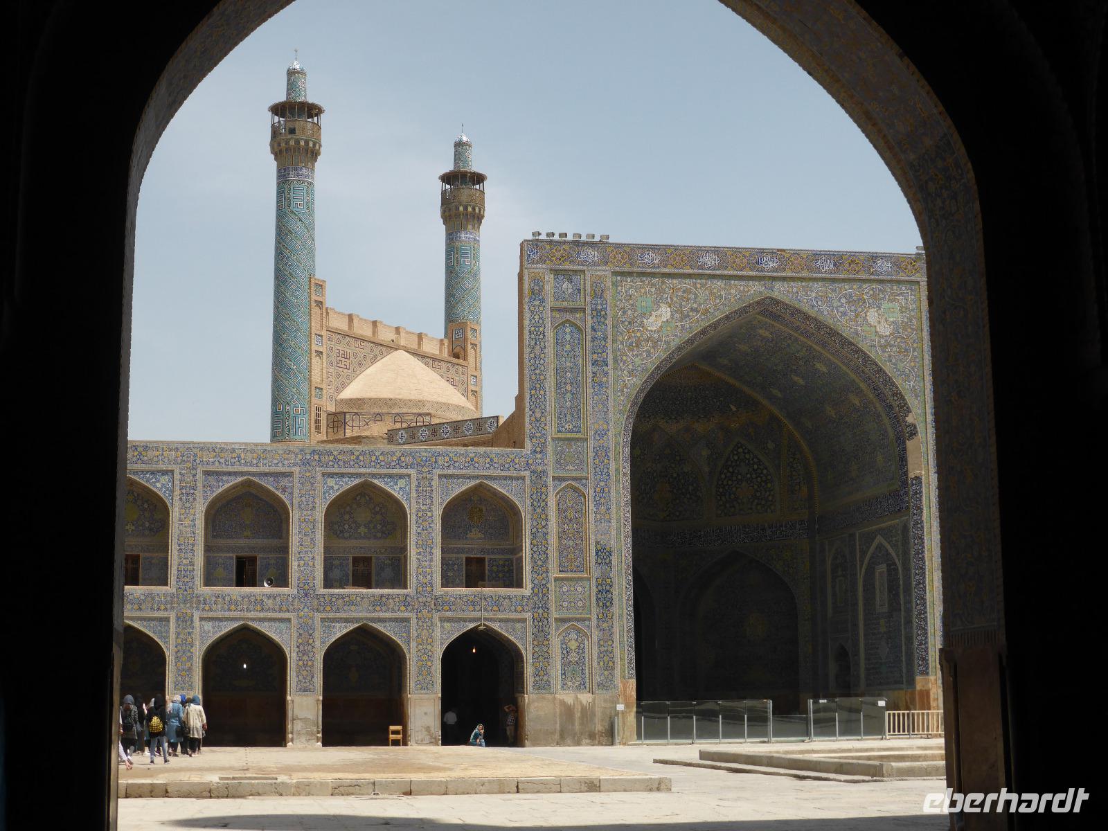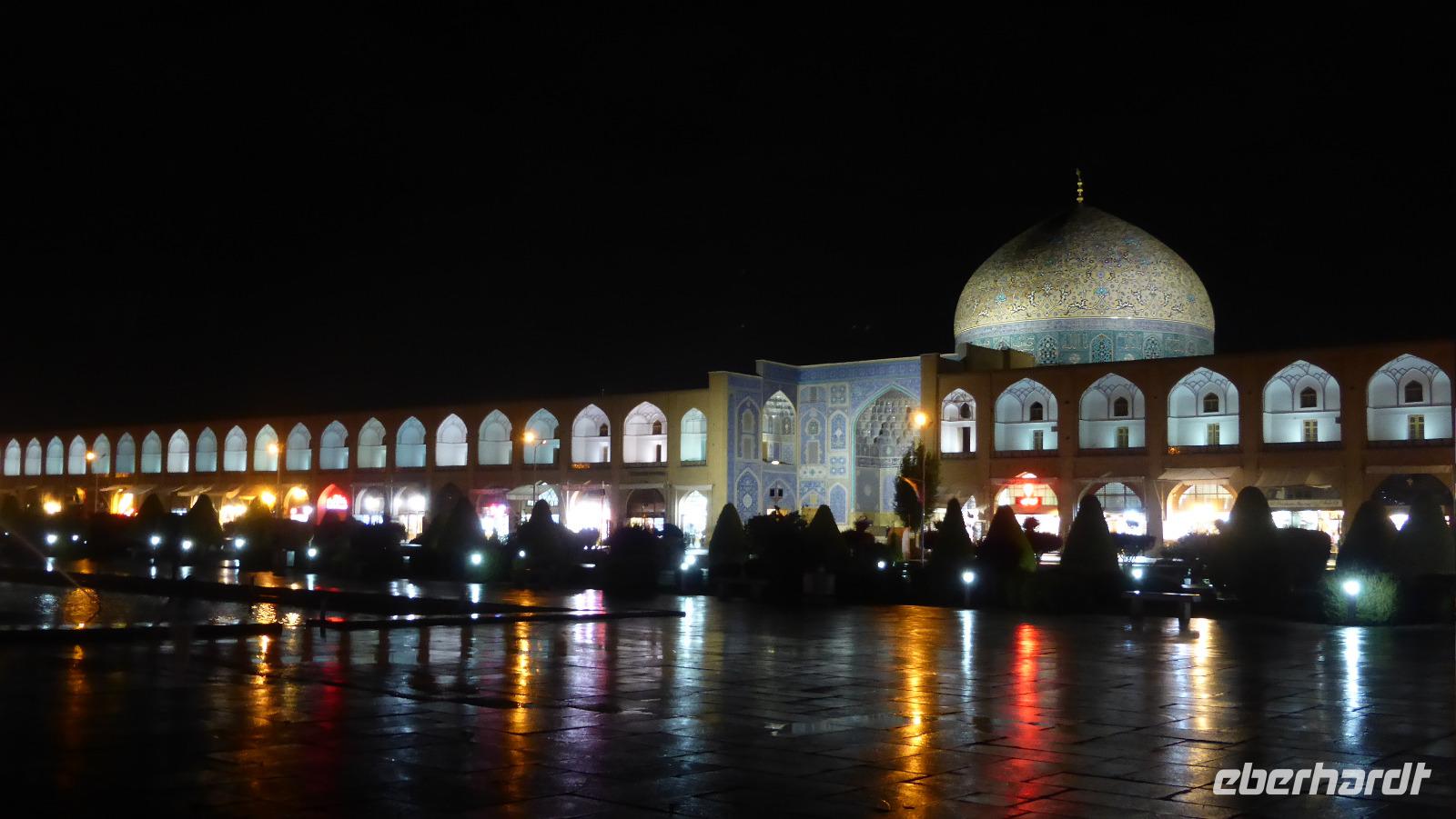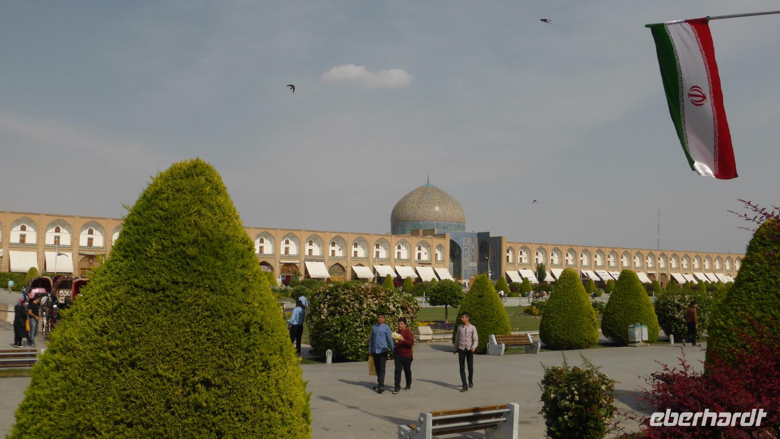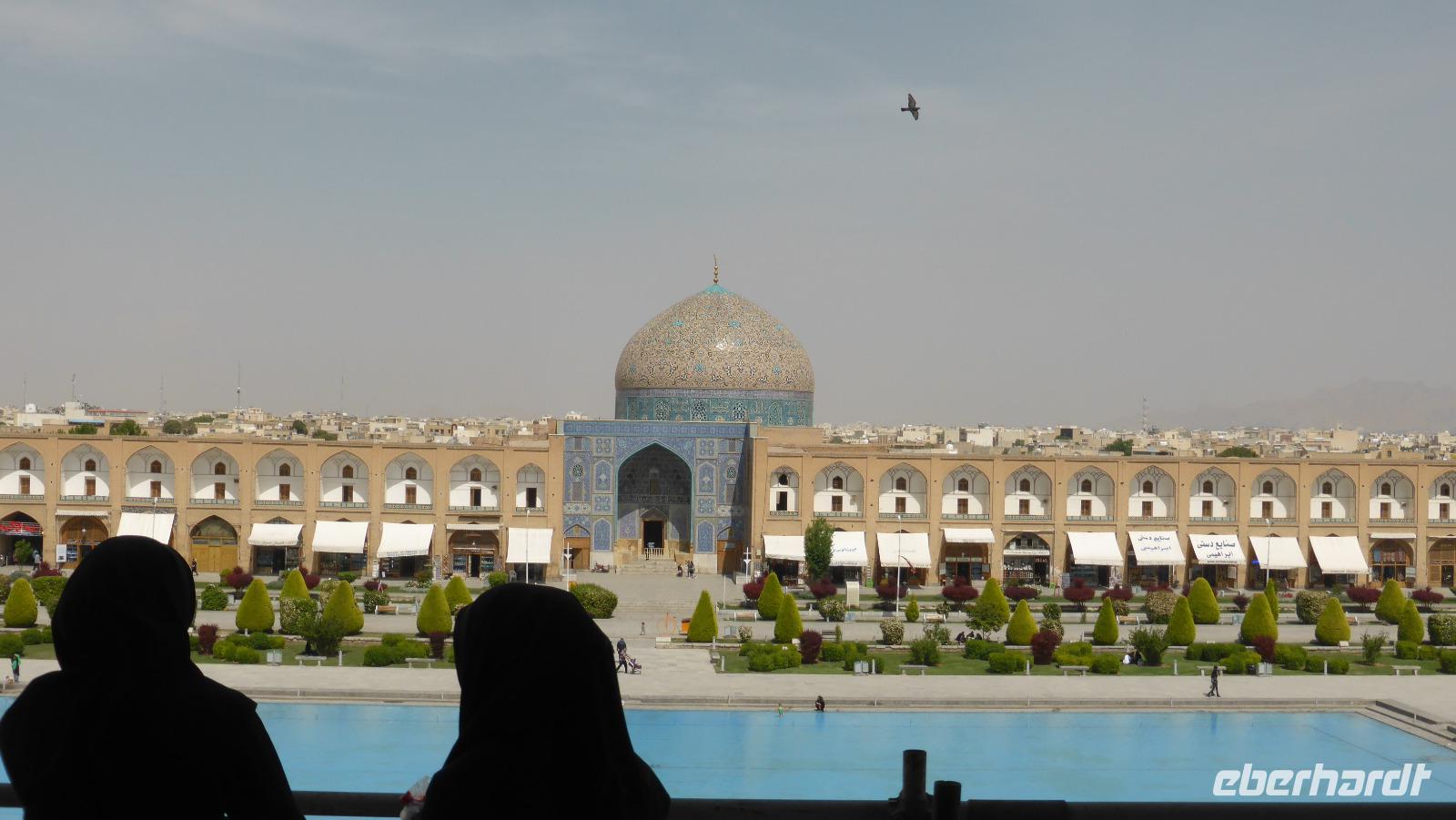 Der zweitgrößte Platz der Welt (UNESCO-Weltkulturerbe) wird von zweistöckigen Arkadengängen umfasst. Dazwischen stechen zwei Moscheen und ein Palast hervor. Wir beginnen mit der Besichtigung der Imam-Moschee. In nur 18 Jahren erbaut, strahlt sie mit ihren azurblauen Kacheln mit dem blauen Himmel um die Wette.
