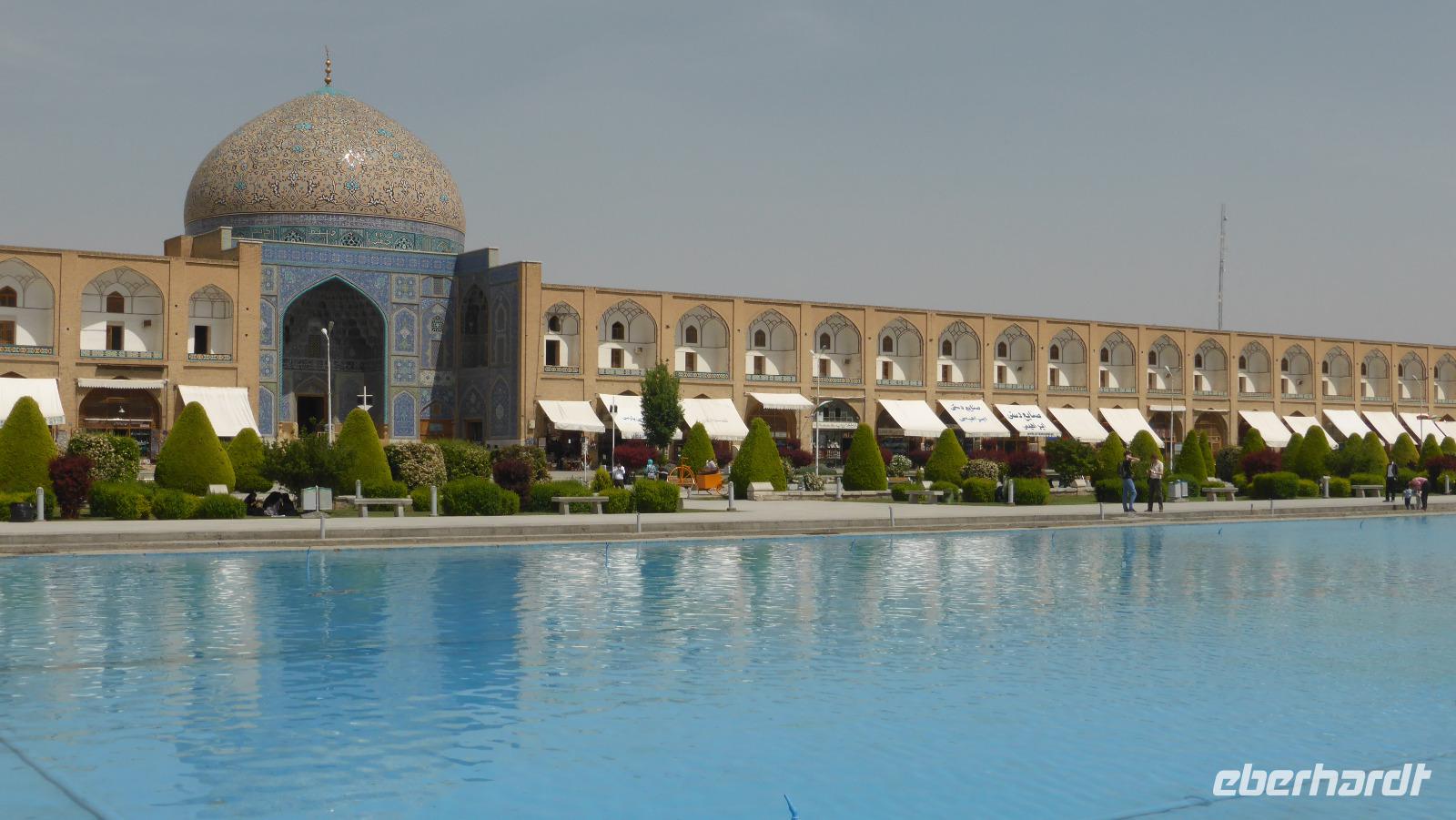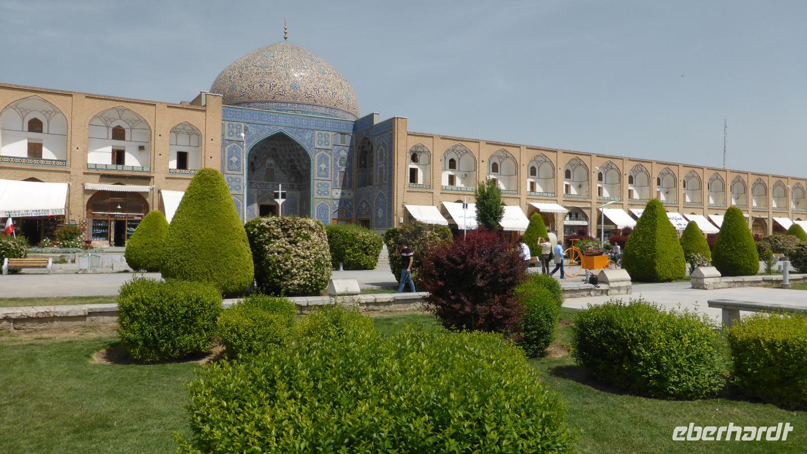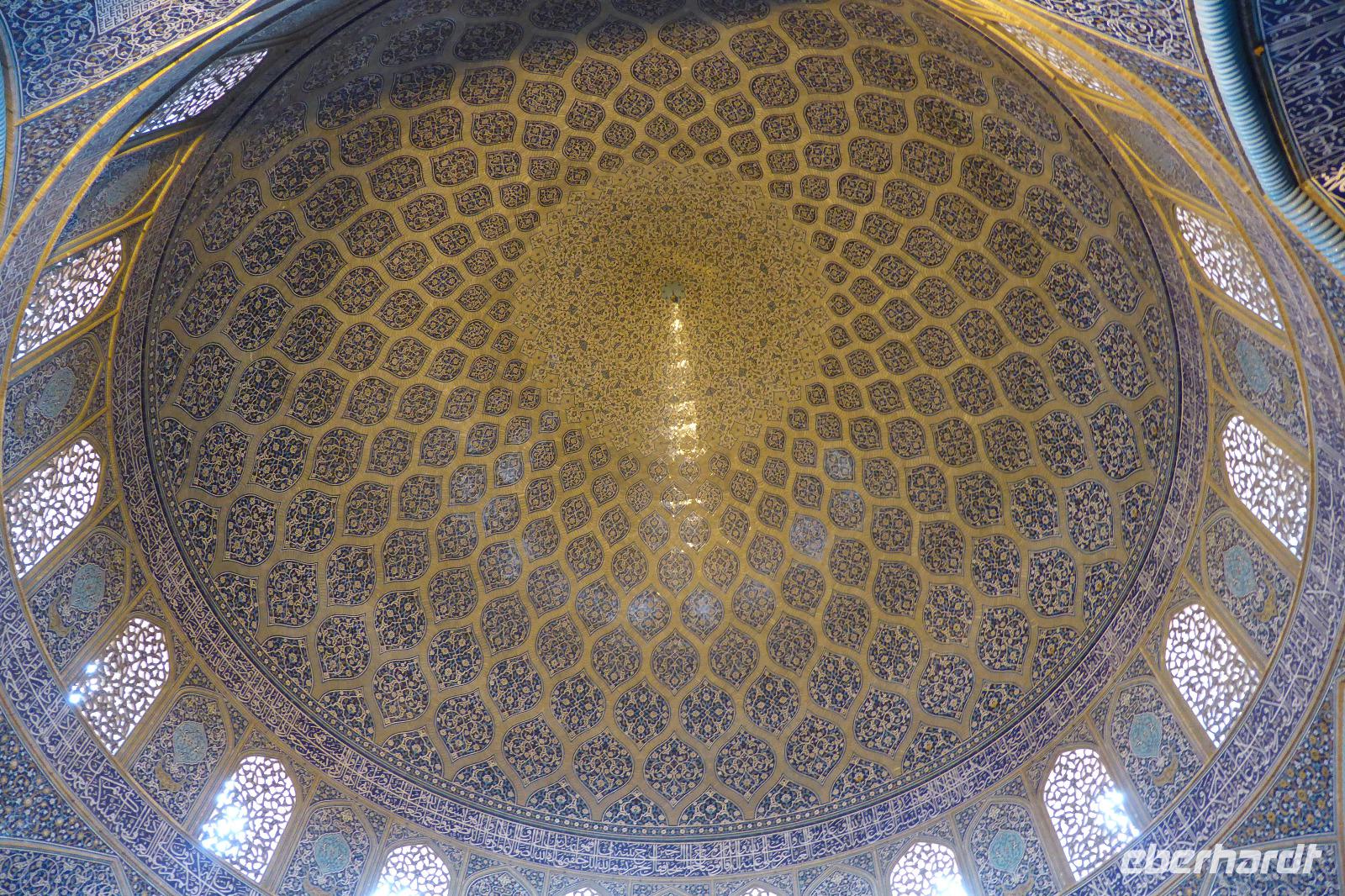 Die Lotfollah Moschee, auch Frauenmoschee genannt, bezeichnet sich als die schönste Moschee der Welt. Die Moscheekuppel ist innen wie außen vollständig mit den typischen blauen Kacheln verkleidet. Interessante Details sind zum Beispiel der Lichtstrahl in Form eines Pfaus in der Innenkuppel oder der Fotoblick entlang der blauen Säulen zur Kuppel.