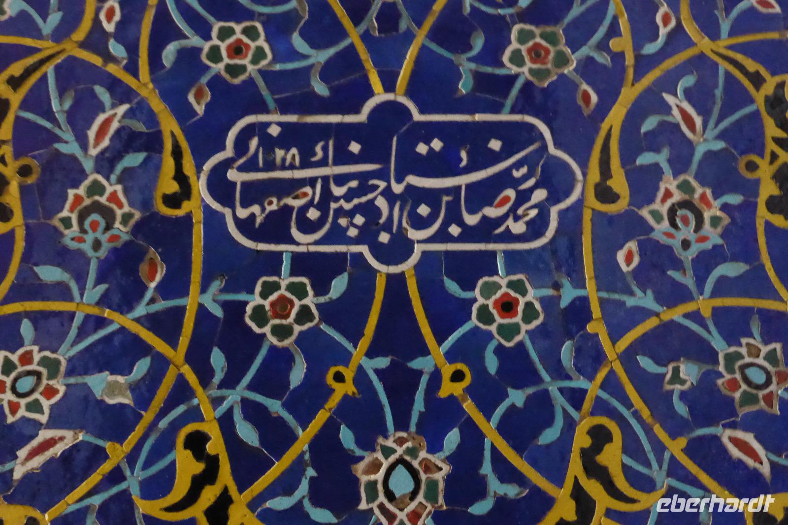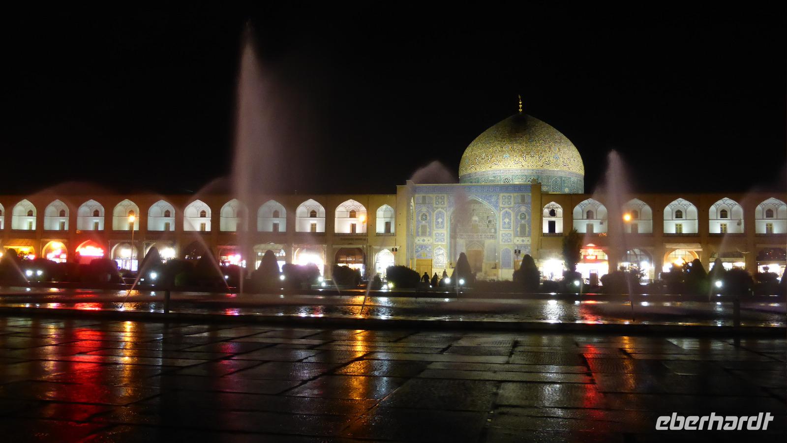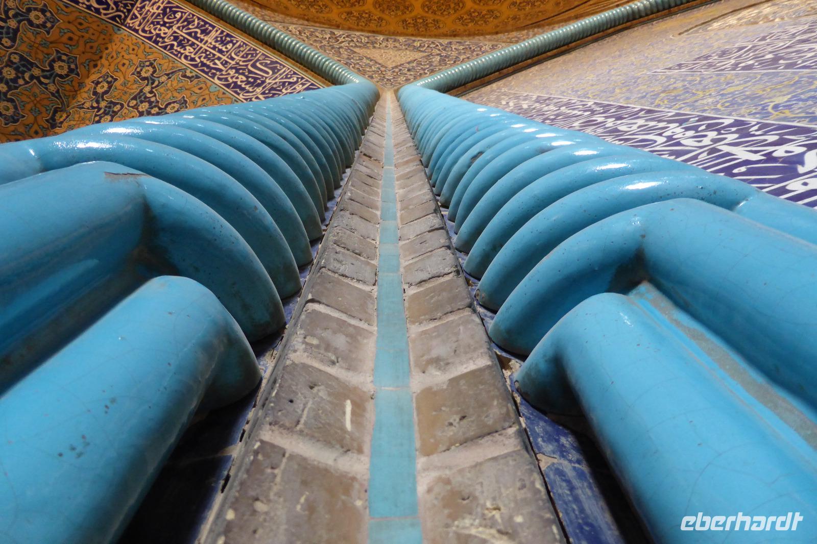 Die Lotfollah Moschee, auch Frauenmoschee genannt, bezeichnet sich als die schönste Moschee der Welt. Die Moscheekuppel ist innen wie außen vollständig mit den typischen blauen Kacheln verkleidet. Interessante Details sind zum Beispiel der Lichtstrahl in Form eines Pfaus in der Innenkuppel oder der Fotoblick entlang der blauen Säulen zur Kuppel.