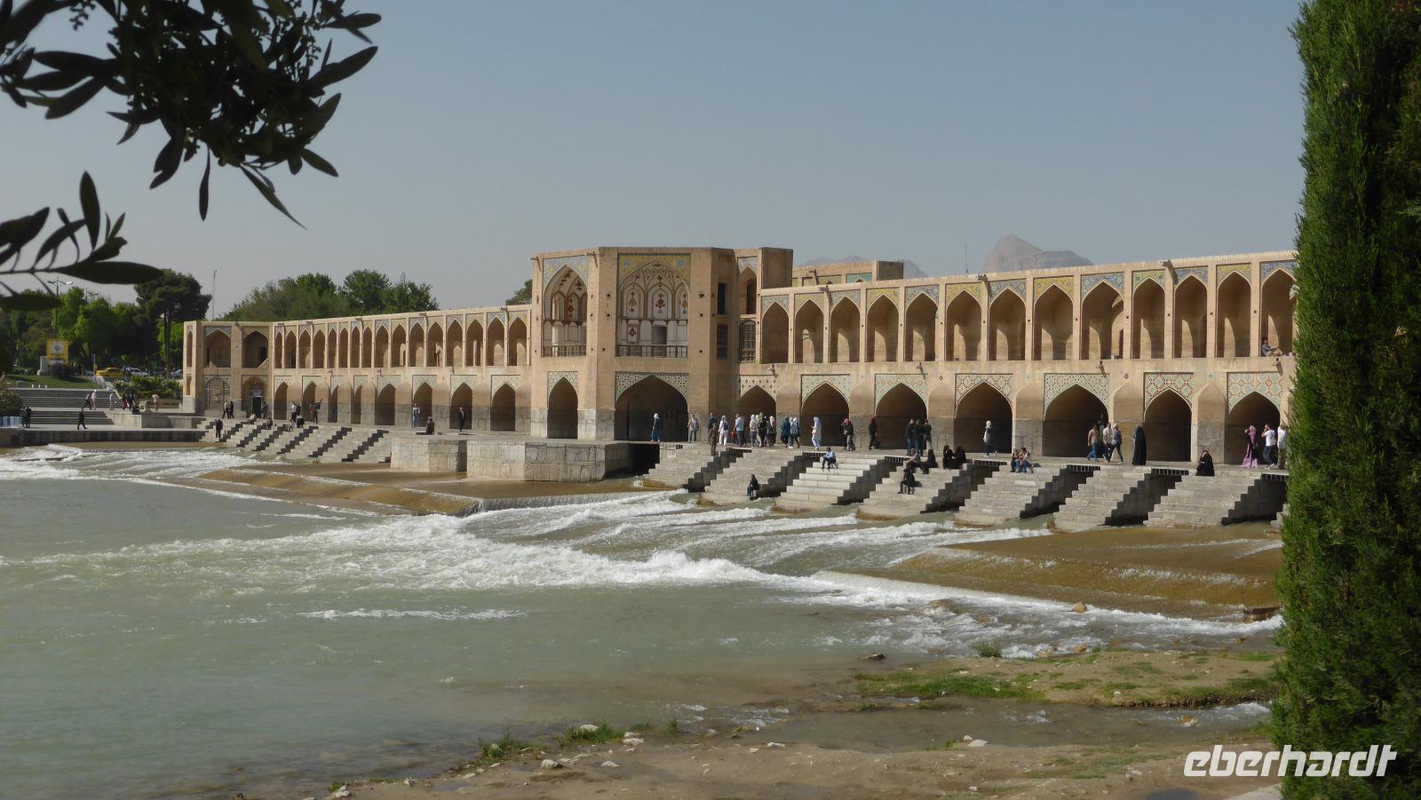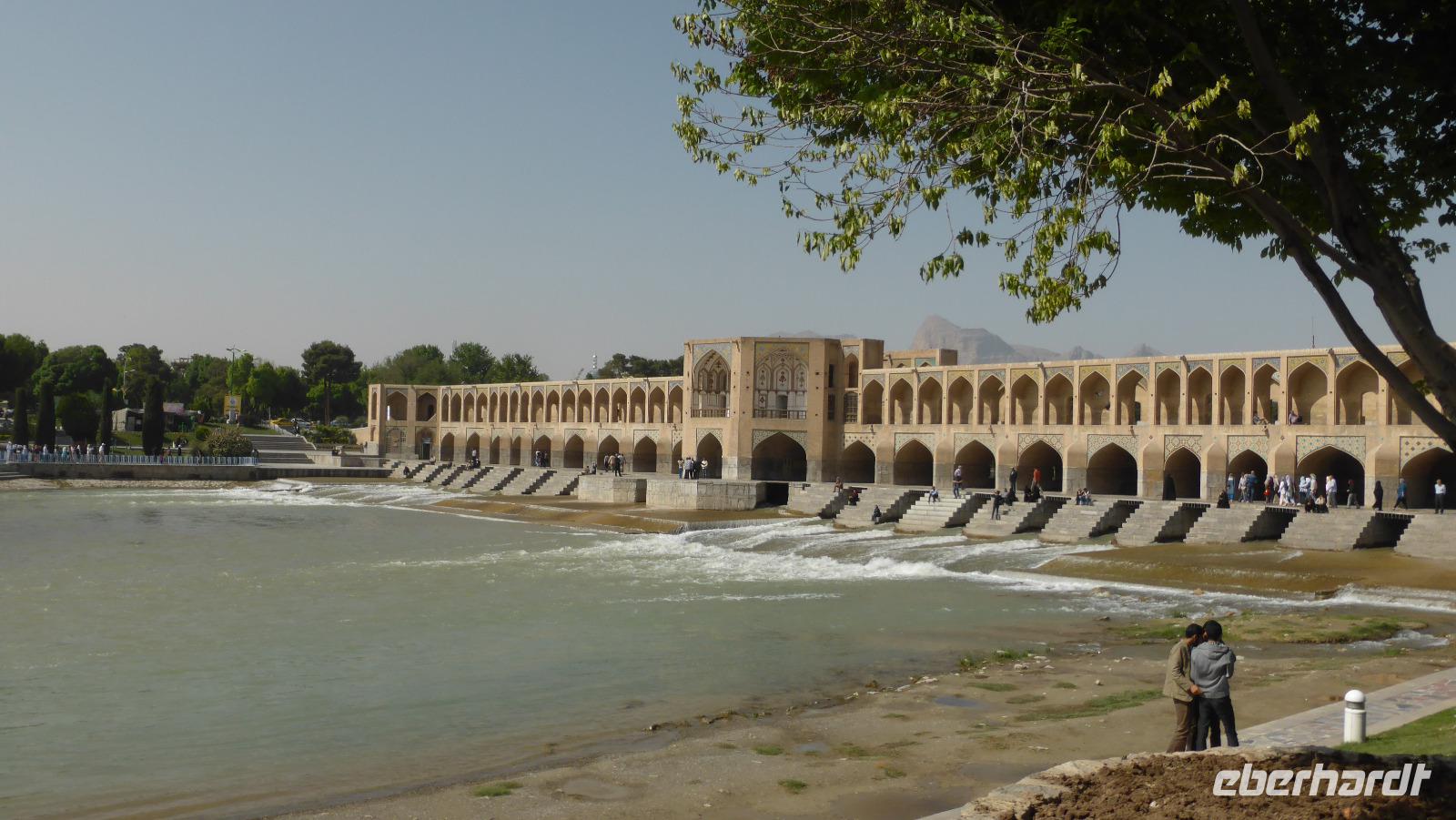 Bei unserem nächsten Halt überqueren wir die Khaju-Brücke. Dank der ergiebigen Regenfälle der letzten Wochen haben wir das Glück, dass die Brücke tatsächlich auch über Wasser führt. Hamid meint, nur etwa 2 Monate im Jahr führt der Fluss Zayandeh Rud Wasser, da das Wasser in einem Staubecken zurückgehalten wird. Anschließend kommen wir zur sogenannten Jame Moschee, dies bedeutet einfach nur „Freitagsmoschee". Zur Moschee gelangen wir vom unterirdischen Kreisverkehr aus durch den Basar. In der größten Moschee des Iran lernen wir Architektur aus verschiedenen Epochen kennen, wie zum Beispiel aus Ziegeln errichtete Kuppeln oder die blauen Kacheln verzierten Iwane (Eingangsportale) mit ihren Muqarnas (Stalaktitengewölbe).Nach unserem Moscheebesuch fahren wir in das historische Zentrum und können ab jetzt ohne Bus die weiteren Sehenswürdigkeiten kennenlernen: