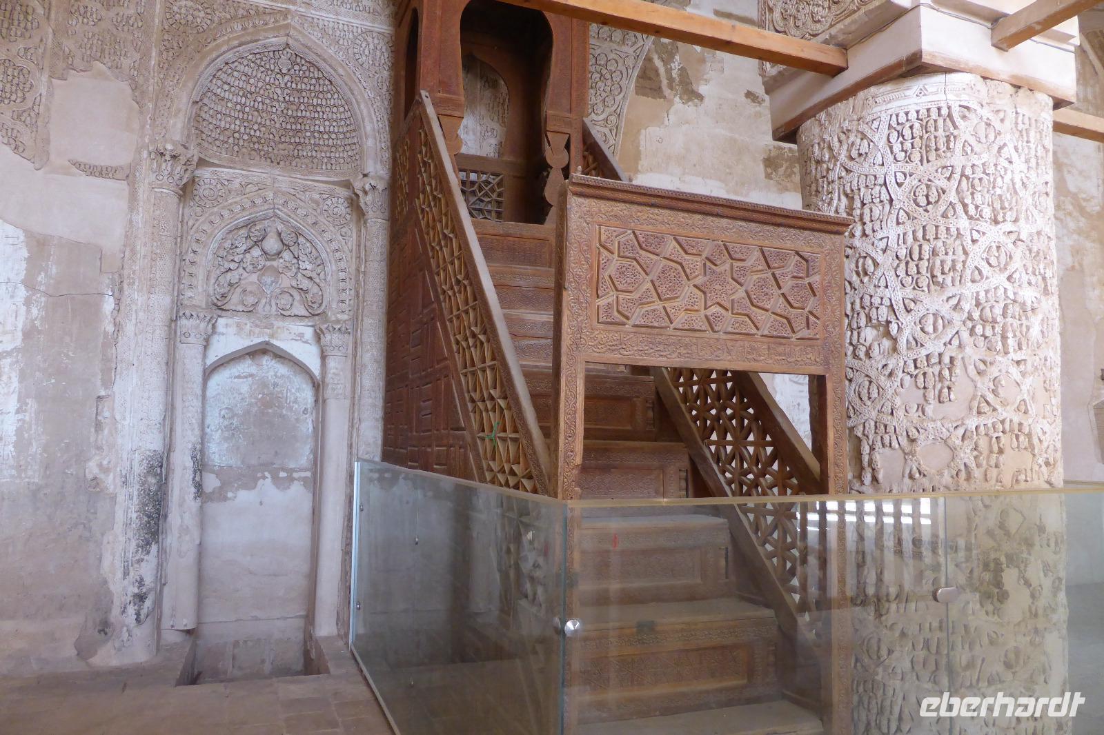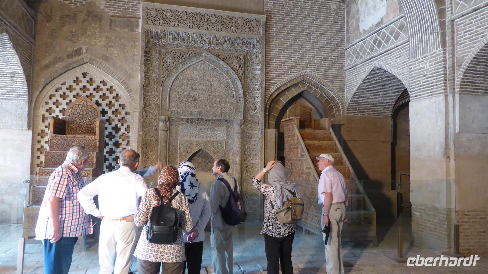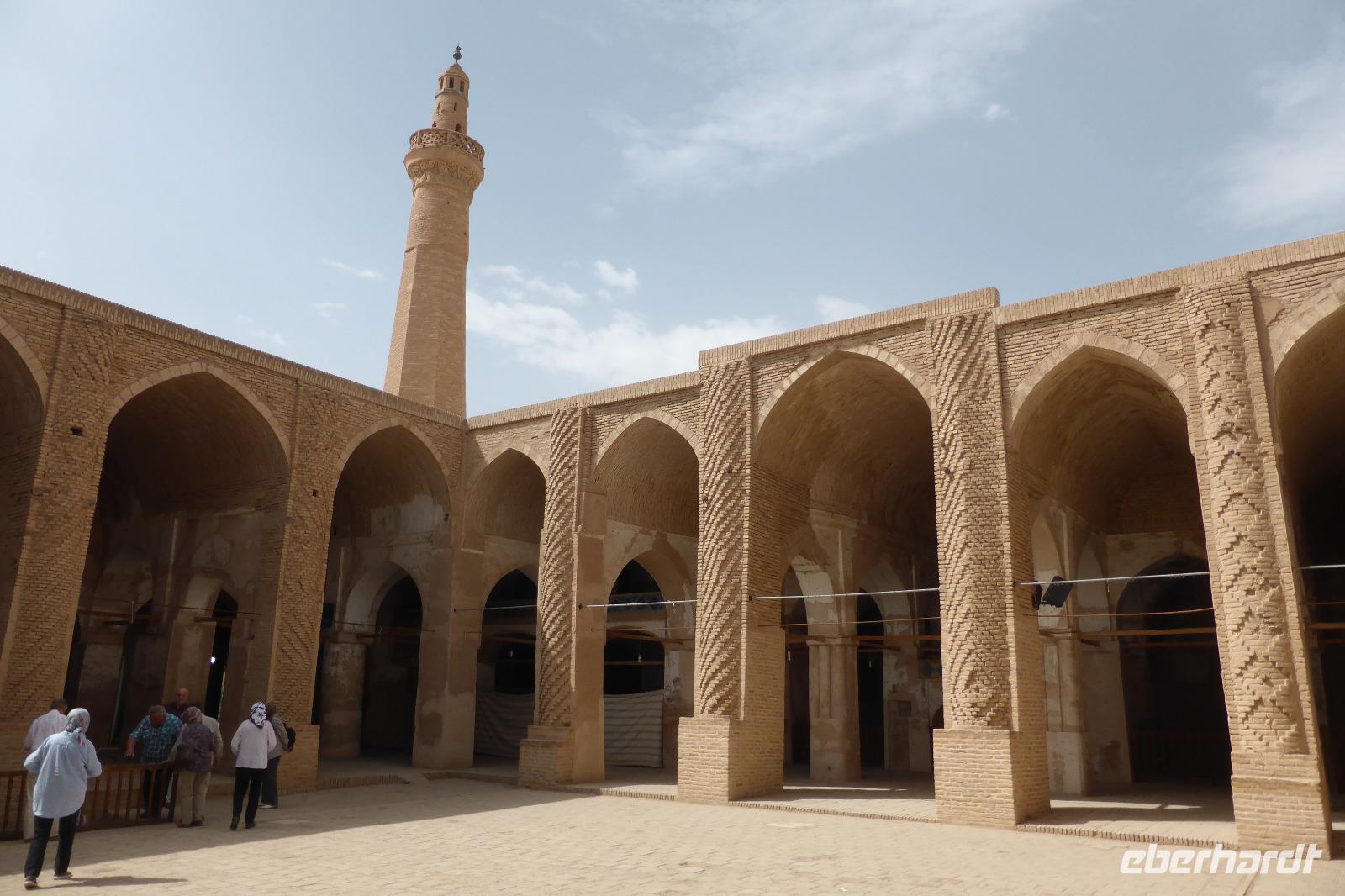 Hamid führt uns durch die historische Jame Moschee. Die rund 1.000 Jahre alte Moschee stammt noch aus der frühen Abbasidenzeit. Besonders bemerkenswert sind der aus Holz gefertigte Minbar (Predigtstuhl) und Gebetsraum im Untergeschoss, welcher im Winter angenehme Wärme und im Sommer kühle Temperaturen bietet. Nur durch Alabastersteine fällt Tageslicht durch die Decke in die Kellerräume.