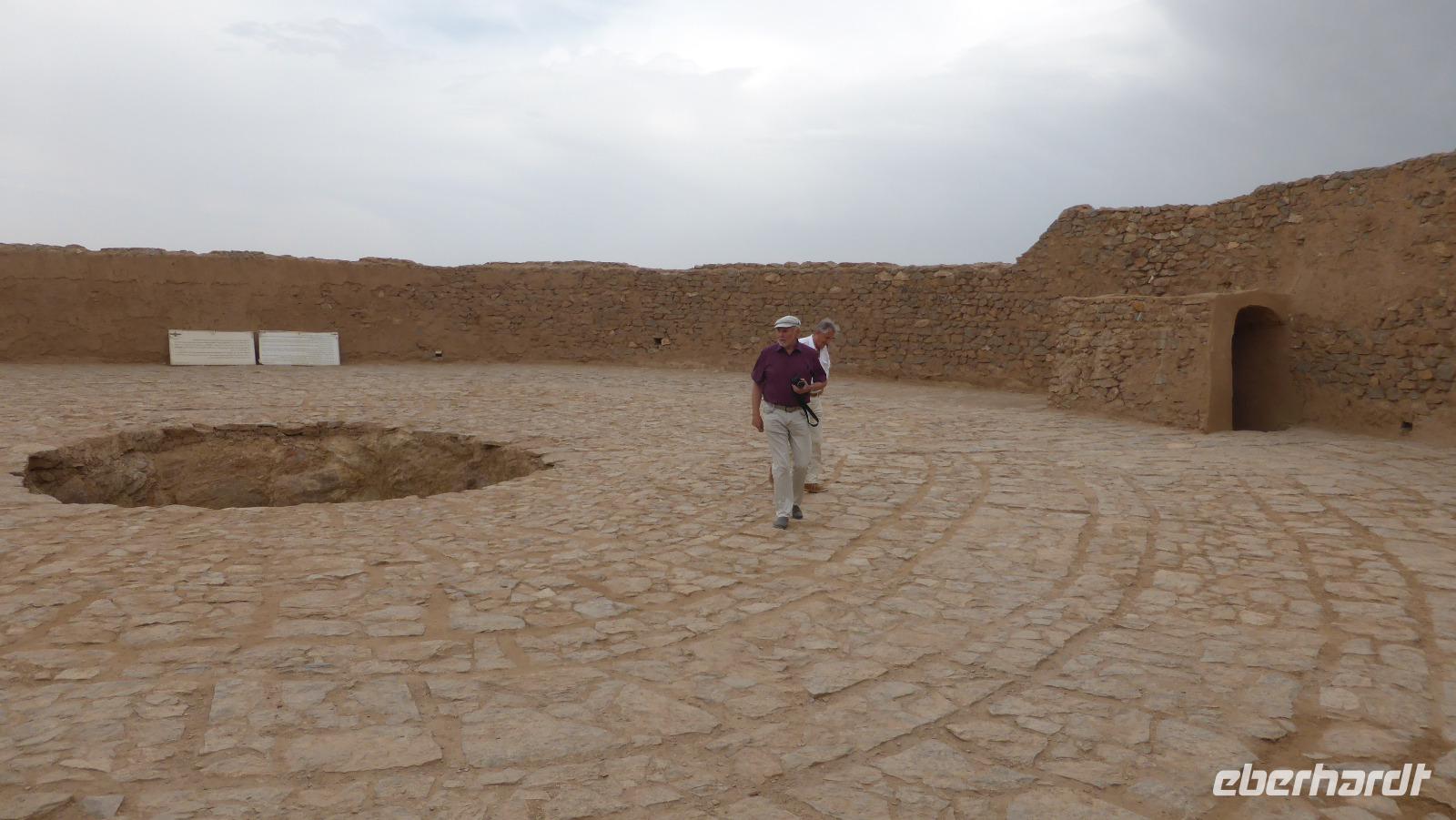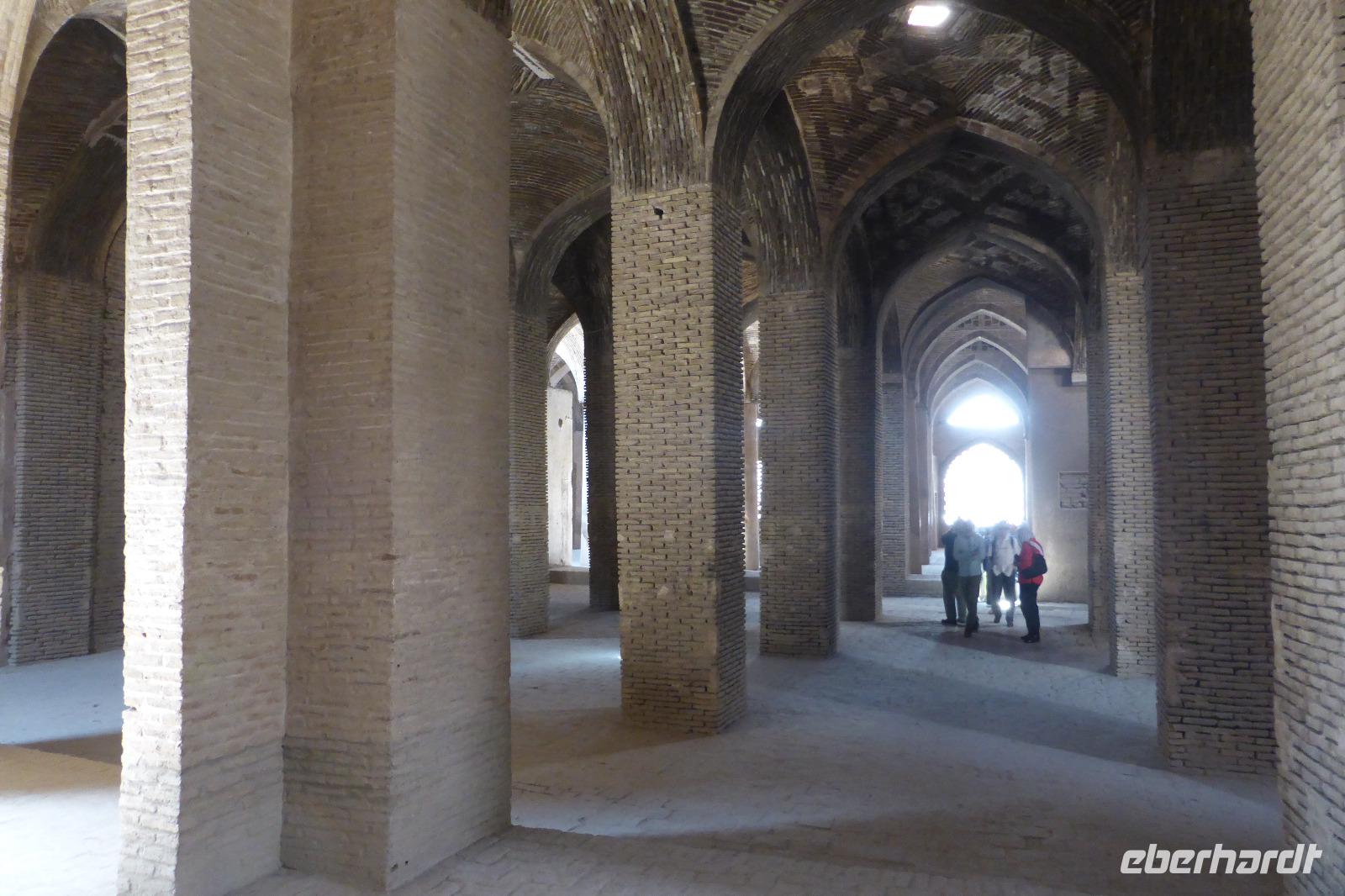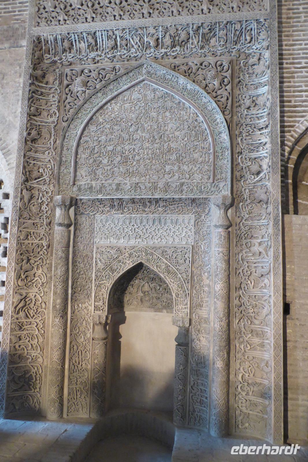 Hamid führt uns durch die historische Jame Moschee. Die rund 1.000 Jahre alte Moschee stammt noch aus der frühen Abbasidenzeit. Besonders bemerkenswert sind der aus Holz gefertigte Minbar (Predigtstuhl) und Gebetsraum im Untergeschoss, welcher im Winter angenehme Wärme und im Sommer kühle Temperaturen bietet. Nur durch Alabastersteine fällt Tageslicht durch die Decke in die Kellerräume.