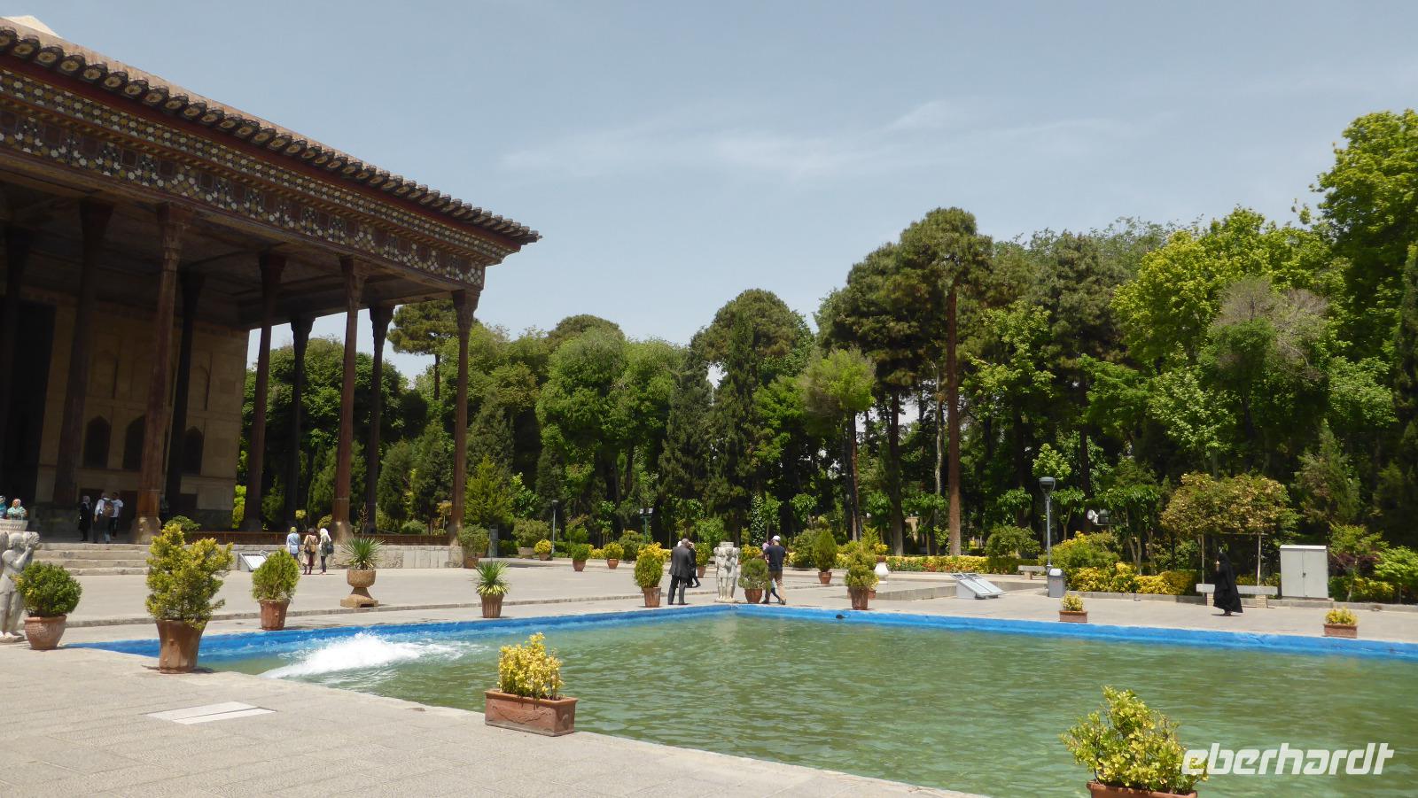 Da sich die 20 Säulen des Palastes im Wasser des davor liegenden Bassins spiegeln, nennt man den früheren Wohnsitz der Safawiden auch 40-Säulenpalast. Prächtige Wandmalereien von zumeist gewonnenen Schlachten gegen Inder, Usbeken, Osmanen, Afghanen... schmücken das Palastinnere.