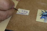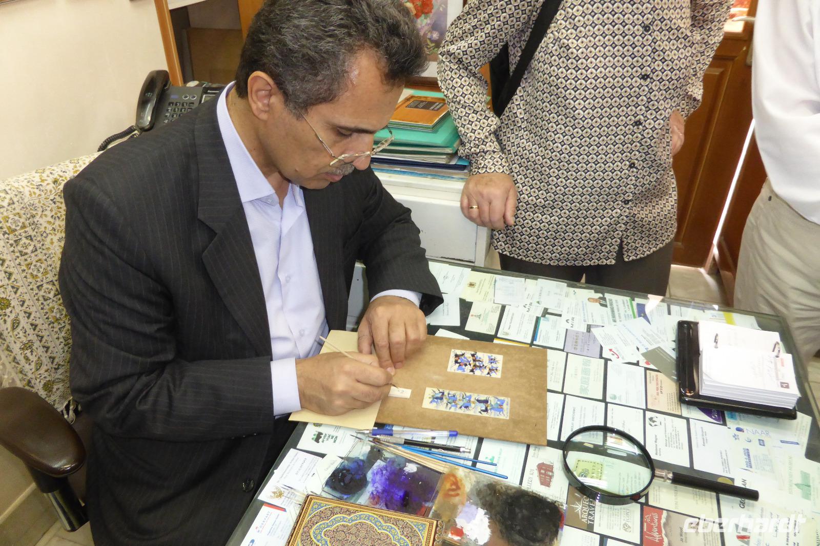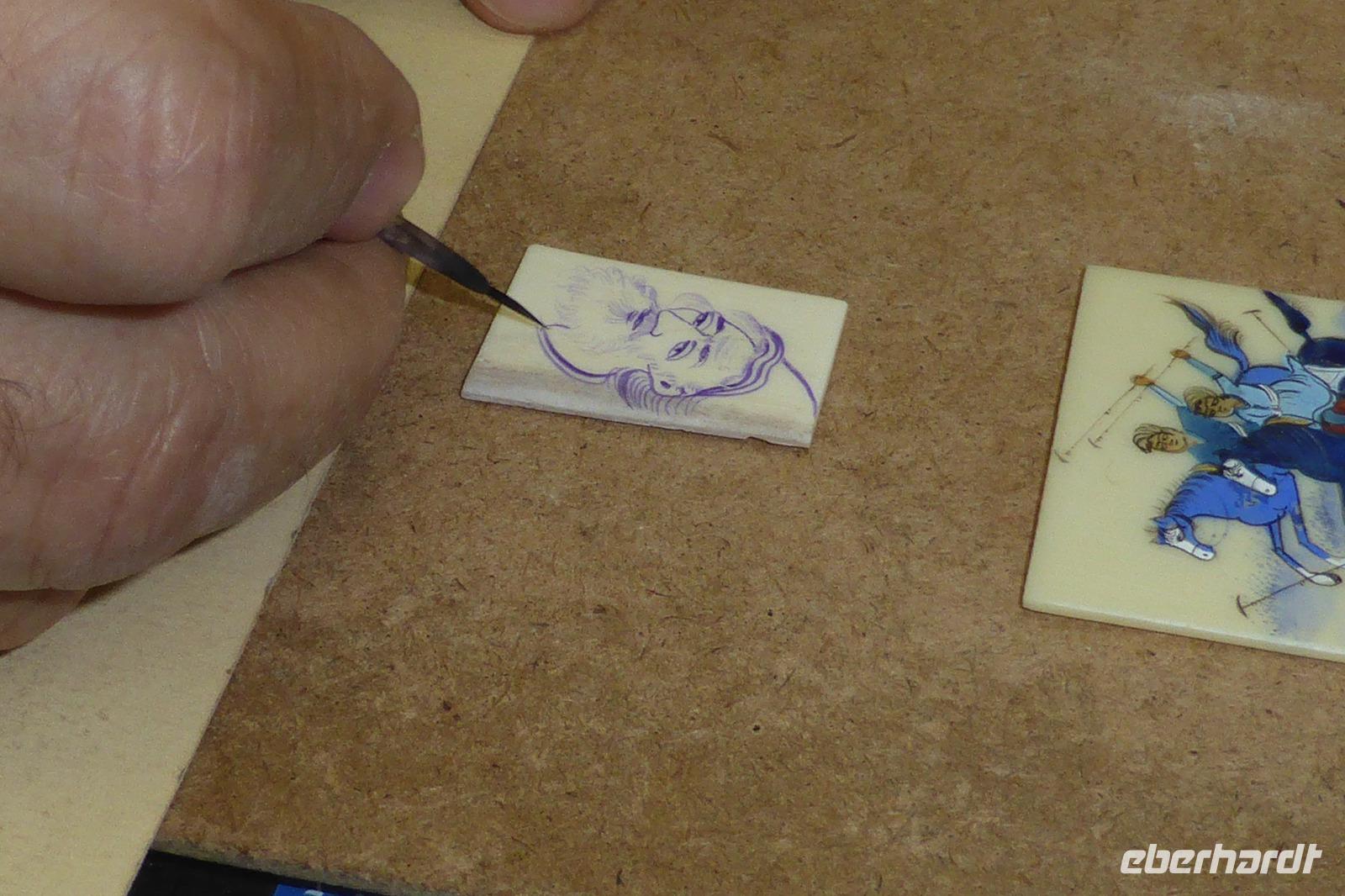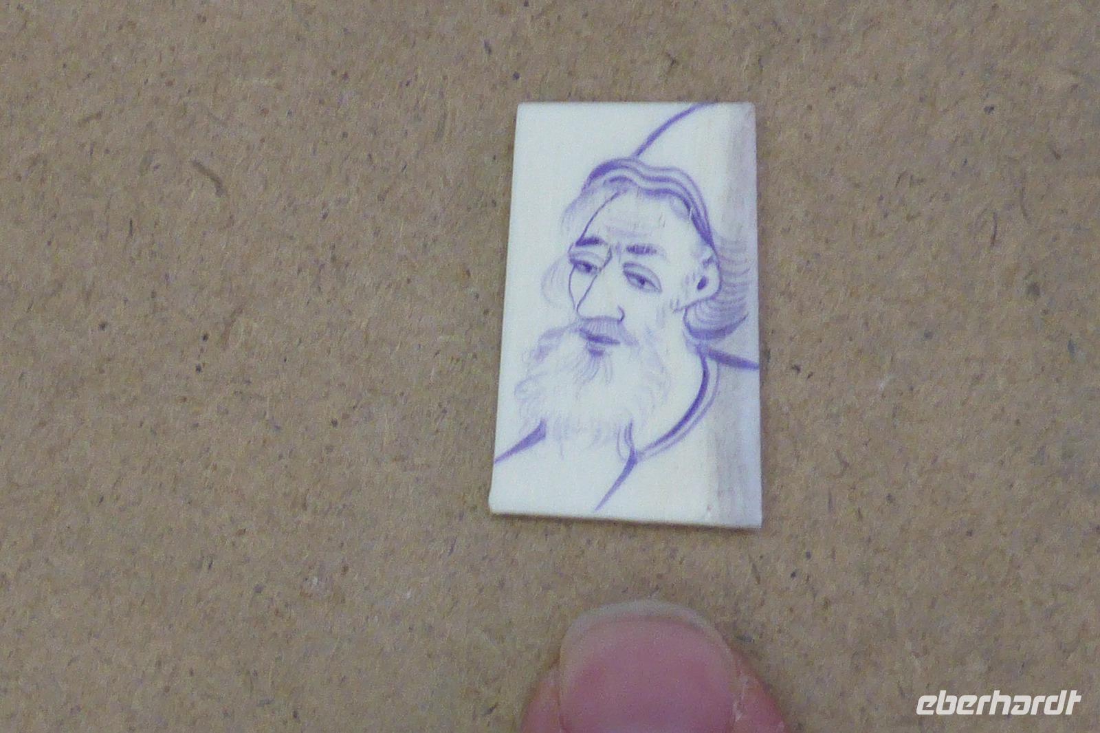Isfahan ist berühmt für seine Miniaturmalerei. Wir besuchen einen der berühmtetsten Maler. Der Meister malt uns in wenigen Minuten und einigen (Katzenhaar-)Pinselstrichen ein Porträt auf ein Stück Kamelknochen.