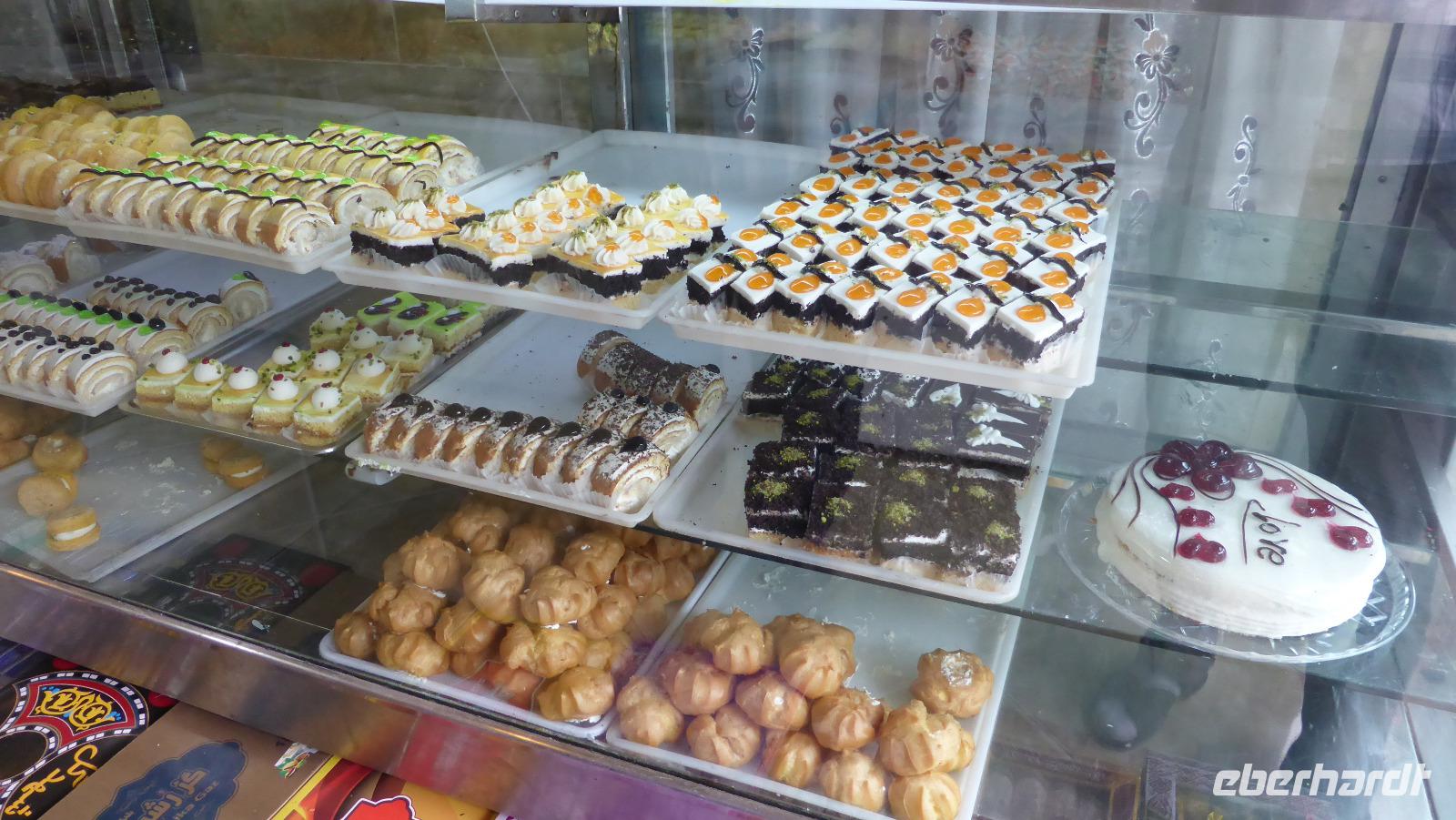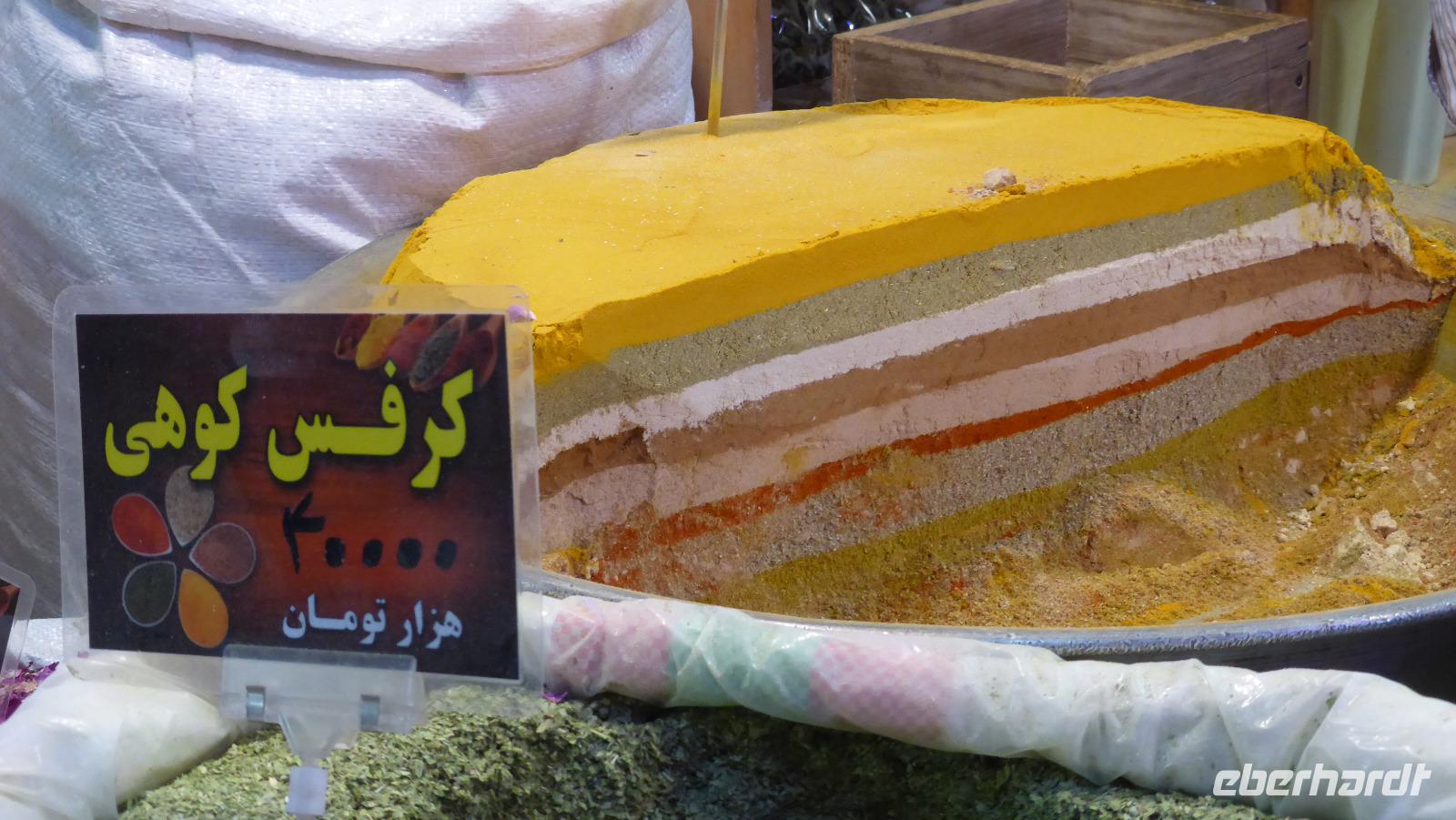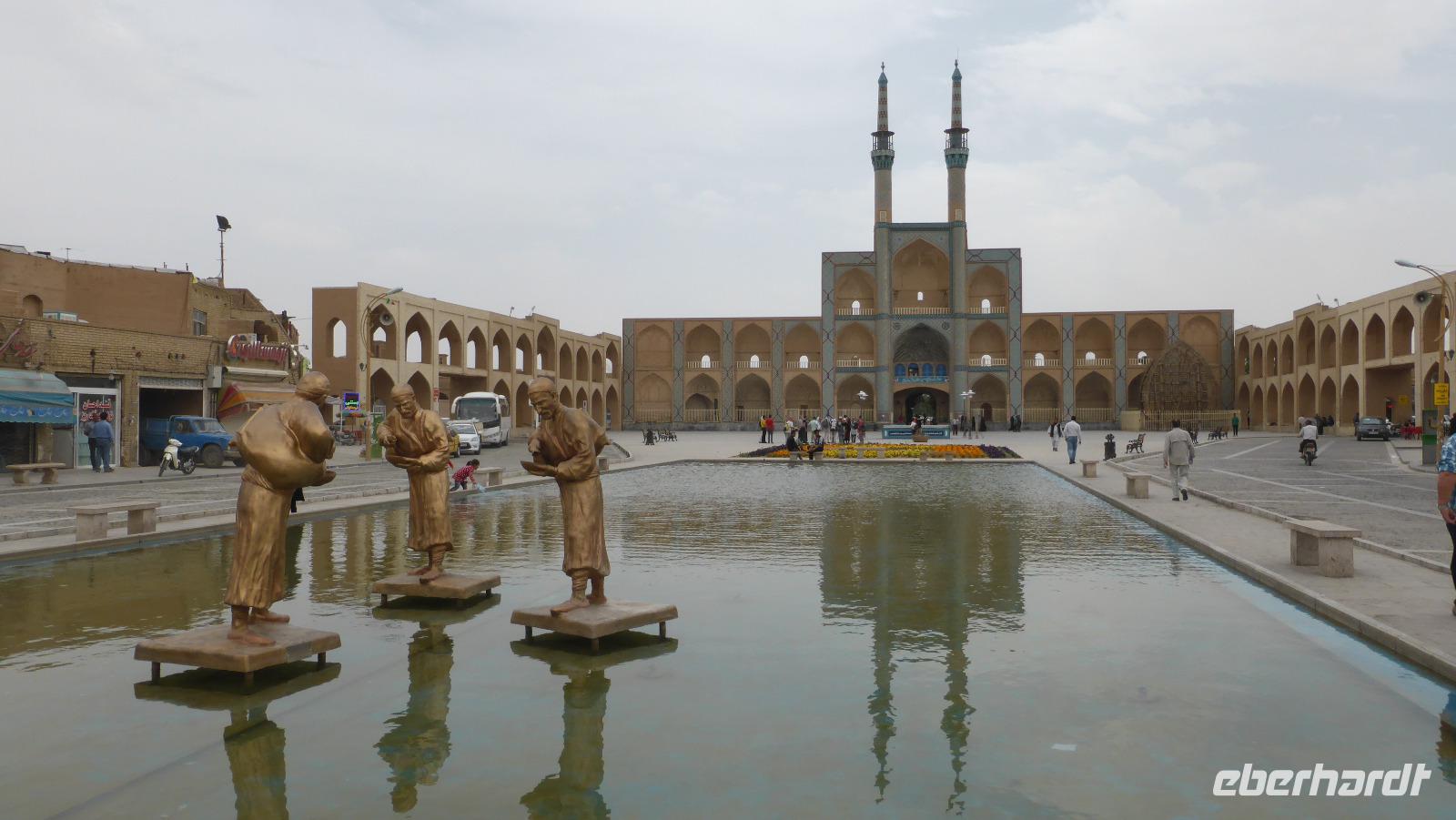 Am frühen Nachmittag kommen wir in die Wüstenstadt Yazd und halten am zentralen Amir Chaghmaq-Platz, welchen Hamid mit dem Alexanderplatz vergleicht. Hier befindet sich eines der Wahrzeichen der Stadt, ein mächtiger Tribünenbau mit 2 Minaretten für das schiitische Ashurafest. Neben der Tribüne steht ein Holzgestell, welches zum Ashurafest mit schwarzen Tüchern behangen wird und damit eine überdimensionale Träne symbolisiert. Vom Amir Chaghmaq-Platz laufen wir zur großen Freitagsmoschee. Unterwegs können einem Geschäft mit süßen Backwaren nicht widerstehen... Die Freitagsmoschee von Yazd ist ebenfalls ein Wahrzeichen, denn das riesige Eingangsportal (Iwan) ist das höchste im ganzen Land.