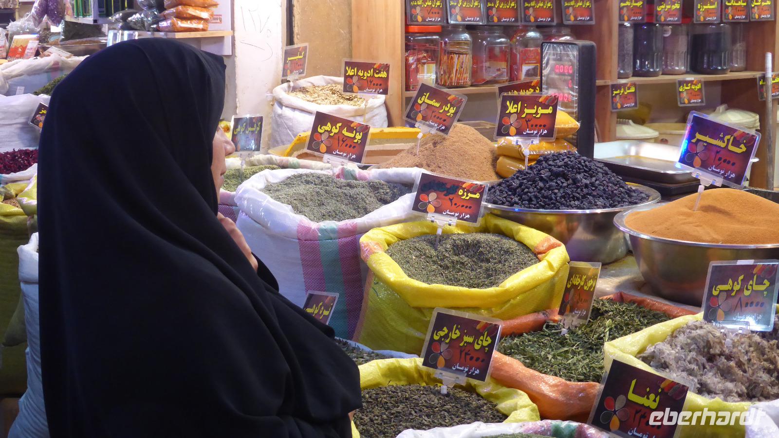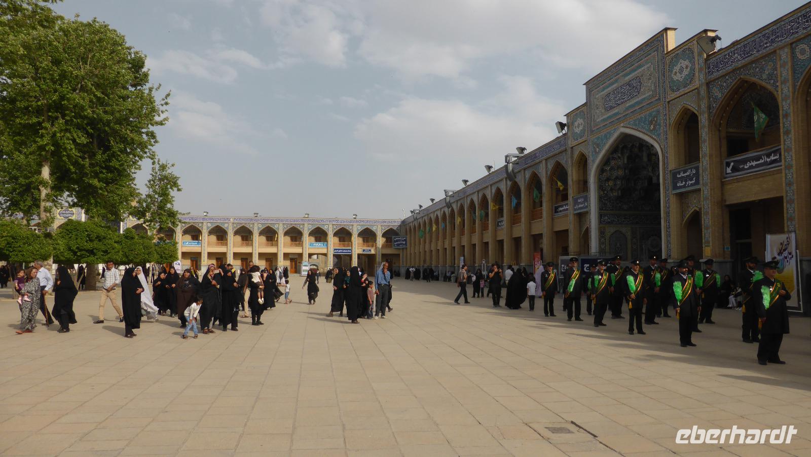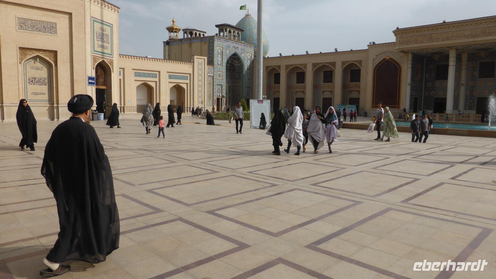 Anschließend besuchen wir den Basar von Shiraz, Vakil-Basar genannt. Dieser ist weitestgehend überdacht und mit seiner Größe und den vielen Gassen schwer zu überschauen, so dass wir besser zusammen bleiben. Den Basarbesuch verbinden wir mit der Besichtigung des Shah Cheragh Heiligtums. Shah Cheragh wird im Iran als Bruder des 8. Imam besonders verehrt. Der Ort gilt nach Maschhad und Ghom als das drittwichtigste Heiligtum der Schiiten im Land. Für Nichtmuslime ist der Zugang mit Ausnahme des Schreins selbst seit 2015 erlaubt. Die Frauen müssen wie schon zuvor einen Umhang tragen, den sie am Eingang erhalten. Unter Begleitung eines lokalen Führers dürfen wir den Innenhof betreten. Heute zum Donnerstag besuchen den Schrein viele Schiiten, begleitet von Musik und Zeremonien, was dieser schönen Anlage ein ganz besonderes Flair verleiht.