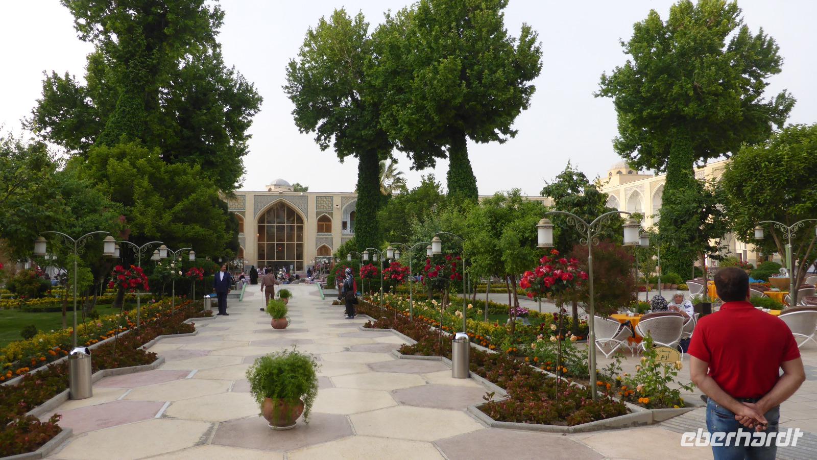 Für den heutigen Abend hat sich Hamid für uns etwas ganz Besonderes ausgedacht: wir essen im besten Restaurant des Abbasi-Hotels. Das Abbasi entstand aus einer alten Karawanserei. Im Innenhof befindet sich ein großer persischer Garten. Oft verkehren hier ausländische Diplomaten. So hat in unseren Restaurant auch schon Frank-Walter Steinmeier gegessen Unsere Hauptmahlzeit heisst Fesanjan. Das Geflügelfleisch wird mit einer Sauce aus Granatapfelsirup und Walnüssen zubereitet.