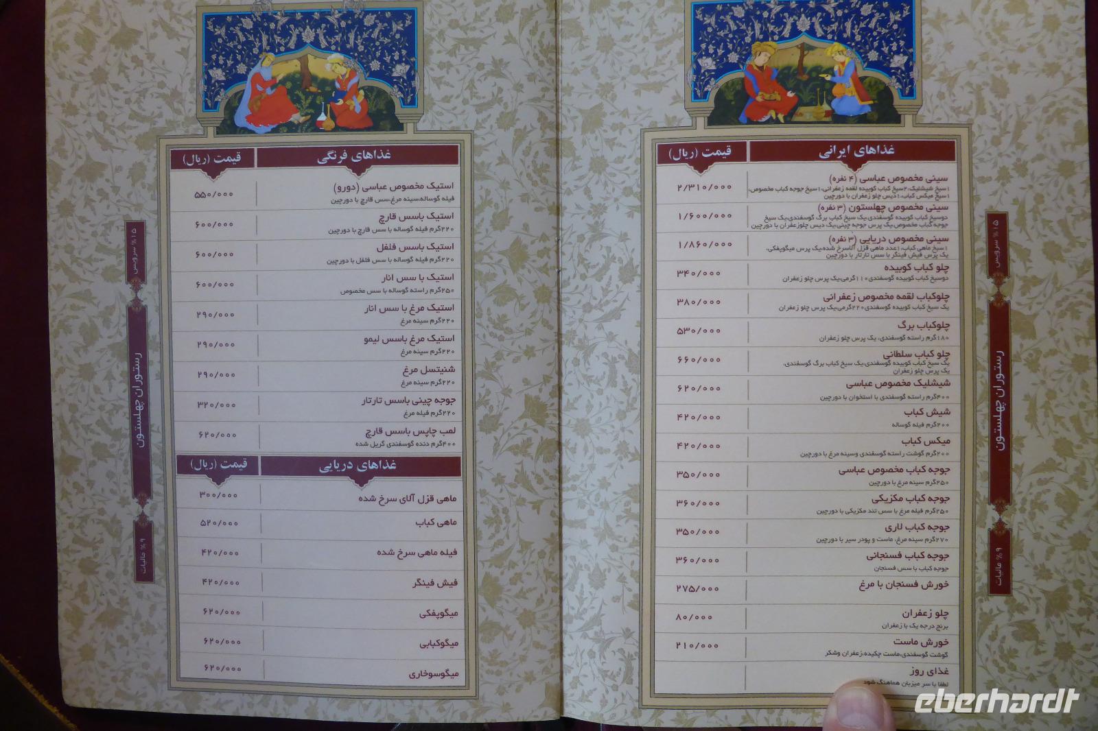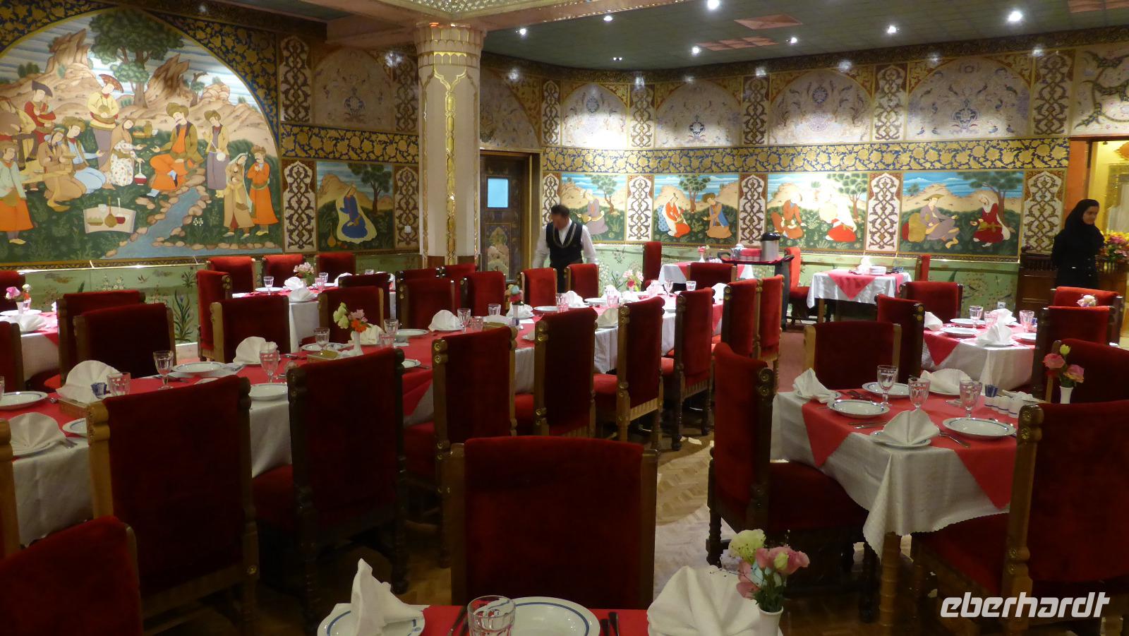 Am Abend lernen wir im Traditionsrestaurant erste Kostproben persischer Küche kennen. Es gibt Lamm- und Geflügelkebab mit Reis und Gemüse. Ein Bier oder Wein würde nach unserem Geschmack gut dazu passen, müssen uns aber mit alkoholfreien Getränken begnügen. Im Laufe des Abends werden wir im Restaurant noch Zeugen eines iranisch-französischen Treffens, bei dem es um den Ausbau des Tourismus geht.