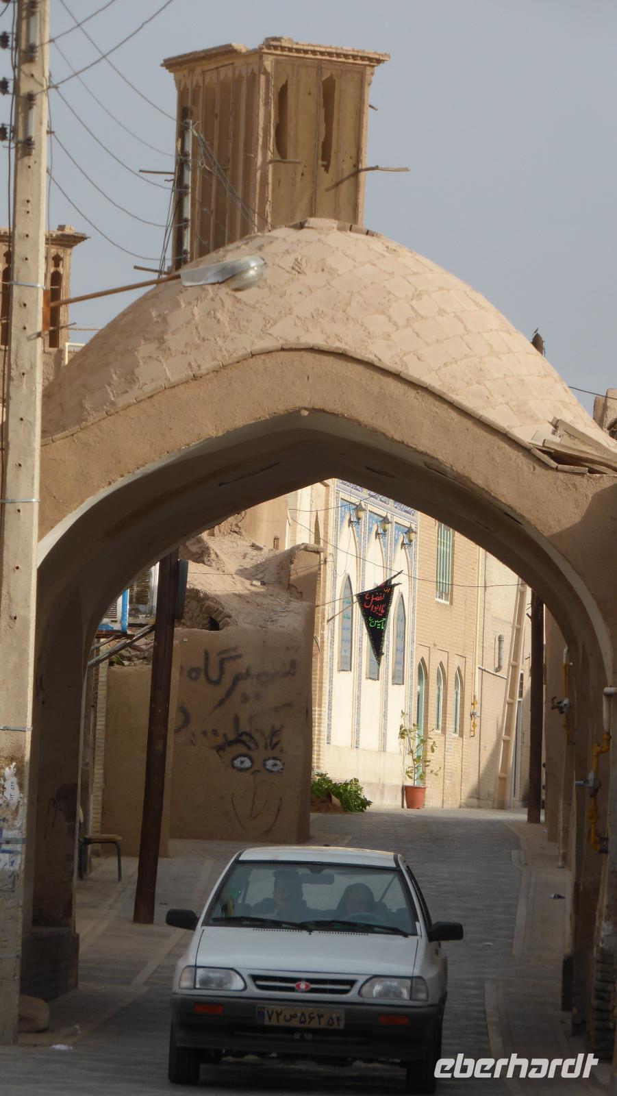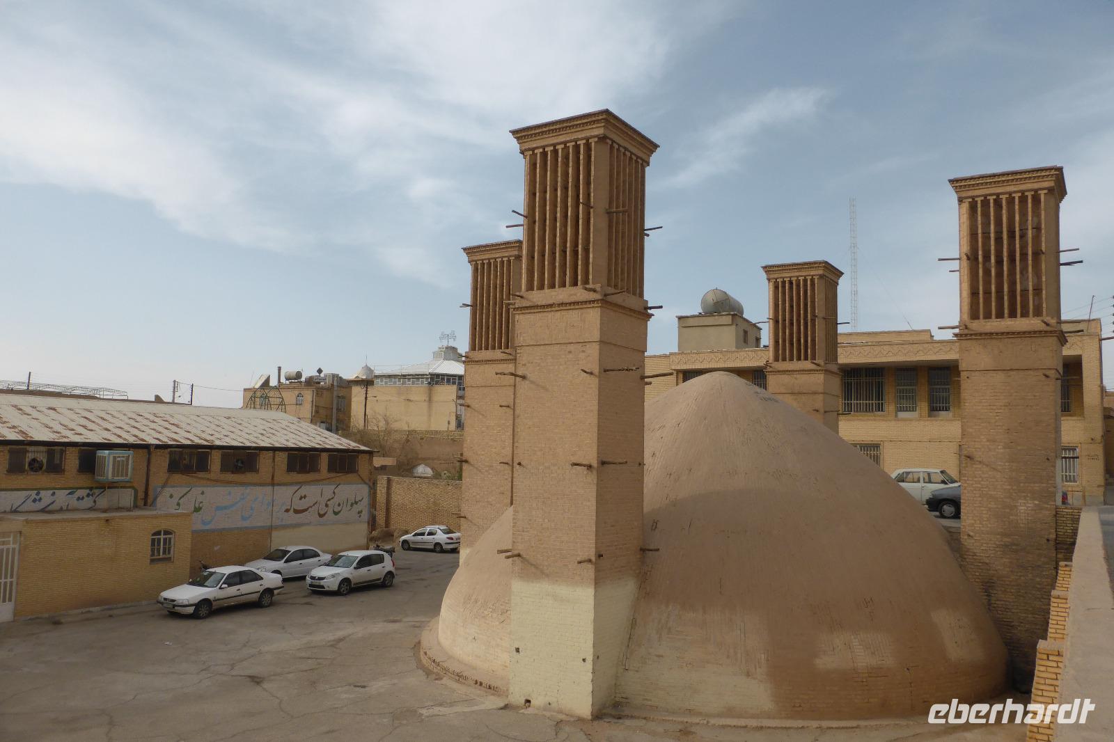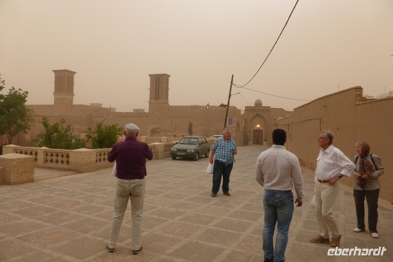 Wir unternehmen einen Spaziergang durch die Altstadt von Yazd. Allerdings bringt ein Gewitter zuerst Sandsturm und dann Regen mit sich. Sonst erzählen die Reiseleiter an dieser Stelle, dass die verwinkelten Gassen Schutz vor Sandstürmen boten. Jetzt können wir diesen Schutz in Anspruch nehmen. So schnell wie der Regen kam, ist er auch wieder abgezogen und wir können unsere Besichtigungen in Yazd fortsetzen.