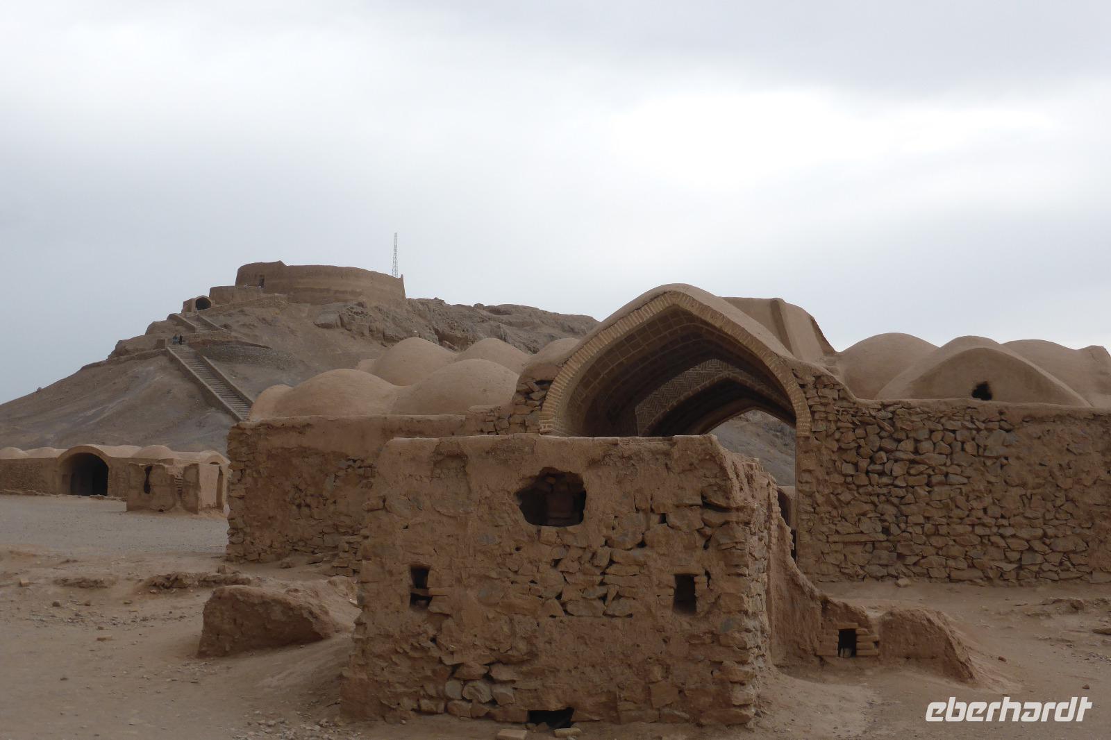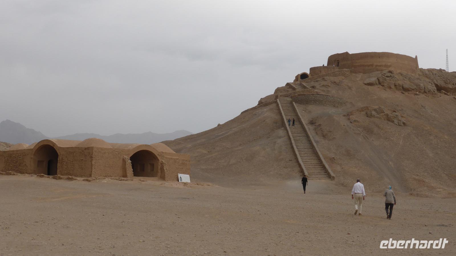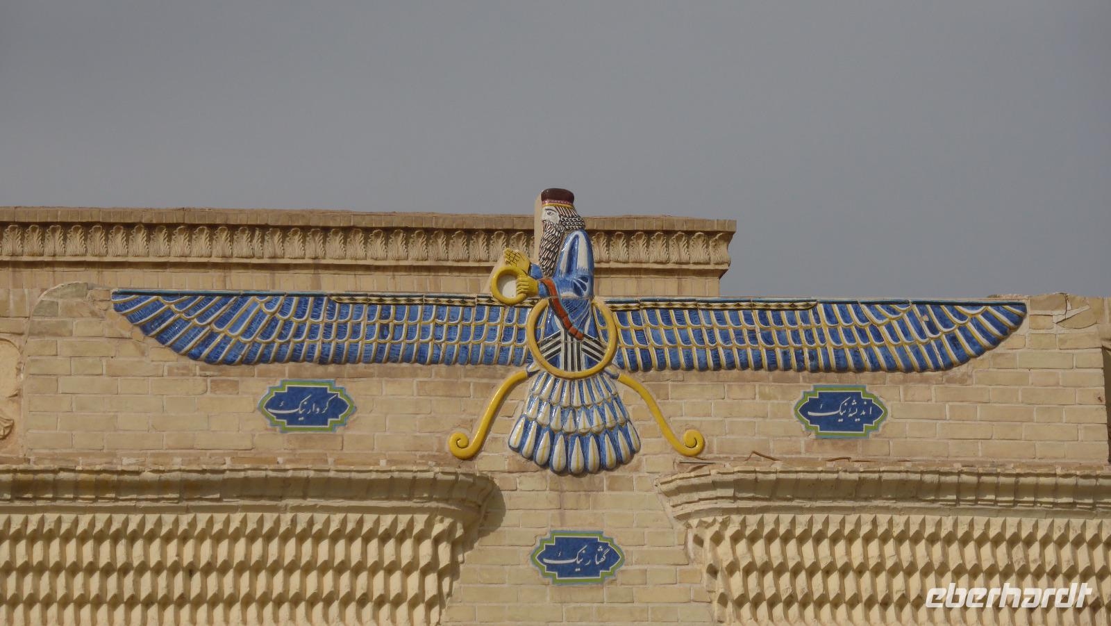 Yazd ist das Zentrum der Zoroastrier im Iran. Bei den sogenannten Türmen des Schweigens erfahren wir mehr über die Religion Zarathustras. Die Türme des Schweigens dienten als Bestattungsort der Zoroastrier. Dieses etwas sonderbare Ritual, den Geiern die Toten anzubieten wurde 1970 verboten, weil es viele Beschwerden aus der Bevölkerung gab. Da Yazd das Zentrum der iranischen Zoroastrier ist, befindet sich hier auch ihr Heiligtum, der Feuertempel mit dem ewigen Feuer. Das Symbol ihrer Religion, Faravahar genannt, ist am Tempel in farbigen Kacheln abgebildet.