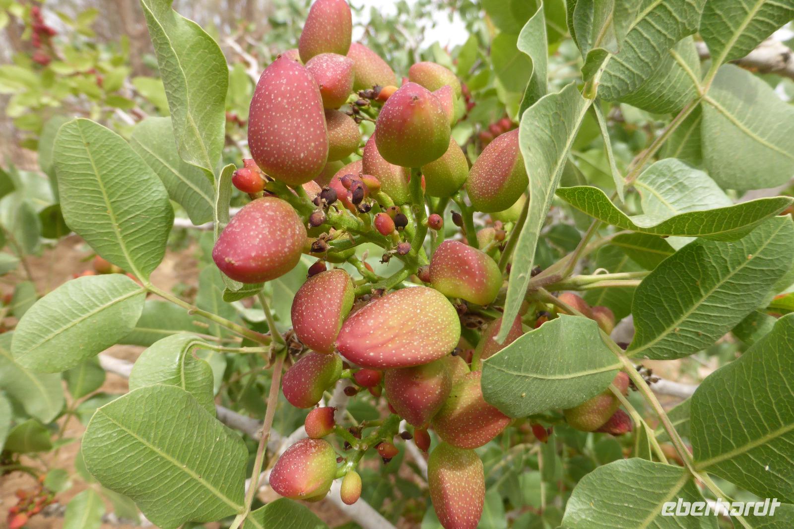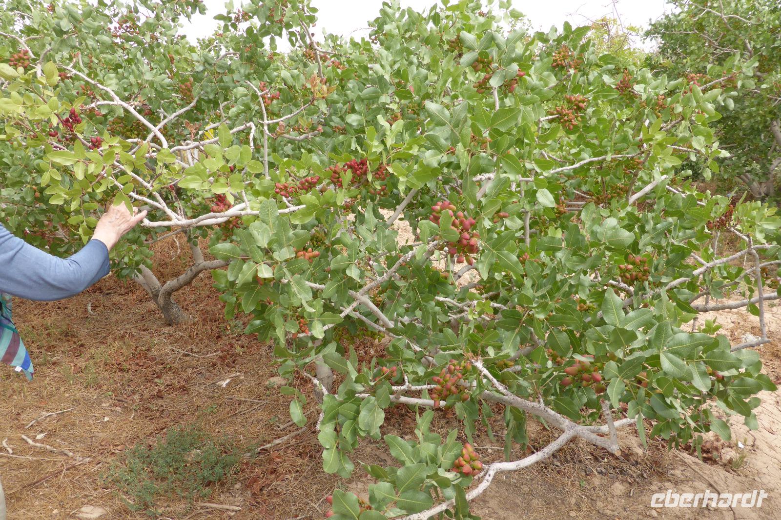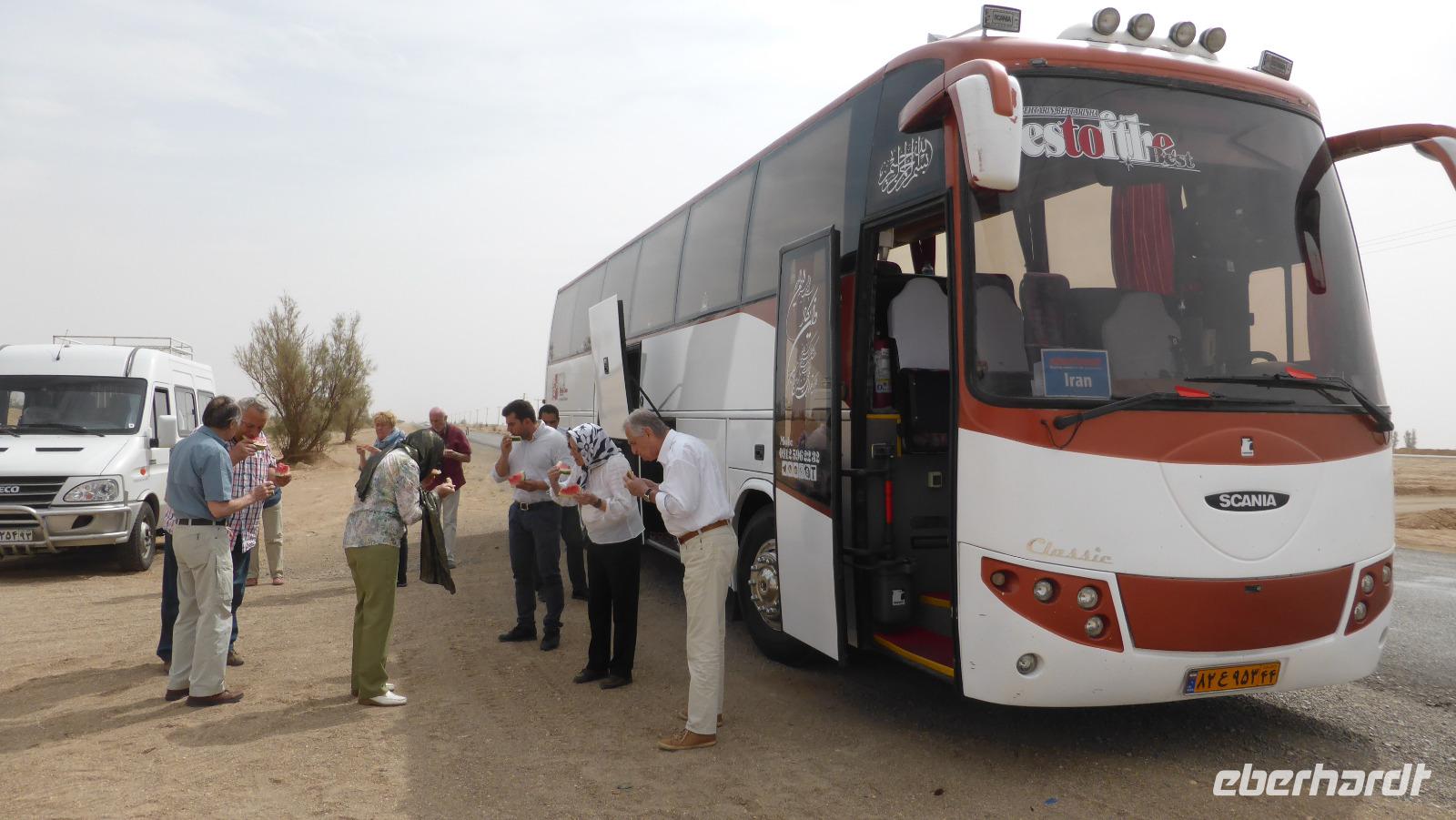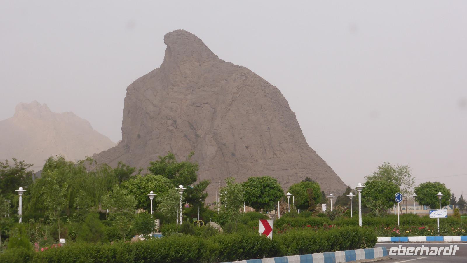 Bei unserer Abfahrt am Morgen grüßt uns eine freundliche Iranerin und fügt noch ein „I love you" hinzu. Hinter Yazd fahren wir durch eine imposante Berglandschaft. Einer ihrer Berge wird „Adlerberg" genannt, was aufgrund seiner Form leicht nachvollziehen ist. Später folgen den Bergen die weiten kargen Ebenen des Hochlandes, hin und wieder taucht etwas Grün auf wie zum Beispiel Plantagen mit Aprikosen und Granatäpfeln. Auch Pistazien werden hier angebaut. Diese schauen wir uns bei einem Halt am Straßenrand näher an. Hier lädt uns unserer Fahrer Omid noch auf eine Melone ein. Bei dieser Gelegenheit übergeben wir Omid unsere Beteiligung an seiner Geldstrafe, die er kurz vorher an die Polizei für nichtangeschnalltes Fahren zahlen mußte.