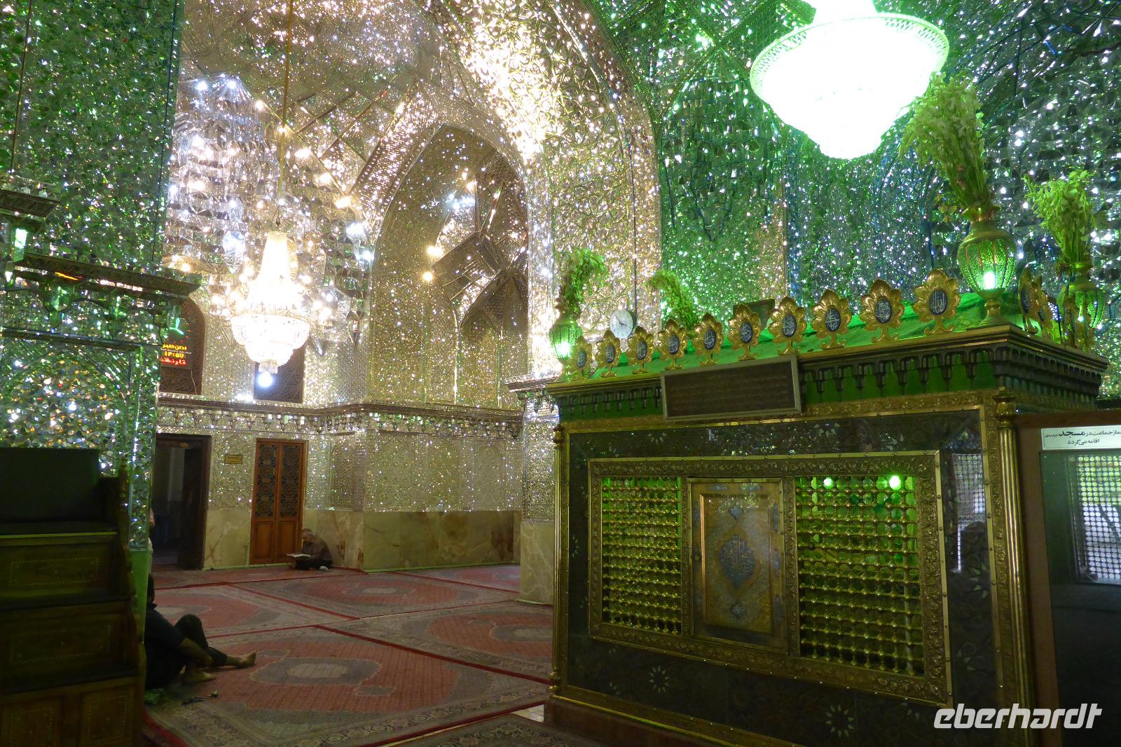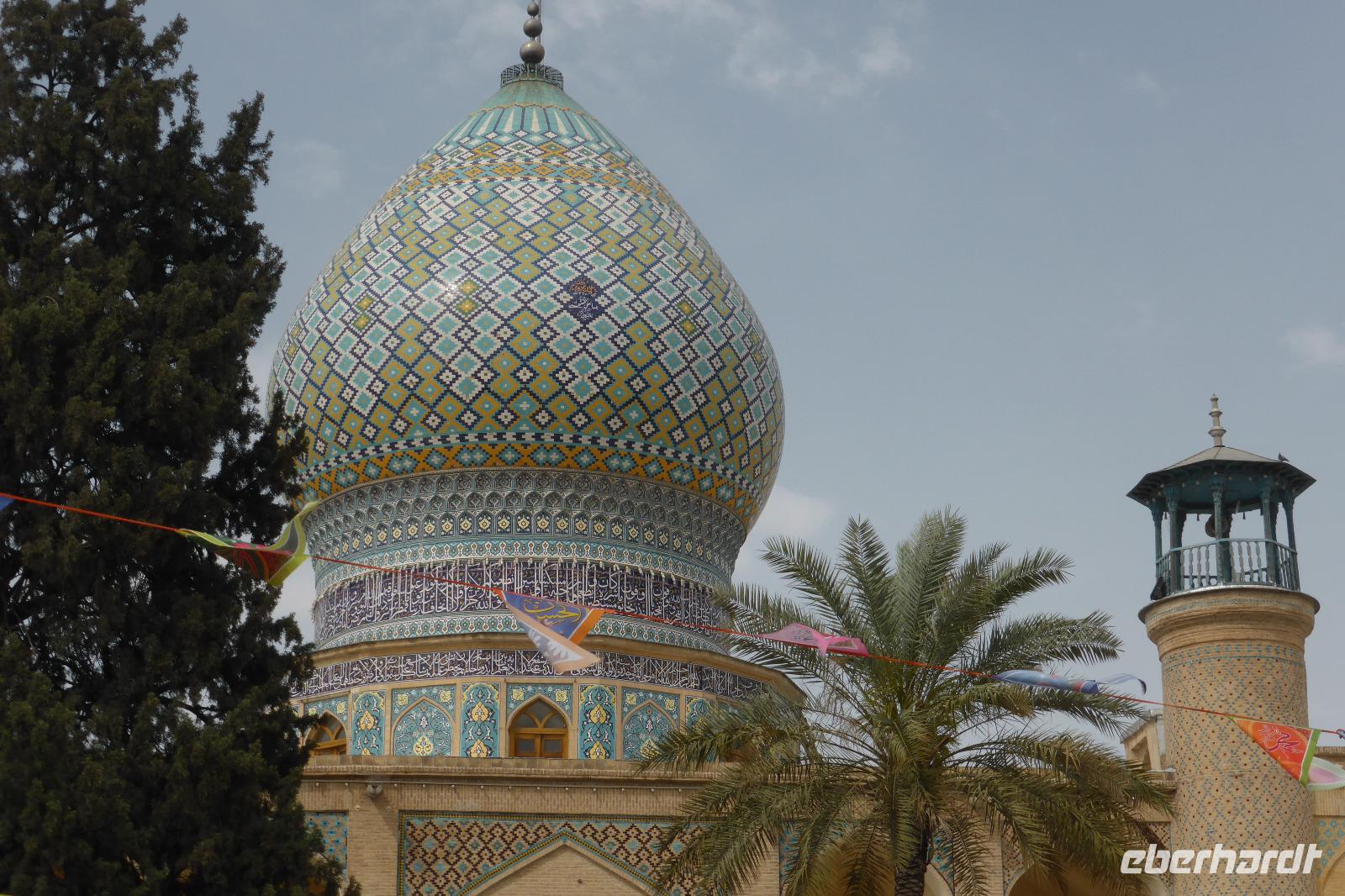 Eher als geplant erreichen wir am Nachmittag Shiraz. Zunächst besichtigen wir zusätzlich zum Programm das Ali-ibn-Hamdze Heiligtum. Hier wird ein Verwandter des 8. Imams der Schiiten verehrt. Wir haben die Möglichkeit, direkt in den verspiegelten Raum an den Schrein zu gehen. Der Schrein befindet sich unter einer wunderschönen knospenförmigen Kuppel mit farbigen Mosaiken.