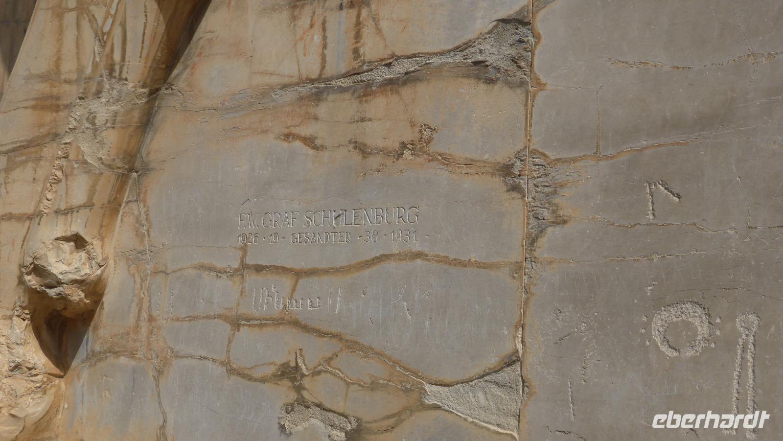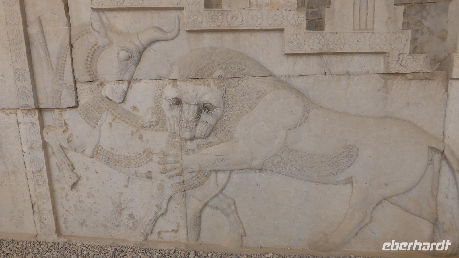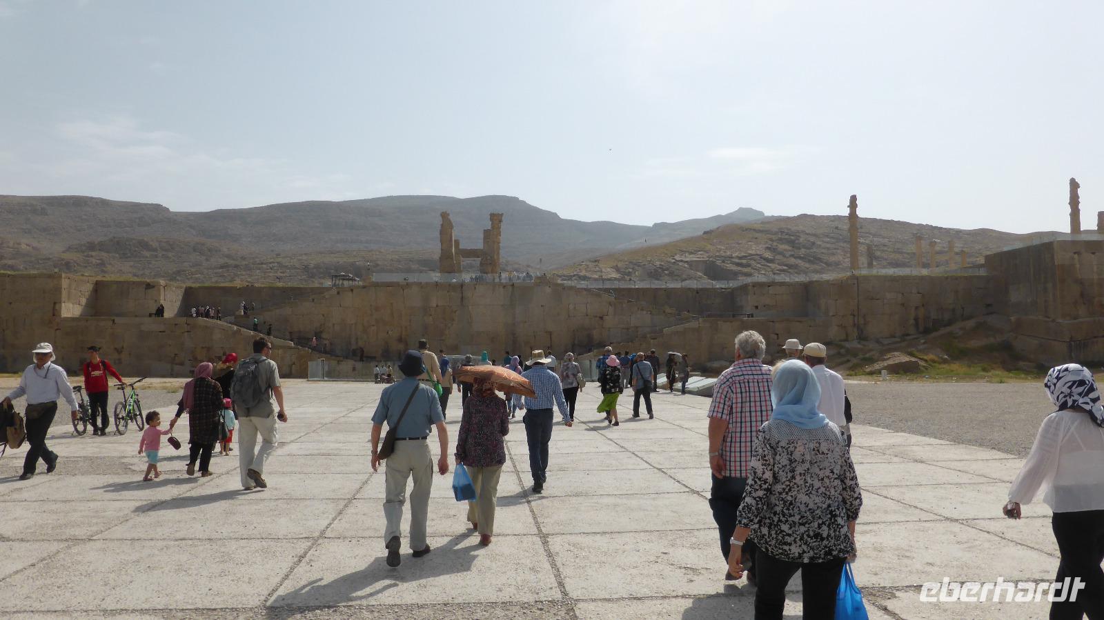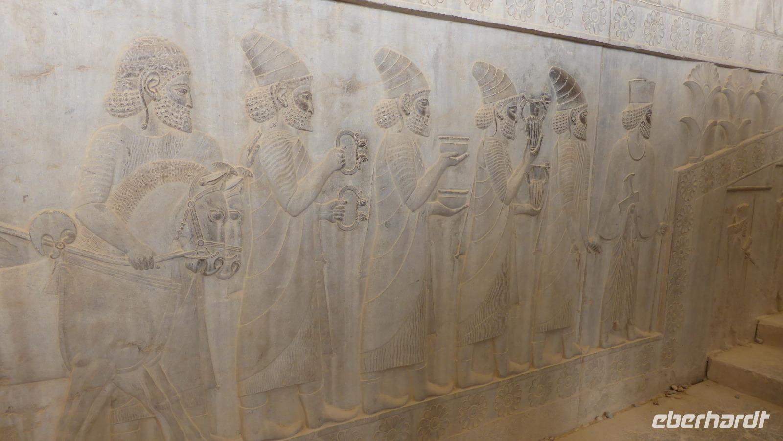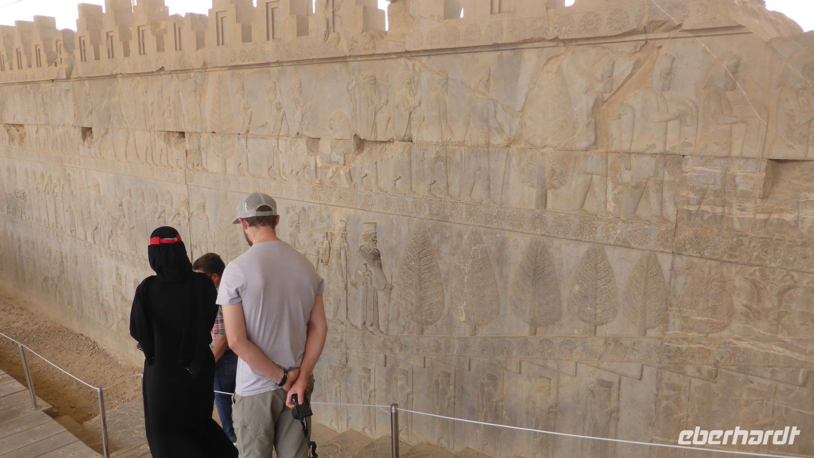 Unsere Besichtigung von „Parsa", griechisch „Persepolis", also „Stadt der Perser" beginnen wir mit dem Aufstieg über 111 Stufen und treten dann ein durch das sogenannte „Tor aller Länder". Es ist der gleiche Weg, welchen schon vor 2.500 Jahren die sogenannten Delegationen aller Länder aus dem Persischen Großreich nahmen. Auf der Hochterrasse von Persepolis erklärt uns Hamid viele Details. Wir besichtigen den 100-Säulensaal, die Audienzhalle (Apadana) sowie die Paläste von Dareios dem Stadtgründer und seinem Nachfolger Xerxes. Sehr gut erhalten und schön anzusehen sind verschiedene Reliefs wie der Kampf von Löwe und Stier und vor allem die Abbilder mit den Delegationen aus den verschiedenen Provinzen des Persischen Großreiches, deren Nationalität man gut anhand ihrer Kleidung und Geschenke bestimmen kann.