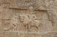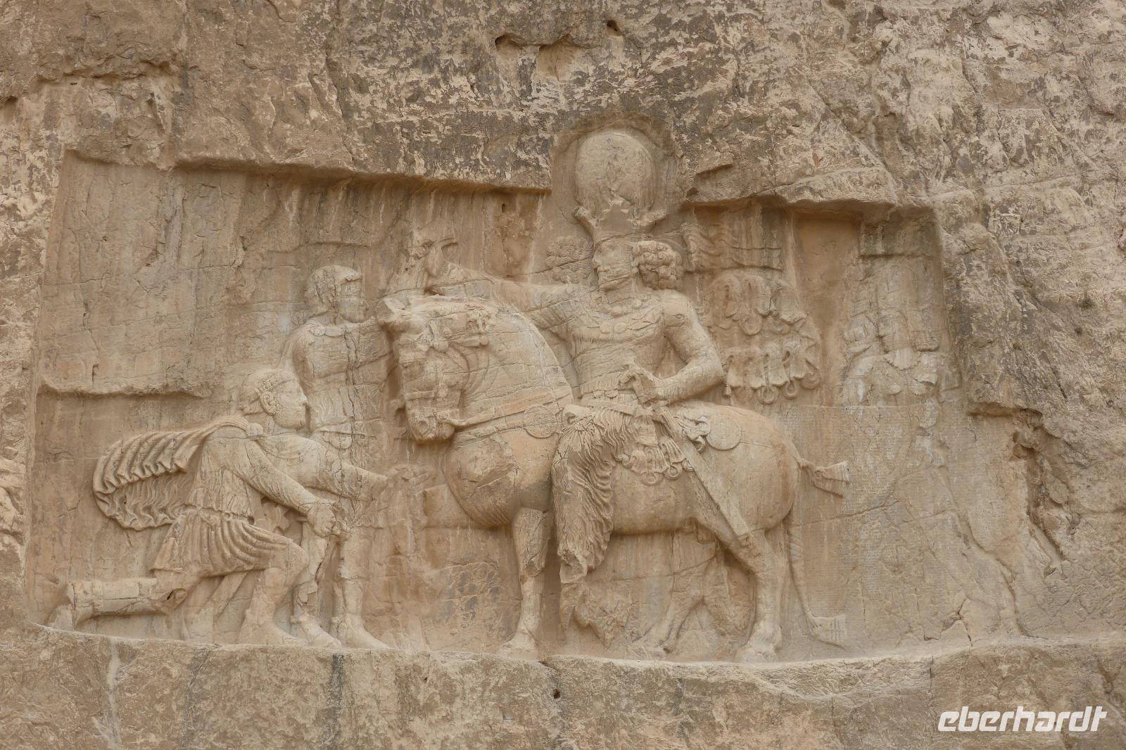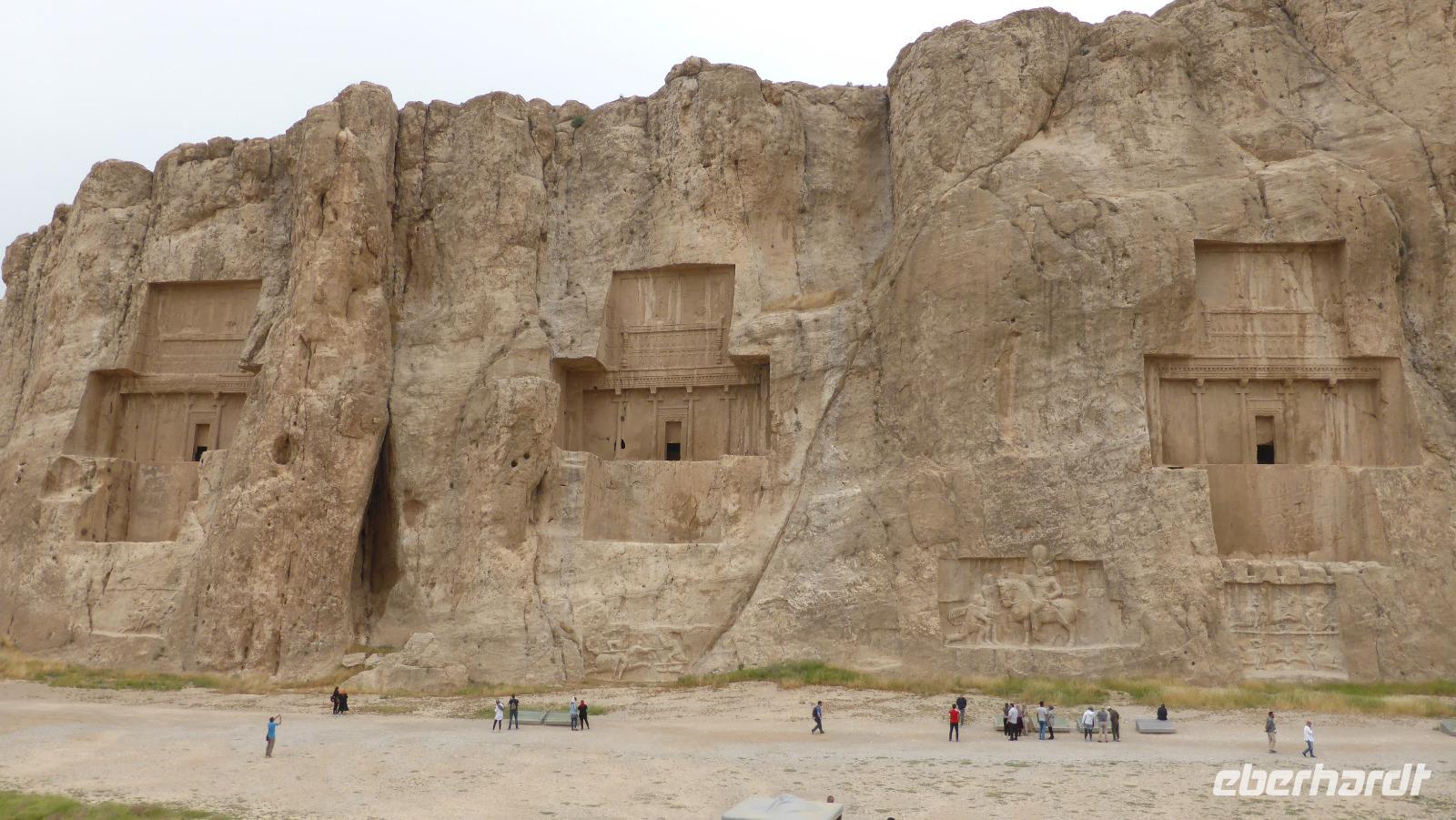 Hinsichtlich des Wetters haben wir noch großes Glück mit der Besichtigung, denn kurz danach kommt ein Sturm auf und bringt Regen. Nur 7 Kilometer an den Felsengräbern von Naqsh-e Rostam ist es trocken geblieben. Nach einer Kaffeepause erklärt uns Hamid die Nekropole Naqsh-e Rostam. Dareios und einige seiner Nachfahren wurden hier in monumentalen Felsengräbern bestattet. Die Sassaniden fügten später Reliefs unterhalb der Felsengräber hinzu. Oft geht es dabei um den erfolgreichen Kampf gegen die Römer. Das bekannteste Relief zeigt den sassanidischen König Schapur I. mit seinem römischen Gefangenen Kaiser Valerian.