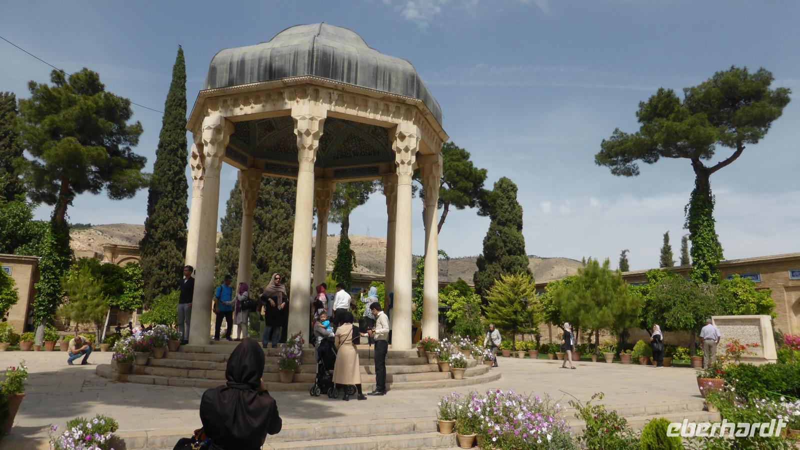 Wir bleiben noch bei den Dichtern und wenden uns Hafiz zu. Auch für ihn wurde in einer schönen Parkanlage ein Mausoleum errichtet. Sein Grab liegt unter einem Pavillon. Der 1389 verstorbene Dichter schrieb viele Gedichte über die Liebe und den Wein. Goethe interessierte sich so sehr für Hafiz, dass er sogar Persisch lernte, um ihn besser zu verstehen. Hafiz Werke wurden so zur Anregung für den „West-östlichen-Diwan".