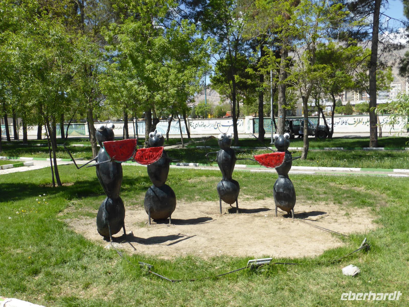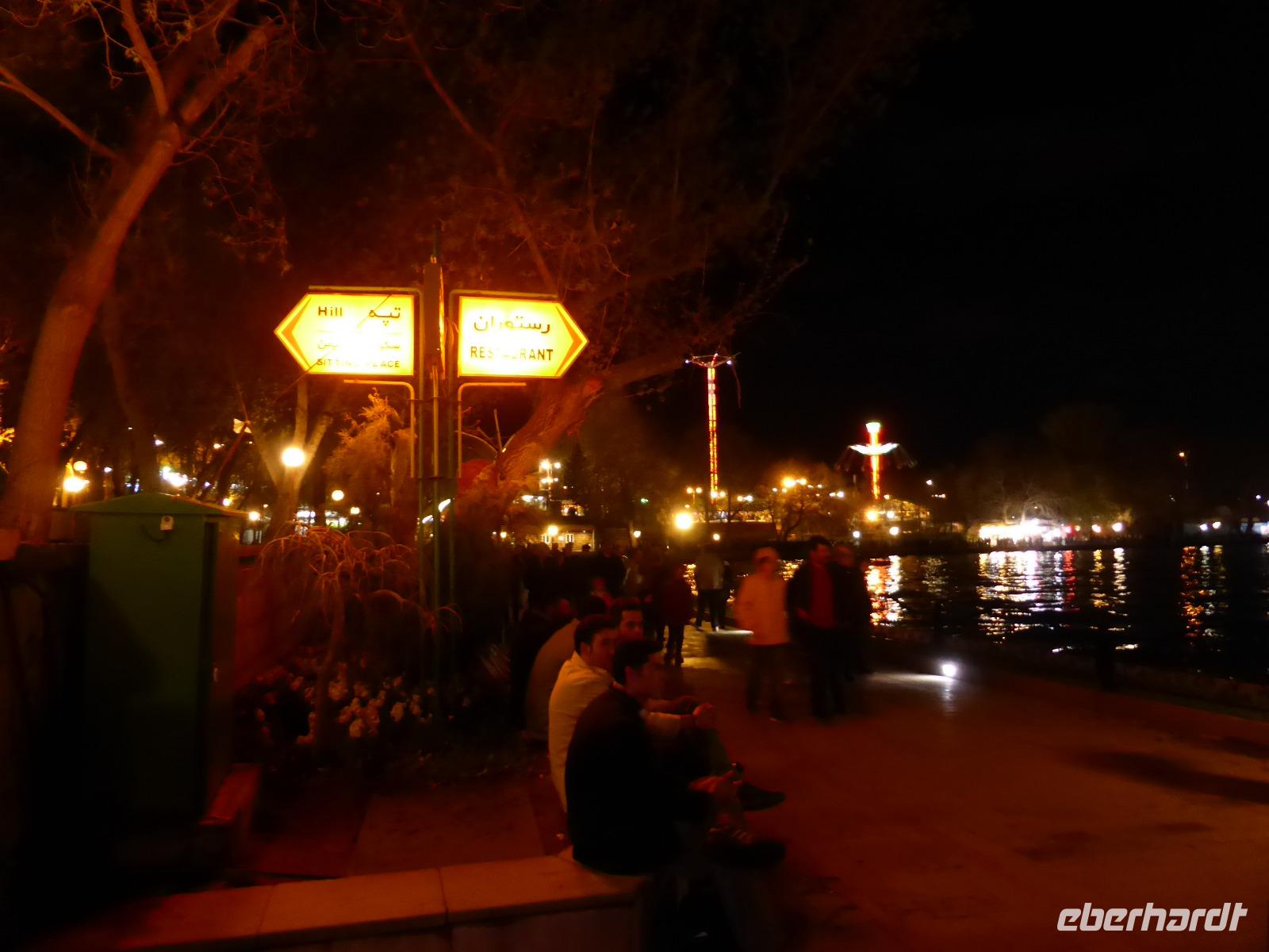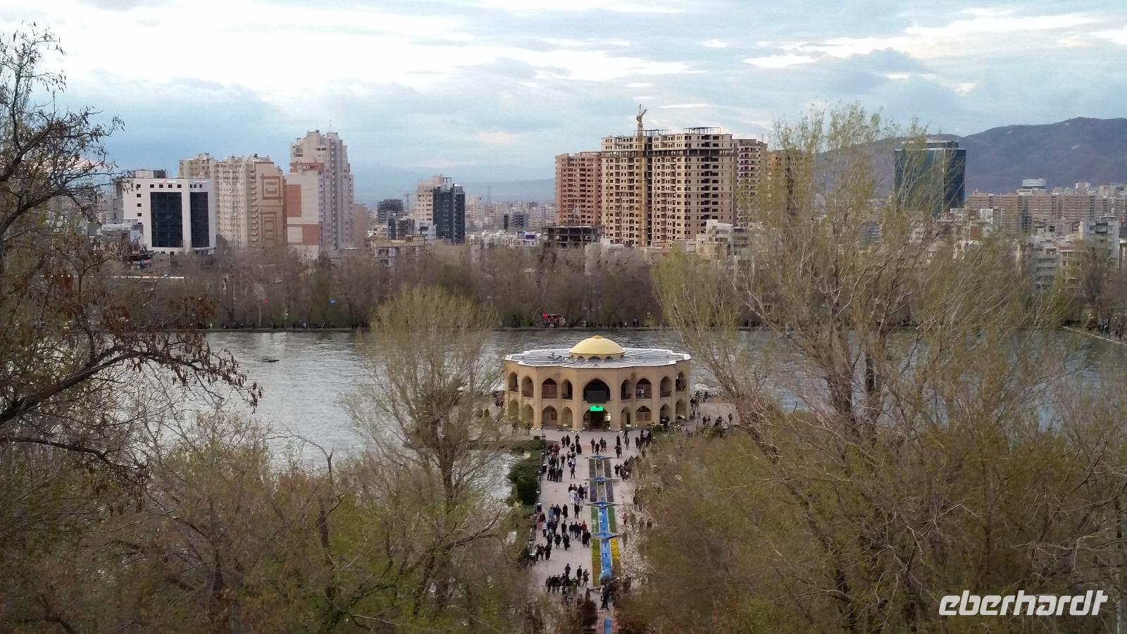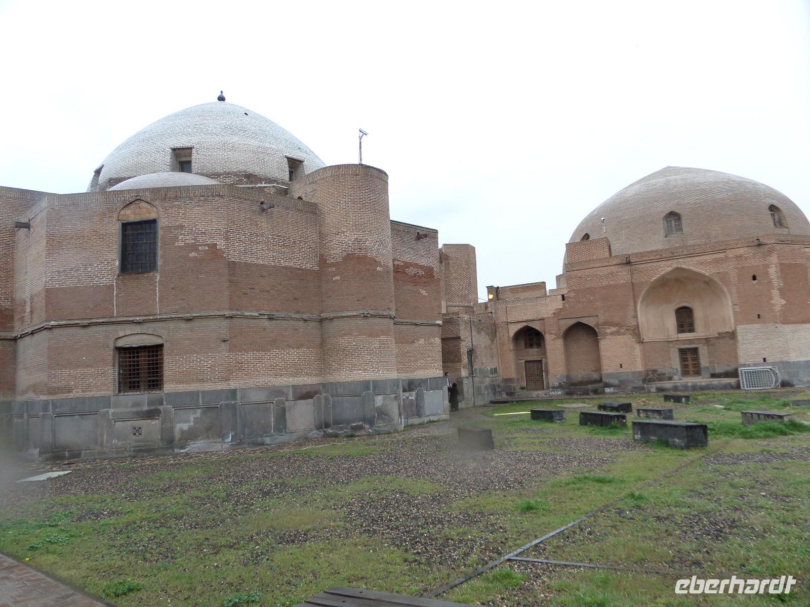 Die Gebeine des Heiligen wurden bis 1918 in der Thaddäus-Kirche aufbewahrt, dann stürmte die türkische Armee das Kloster und während der Plünderungen gingen sie verloren.Von der Thaddäus-Kirche fuhren wir anschließend wieder zu unserem Hotel nach Tabriz zurück. Nach einer Pause trafen wir uns an der Rezeption, um gemeinsam zum Abendessen in ein Restaurant inmitten des El-Goli-Parks zu gehen. Wir waren überrascht, wie viele Iraner den arbeitsfreien Tag für einen Bummel im Park nutzten. Wie auf der gesamten Reise, so stellte uns unser örtlicher Reiseleiter Sami, auch an diesem Abend wieder eine regionale Spezialität vor: „Kufte Tabrizi", ein 10 cm großer Reisball gefüllt mit Gewürzen, Wallnuss, Feigen und kleinen Fleischstückchen. Viele von uns bestellten diese Empfehlung. Allerdings waren die Portionen für einen normal Sterblichen viel zu reichlich! Sami sammelte das übrig gebliebene Essen säuberlich ein, um es später an arme Menschen zu verteilen. Eine Handlung, die nach jedem Abendessen zur Gewohnheit wurde und bei unserer Reisegruppe großen Anklang fand.
