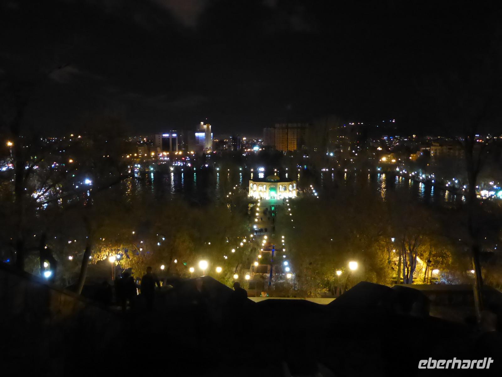Es beherbergt Ausgrabungsgegenstände, die bis ins 5.Jahrhundert v.Chr. zurückreichen. Der islamische Bereich umfasst Objekte aus dem 10. bis zum 17. Jh.. Insbesondere die Skelette eines Mannes und einer Frau aus der Eisenzeit blieben uns als die „Liebenden" in Erinnerung. Nach dem Besuch des Museums besichtigten wir die Blaue Moschee. Als sie gebaut wurde, war Tabriz die Hauptstadt einer turmenischen Stammesförderation. Der Komplex wurde in der zweiten Hälfte des 15.Jh. fertig gestellt und beherbergte eine Schule, eine öffentliche Badeeinrichtung und eine Bibliothek. Schwerer Schaden an den Gebäuden entstand beim Erdbeben im Jahre 1779, lediglich Teile der Moschee „Masjed-e Kabud" blieben erhalten. Der einmalige blaue Farbton ihrer Stalaktitendecke, der für sie auch namensgebend wurde, beindruckte uns besonders. Im Anschluss ging es zu unserem Hotel „El-Goli Pars" am Stadtrand von Tabriz, wo wir nach dem Zimmerbezug noch etwas Freizeit hatten. Das gemeinsame Abendessen fand im obersten Stockwerk des Hotels statt. Dabei schalteten die Ober für einen Moment das Licht aus, damit wir das Lichtermeer der zwei Millionen Einwohner zählenden Stadt fotografieren konnten.