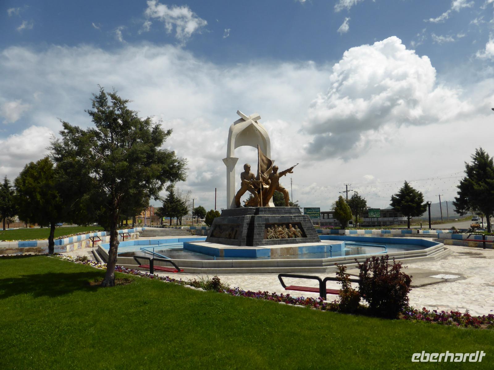 Bei unserem Tagesausflug an den Persischen Golf führte uns unsere Fahrtroute in Richtung Süden. Entlang der Straße konnten wir auf riesigen Plakaten Bilder der gefallenen iranischen Soldaten aus dem Irak-Iran- Krieg sehen. Am Straßenrand standen zur Erinnerung und Abschreckung ausgebrannte Panzer und Eisenbahnwaggons. Nach einiger Zeit sahen wir auf unserer rechten Seite eine riesige Salzlagune, welche sich fast bis an die Stadtgrenze von Khorramshahr erstreckte. Dort angekommen, hielten wir am Kriegsmuseum und hatten auch vor, dieses zu besichtigen. Leider war es aufgrund eines Feiertages geschlossen. So blieb uns nur der Blick über den Zaun auf den Außenbereich des Museums.