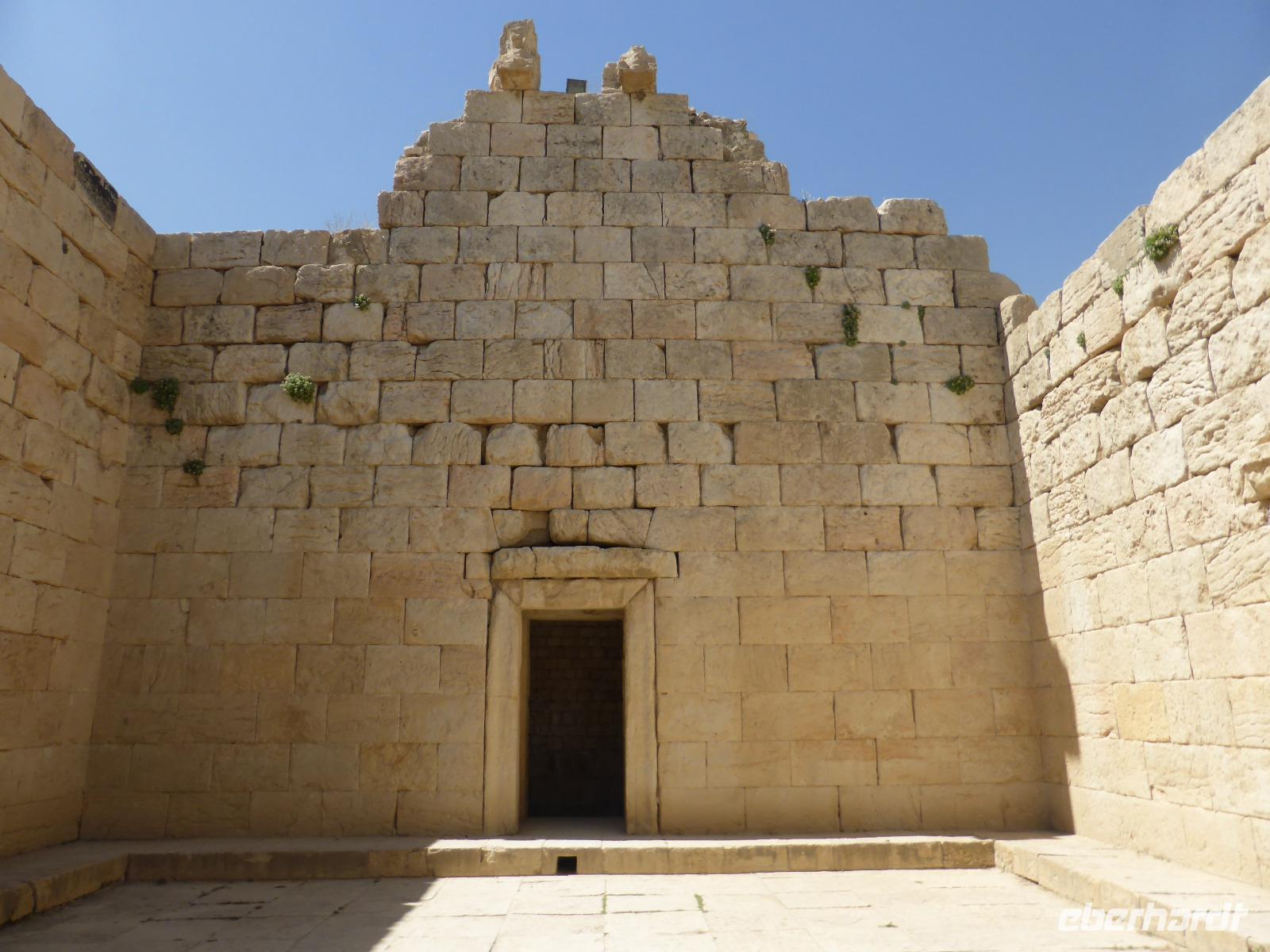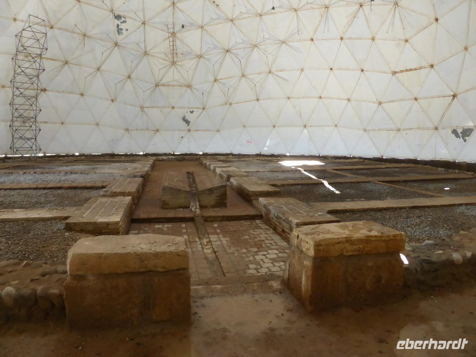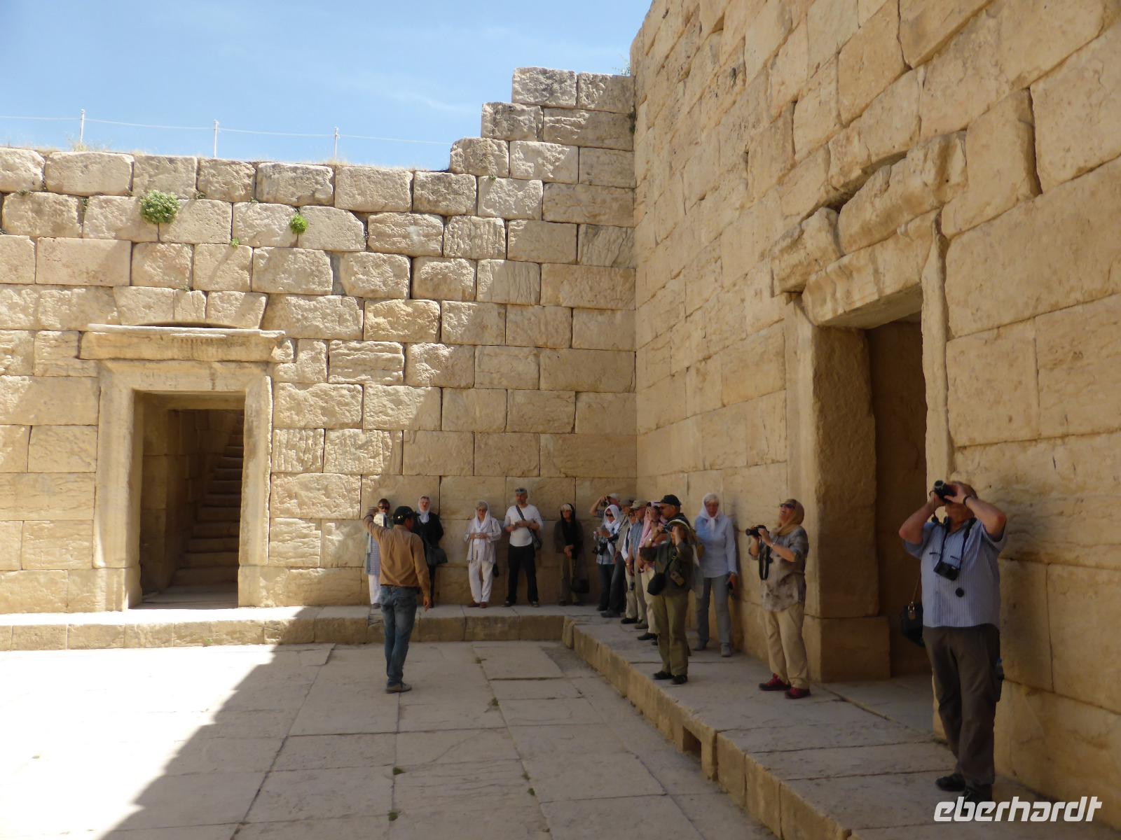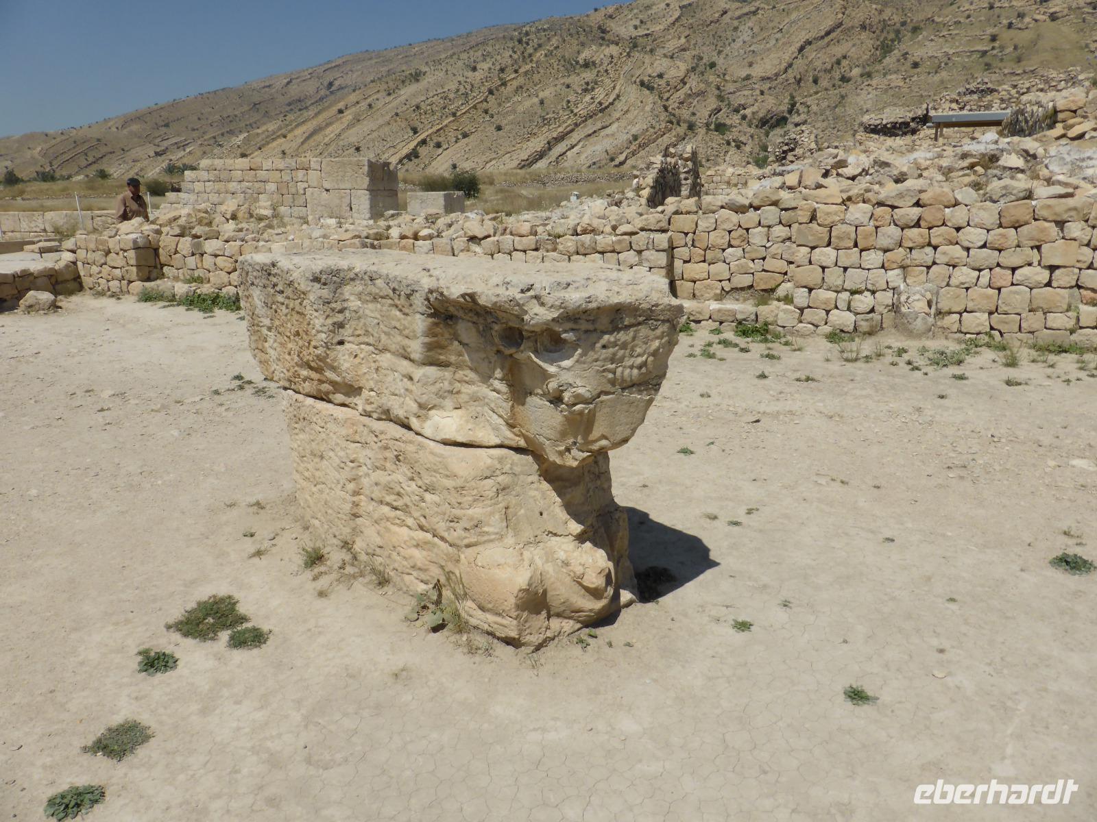 Unweit der Schlucht befindet sich der Zugang zur sassanidischen Residenzstadt Bishapur. Sie wurde von Shapur I. im Jahre 266 neu gegründet, war aber schon in elamitischer und parthischer Zeit besiedelt. Die Stadt wurde nach einem schachbrettartigen Plan angelegt und besaß in ihrem Zentrum einen Palast in Form einer kreuzförmigen Anlage, welche die vier zoroastrischen Naturgewalten, Feuer, Erde, Luft und Wasser, verkörperte. An der Wand sahen wir noch Reste der einstigen Bemalung sowie auf dem Fussboden Reste antiker Fliesen. Auch den Palast von Valerian, in dem der römische Kaiser von Shapur I. gefangen gehalten wurde, zeigte uns Sami aus der Ferne. Nach der Besichtigung der Palastruinen stiegen wir zum Anahita-Tempel hinab. Er war der Fruchtbarkeitsgöttin geweiht und das Wasser hatte bei den Sassaniden eine hohe Symbolkraft. Selbst die Könige konnten nicht so ohne weiteres den Tempel betreten.