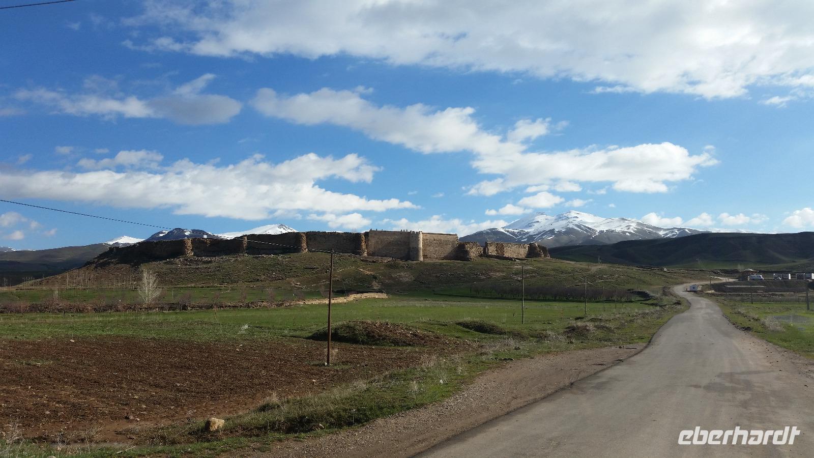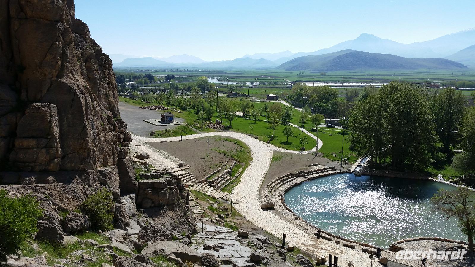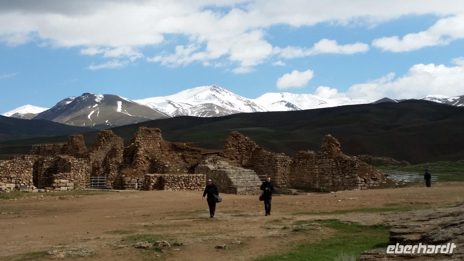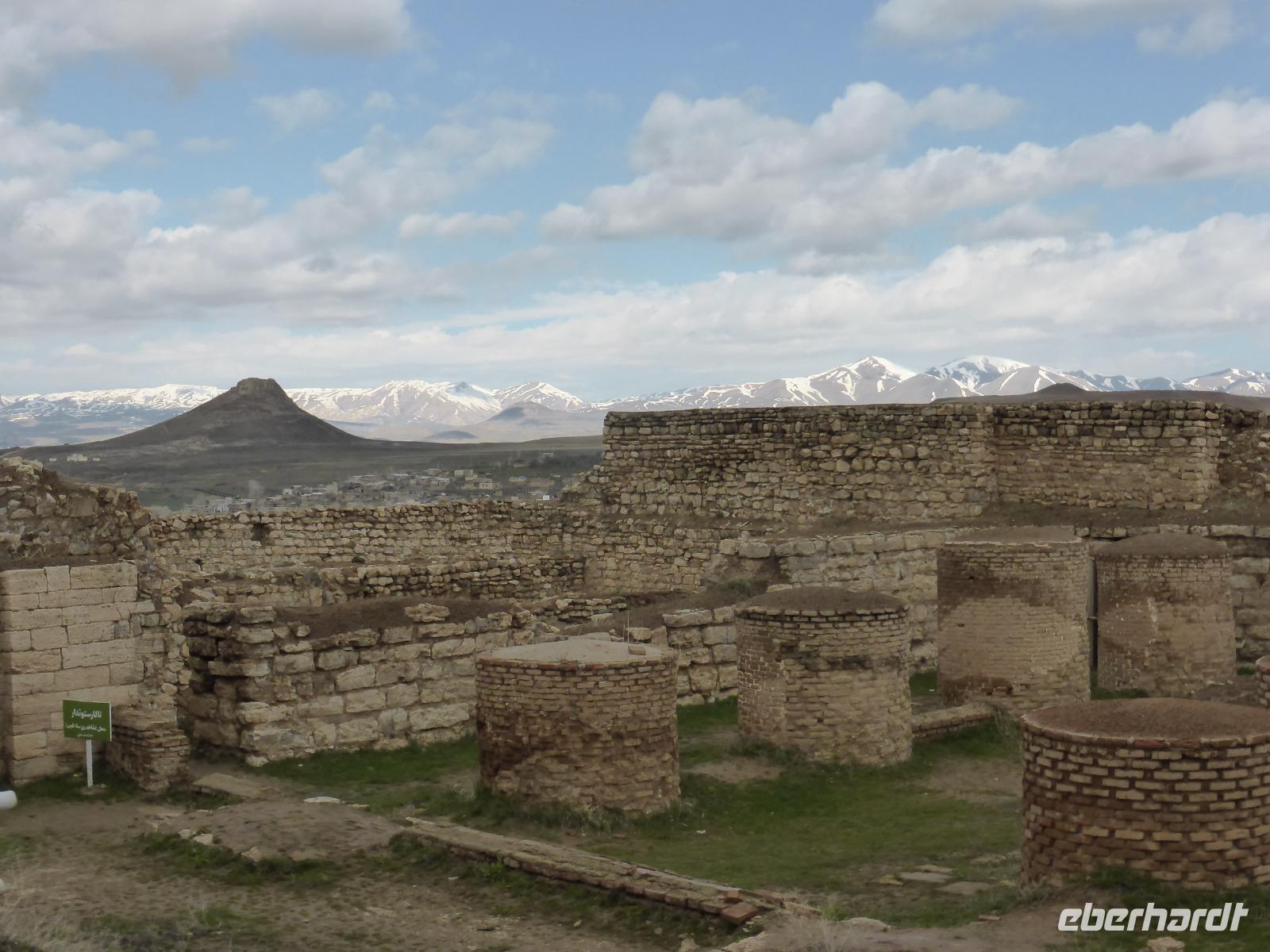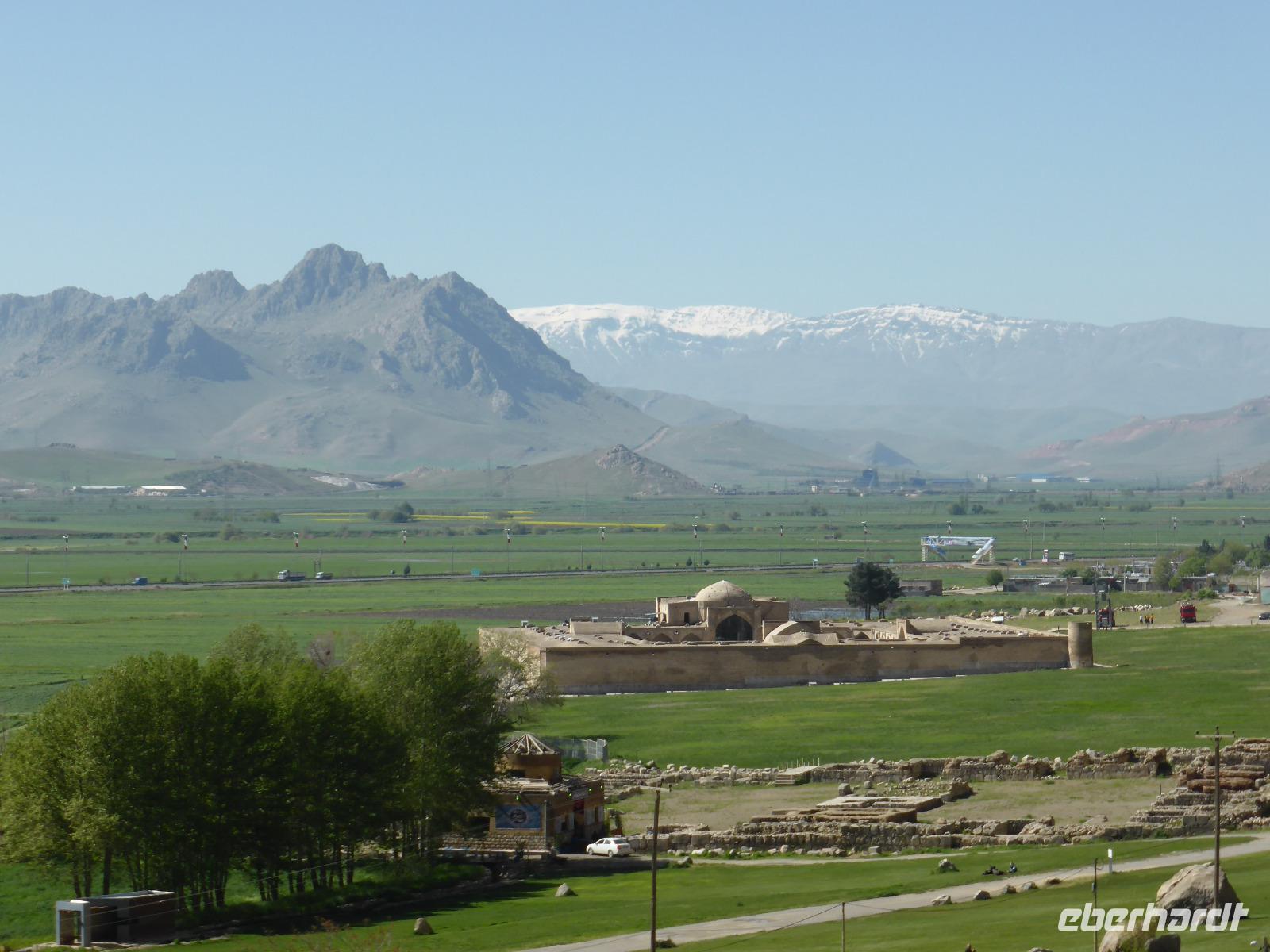 Von Takab aus ging es ein kleines Stück in nordöstliche Richtung zum Feuerheiligtum von Takh-e Suleyman. Es handelt sich hierbei um einen Palast mit Feuer- und Wassertempel aus der späten Sassanidenzeit und der dazu gehörenden Befestigungsanlage, welche die gesamte Anlage umschießt.