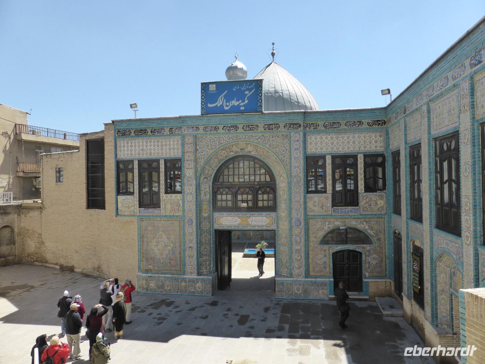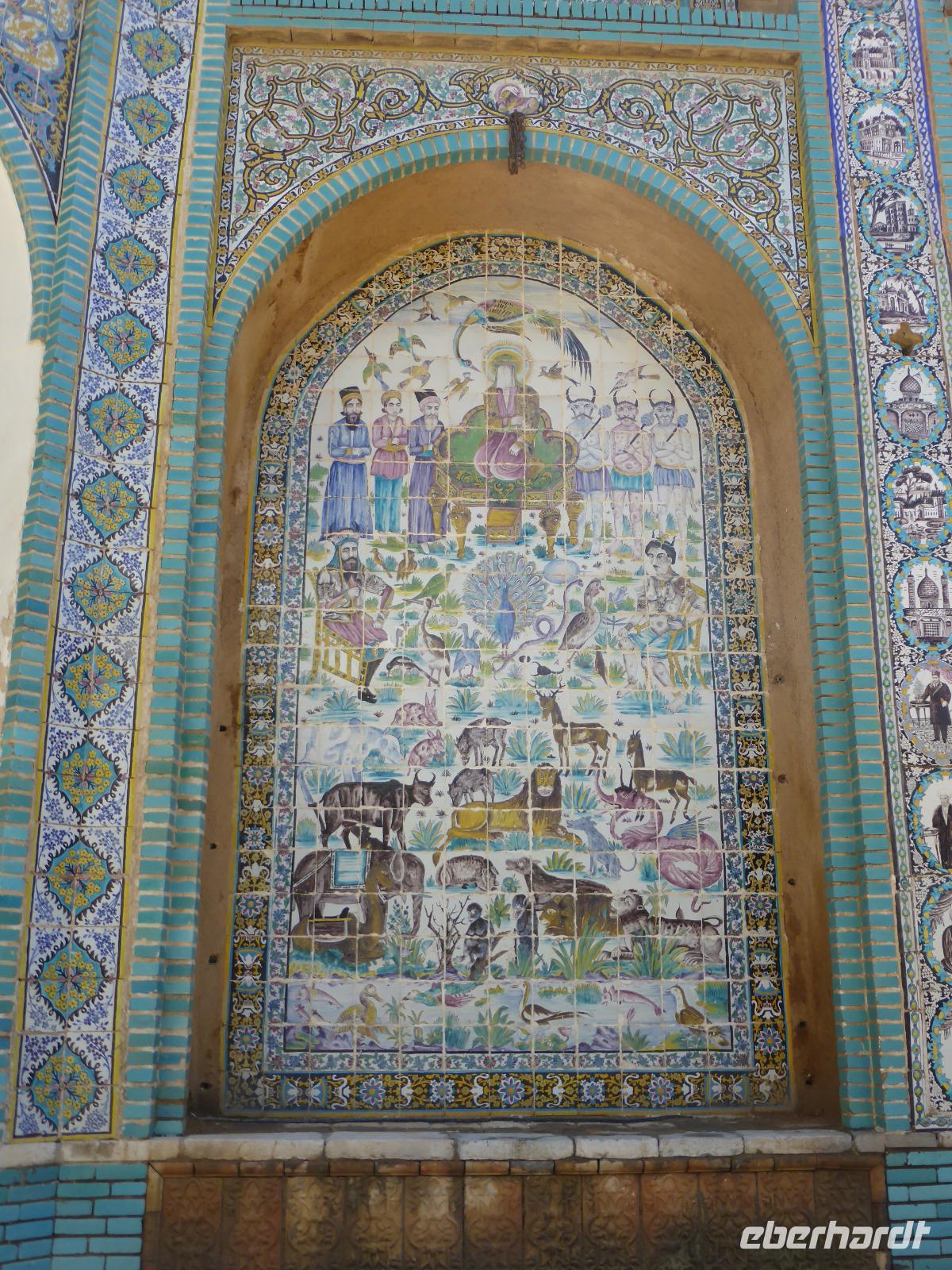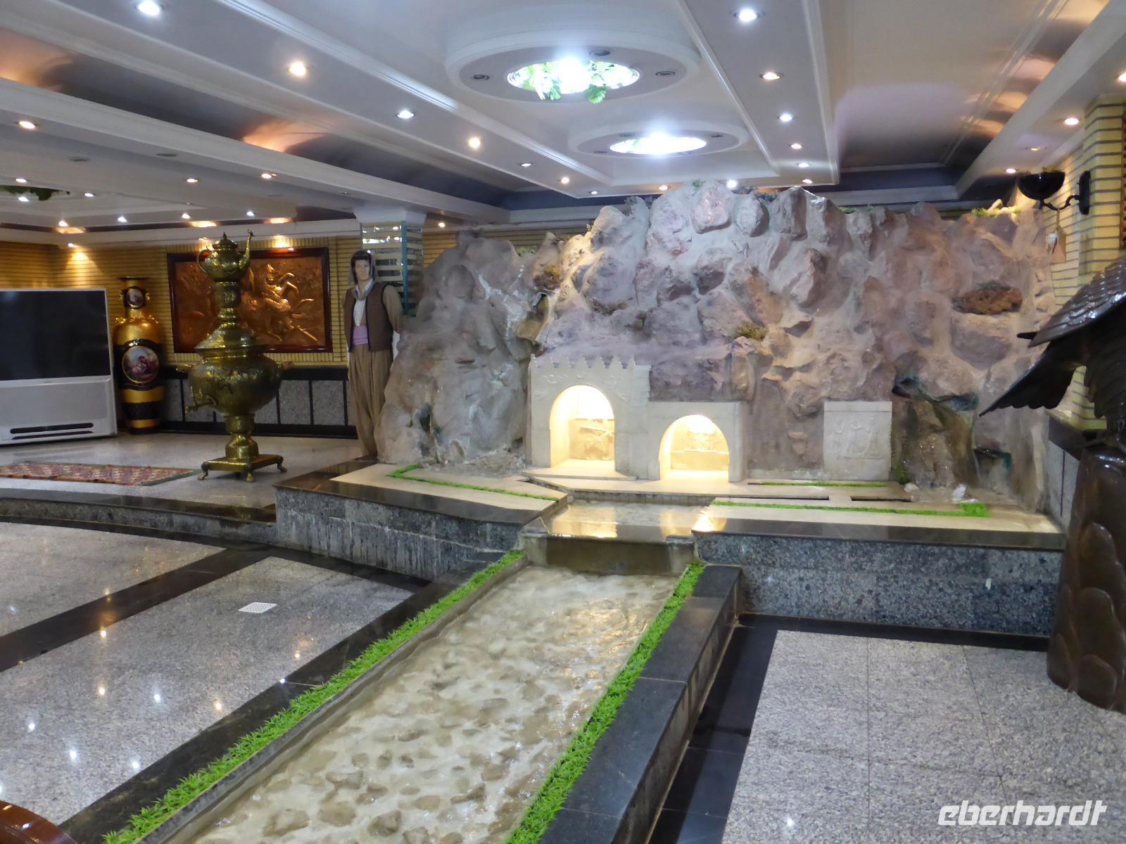 Von Bisotun aus fuhren wir nach Kermanshah zurück, um den Tekiyeh Maoven ol-Molk-Komplex zu besichtigen. Er wurde für die Passionsspiele im Gedenken an den Tod Imam Hoseyns (680) bei Kerbala Ende des 19.Jh. errichtet. Besonders beeindruckend sind die vielfarbigen Fliesenbilder, welche die Vorgänge der Schlacht darstellen. Nach der Besichtigung fuhren wir zu den Grotten von Taq-e Bostan. Die beiden Grotten wurden am Stadtrand von Kermanshah in den Fels geschlagen und stammen aus sassanidischer Zeit. Die Anlage gehörte einst zu einem Paradeisos, dessen Lehmziegel-Einfriedung teilweise noch erhalten ist. Die Felsreliefs in den beiden Grotten zeigen die Investituren von Ardaschir II., Schapur III. und Chosrau II. sowie Jagdszenen aus der Zeit Chosrau des II.. Nach dem Besuch der Anlage ging es zum Hotel zurück. Da bis zum Abendessen noch reichlich Zeit verblieb, beschlossen wir, zum Basar von Kermanshah zu fahren. Alle Gäste nahmen daran teil und wir orderten zwei Kleinbusse für den Tranfer. Sami zeigte uns den Goldbasar sowie anschließend den, die Sinne beraubenden, Gewürzbasar. Nach der Ankunft im Hotel hatten wir noch etwas Freizeit und trafen uns später zur Fahrt zum Abendessen im Restaurant des Hotels „Jamshid". Nach dem Essen spazierten wir noch einmal zu den Grotten von Taq-e Bostan, um diese beleuchtet zu sehen.