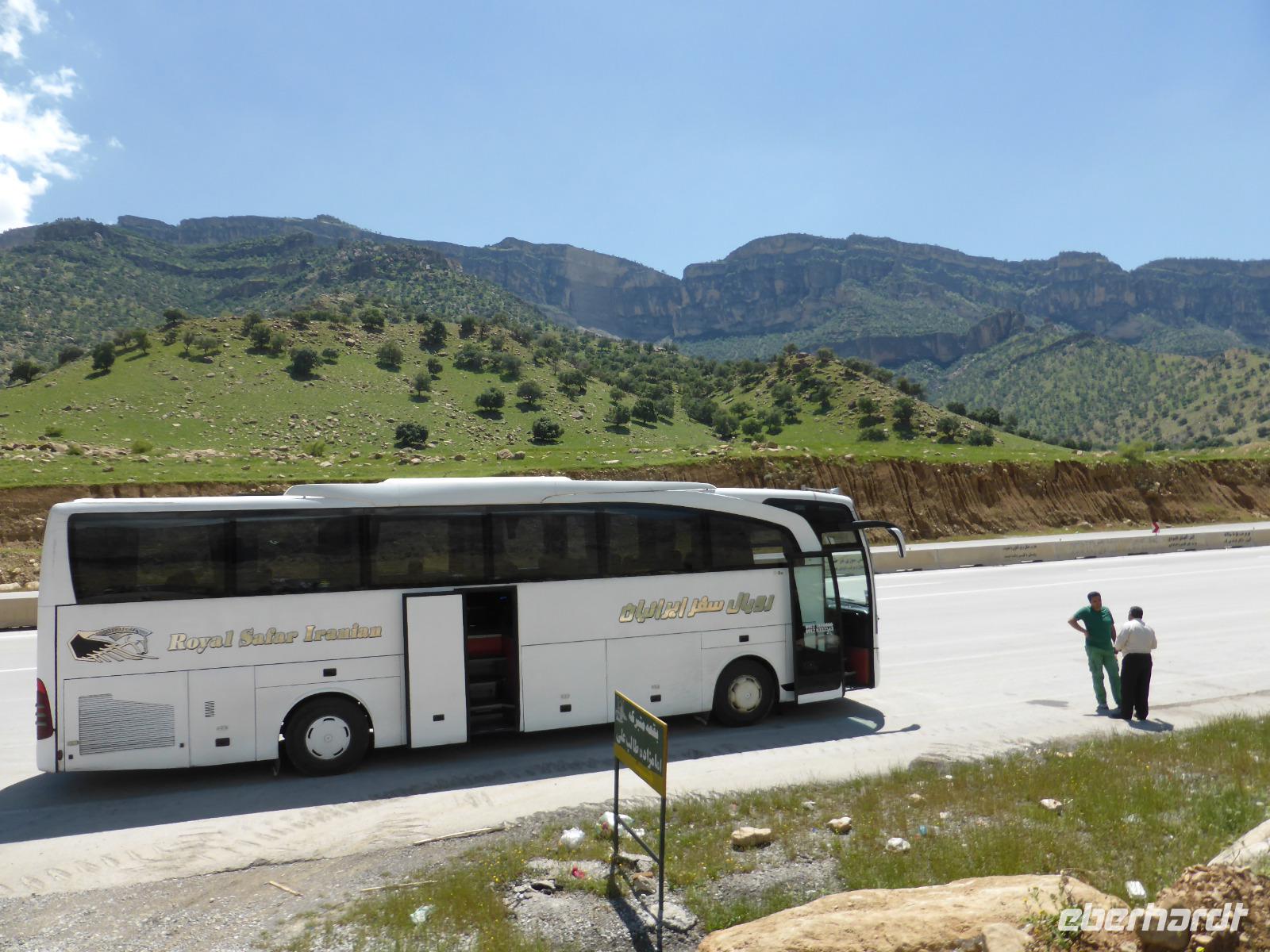 Am ersten Tag im Iran stand die Fahrt zur, im Elburzgebirge liegenden, Alamut-Festung auf dem Programm. Nach einer kurzen Nacht und einem ausgiebigen Frühstück fuhren wir um 08.00 Uhr in westliche Richtung los. Gegen 10.30 kamen wir auf dem Busbahnhof in Qazvin an. Die ca. 400.000 Einwohner zählende Stadt liegt direkt am Zusammenstoß von Zagros und Elburzgebirge. Am Busbahnhof organisierte Sami, unser örtlicher Reiseleiter, zwei kleinere Busse, mit welchen es weiter gehen sollte. Die beiden jugendlichen Fahrer schienen die Fahrt gelegentlich mit einem Wettrennen zu verwechseln. Glücklicherweise fehlte den Bussen letztendlich die dafür erforderliche Leistung. Die anfänglich öde Landschaft veränderte sich zunehmend in fruchtbare Weide- und Anbauflächen, welche sich entlang der Hänge zogen und sie in sattes Grün tauchte. Unseren ersten Halt machten wir in Rajayi Dasht, einem kleinen Ort, in welchem wir uns mit Obst versorgten. Unser geplantes Picknick nahmen wir anschließend am Evan-See ein, bevor es mit den beiden kleinen Bussen weiter nach Alamut ging. Als wir dort ankamen, begann es zu nieseln, so dass einige von uns nicht mit zur Festungsruine hinauflaufen wollten. Der Anstieg war recht beschwerlich, daher kehrte ein Teil von uns auf halber Strecke um. Diejenigen, die bis zur Festung gelaufen waren, wurden mit einem spektakulären Blick auf die umliegenden Bergketten belohnt. Es fehlte eigentlich nur die Sonne. Seit dem Ende des 11.Jahrhunderts war die Festung der Sitz der Assassinen, einer ismailitischen Gruppierung der persischen Nizariten, welche von hier aus durch Auftragsmörder 166 Jahre lang Angst und Schrecken verbreiteten. Die meisten ihrer Opfer waren sunnitische Muslime, darunter viele prominente Persönlichkeiten.