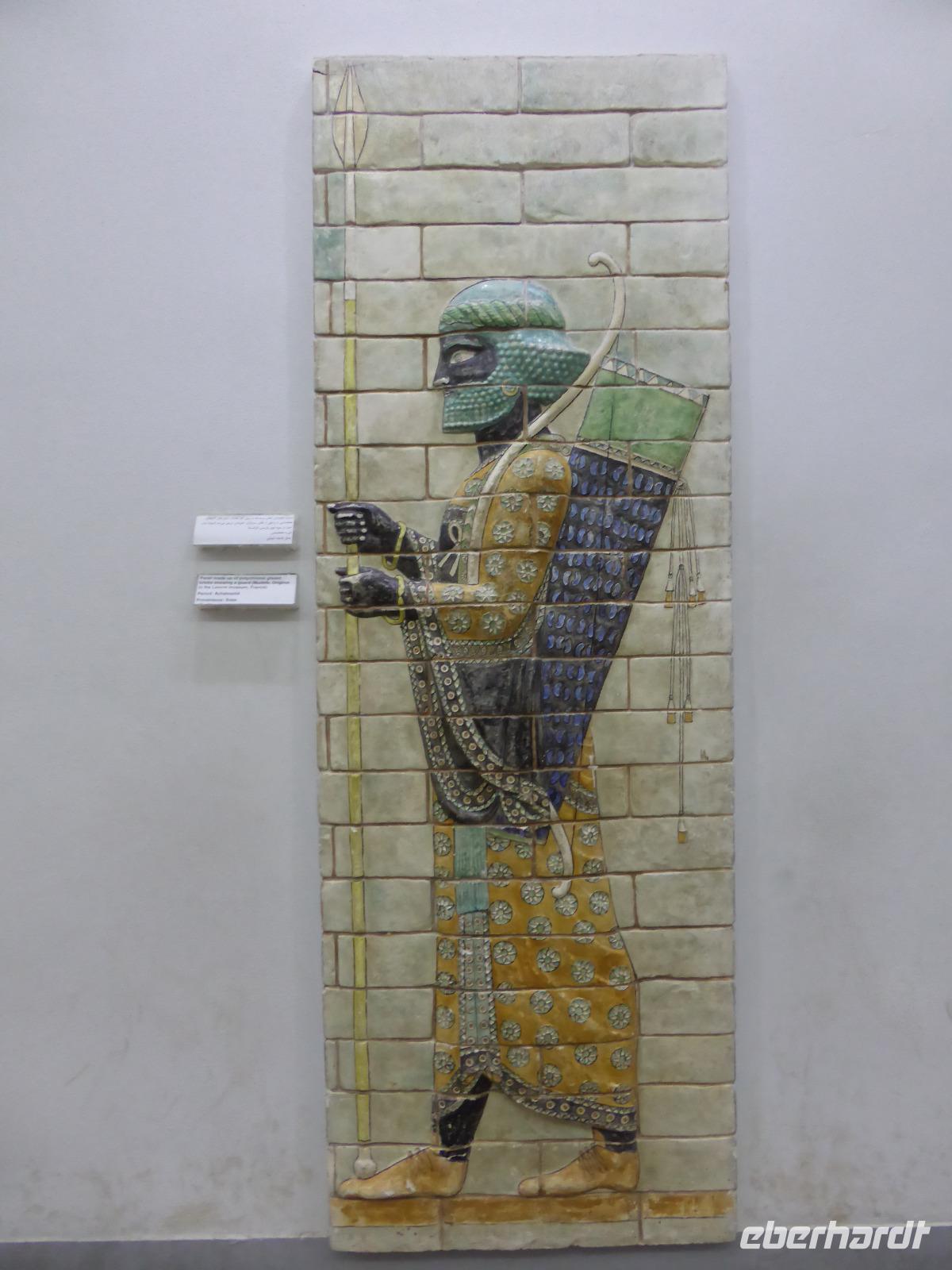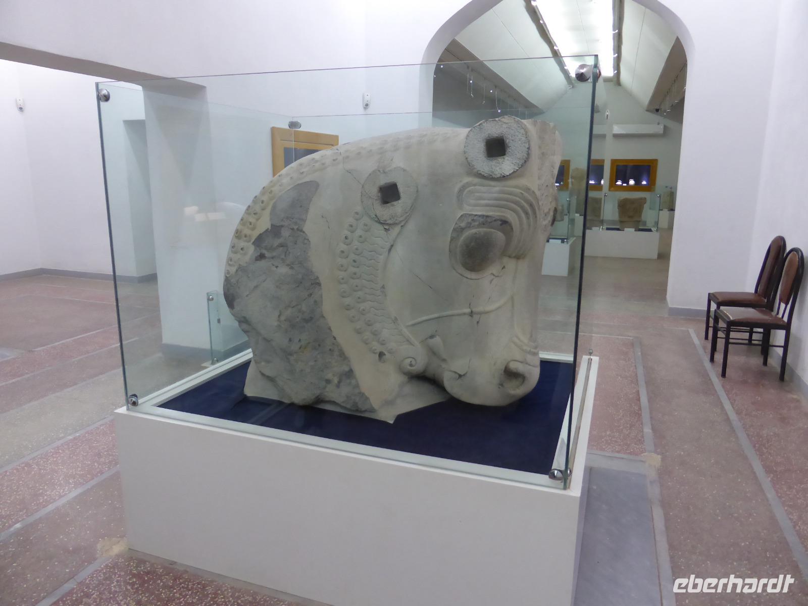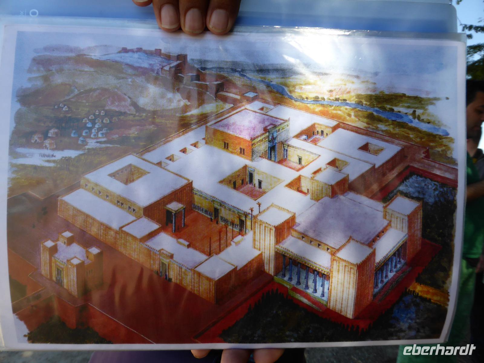 Zuerst besuchten wir das Archäologische Museum, in welchem Funde aus elamischer Zeit ausgestellt sind. Anschließend spazierten wir hinauf zu den Resten des Apadana-Palastes, ein Relikt aus der Zeit Darius des I.. Die Anlage kann als Vorläufer von Persepolis angesehen werden, da man dort aus den Fehlern, die man hier beim Bau machte, gelernt hatte. Sami organisierte uns einen Begleiter, der uns, während Sami erzählte, Bilder des ursprünglichen Palastes zeigte, so dass wir eine gute Vorstellung seiner Ausmaße und seines Aussehens bekamen und das bei Temperaturen über 30 Grad. Von dem ehemaligen Palastgelände ging es zum Fundort der Darius-Statue am Eingangstor und von dort zur Königsstadt.