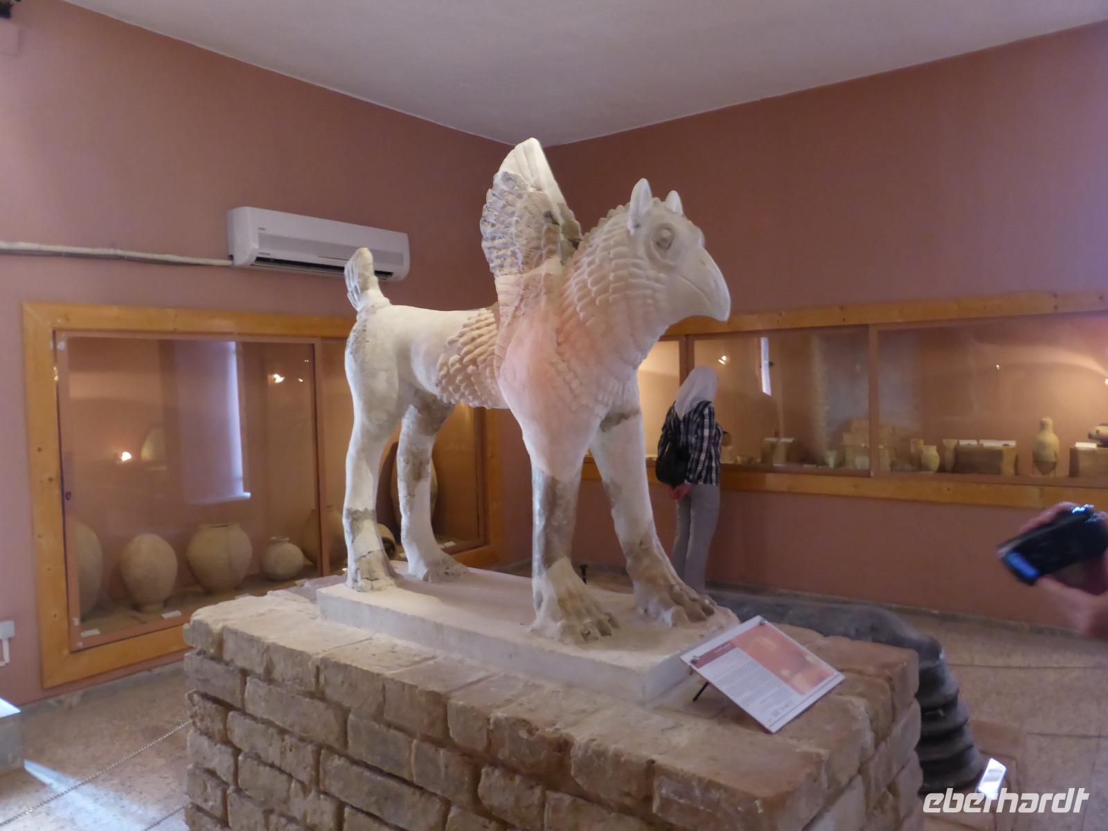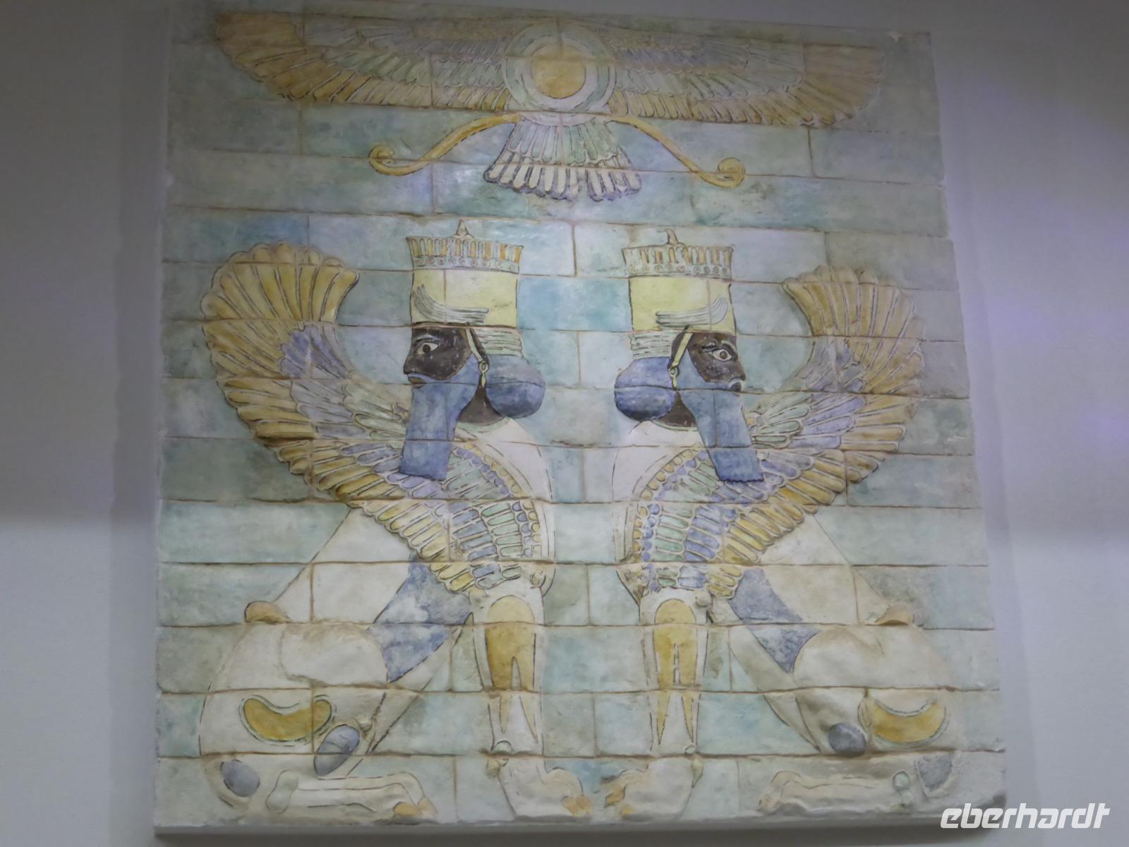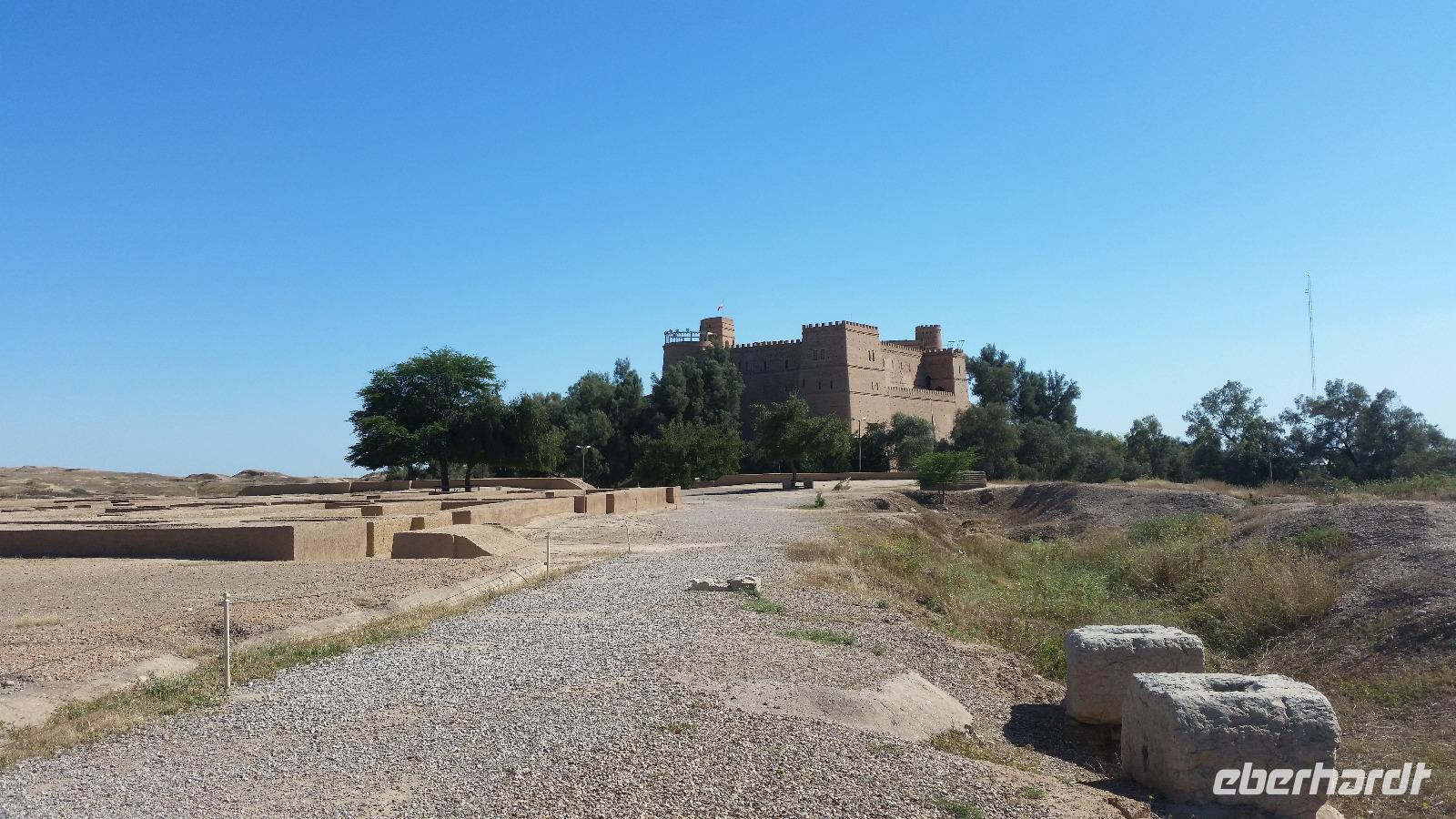 Zuerst besuchten wir das Archäologische Museum, in welchem Funde aus elamischer Zeit ausgestellt sind. Anschließend spazierten wir hinauf zu den Resten des Apadana-Palastes, ein Relikt aus der Zeit Darius des I.. Die Anlage kann als Vorläufer von Persepolis angesehen werden, da man dort aus den Fehlern, die man hier beim Bau machte, gelernt hatte. Sami organisierte uns einen Begleiter, der uns, während Sami erzählte, Bilder des ursprünglichen Palastes zeigte, so dass wir eine gute Vorstellung seiner Ausmaße und seines Aussehens bekamen und das bei Temperaturen über 30 Grad. Von dem ehemaligen Palastgelände ging es zum Fundort der Darius-Statue am Eingangstor und von dort zur Königsstadt.