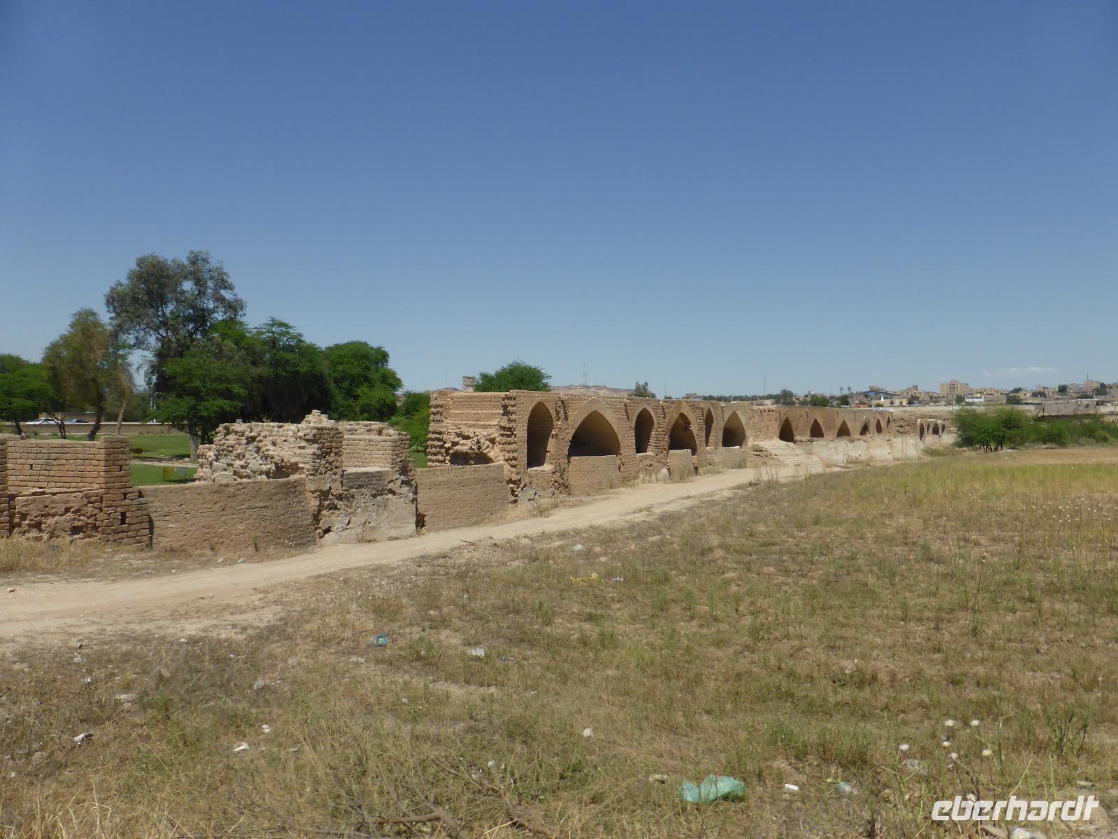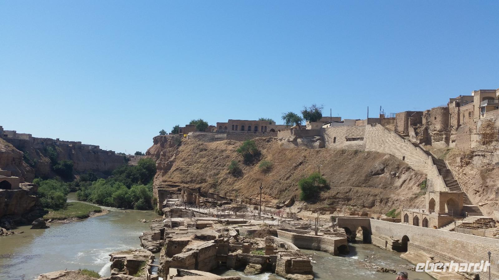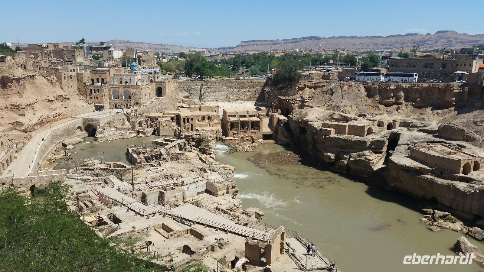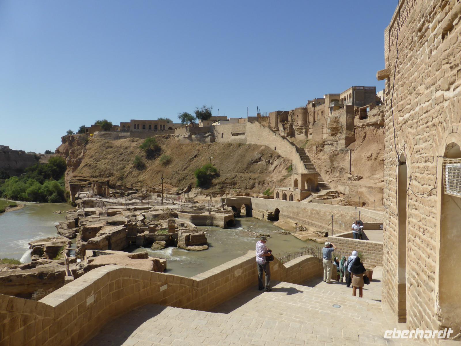 Nach kurzer Fahrt in nördliche Richtung hielten wir auf dem Weg nach Shushtar in einem kleinen Ort, um an einer Eisdiele süßes und cremiges Wasserbüffel-Eis zu probieren. Anschließend fuhren wir weiter nach Shushtar und stiegen oberhalb der historischen Wassermühlen aus. Die Stadt befand sich einst auf der Persischen Königsstraße, welche die elamische Stadt Susa mit dem achämenidischen Persepolis verband. Bereits im 1. Jahrtausend v. Chr. begann man künstliche Wasserfälle am Karun-Zufluss Gargar zu bauen. Diese Wasserkunst wurde von den Sassaniden ab dem 3.Jh. n.Chr. fortgeführt und bis zum heutigen Tag dienen einige Anlagen Bewässerungszwecken. Das Bewässerungssystem von Shushtra ist Teil des UNESCO-Weltkulturerbes. Besonders eindrucksvoll sind die Reste der einst ca. 40 Wassermühlen unterhalb des Gargar-Damms. Ohren betäubend brausen die Wassermassen in das Flussbecken hinunter. Anhand von Rekonstruktionen konnten wir uns ein gutes Bild von der Funktionsweise der Mühlen machen, die zumeist dem Mahlen von Getreide dienten. Danach fuhren wir zur Shadovan-Brücke, welche auch Kaiserbrücke genannt wird, da sie von römischen Kriegsgefangenen gebaut wurde. Sie ist ein gutes Beispiel römischer Ingenieurbaukunst, welche von den sassanidischen Baumeistern fortan meisterhaft kopiert wurde.