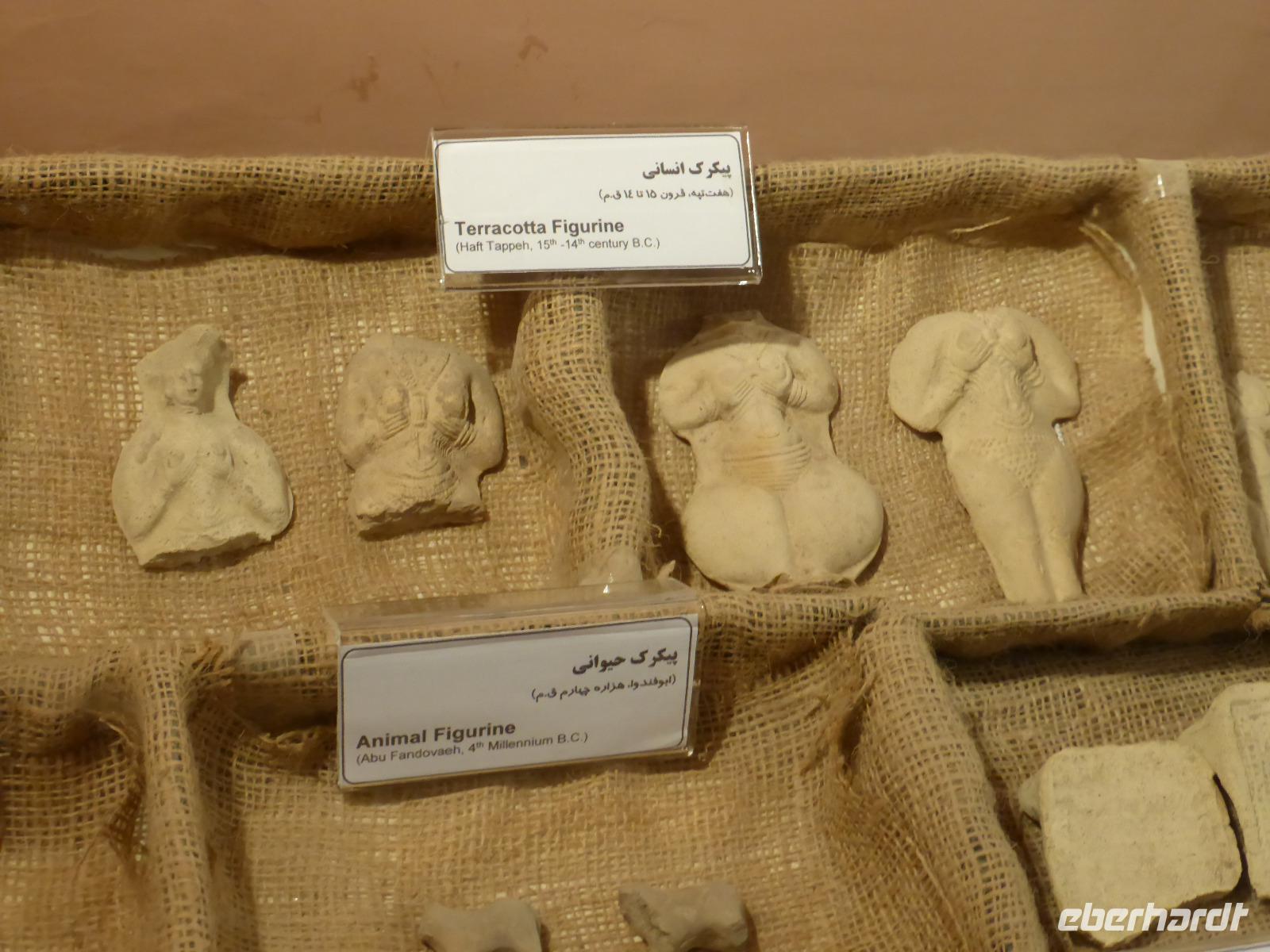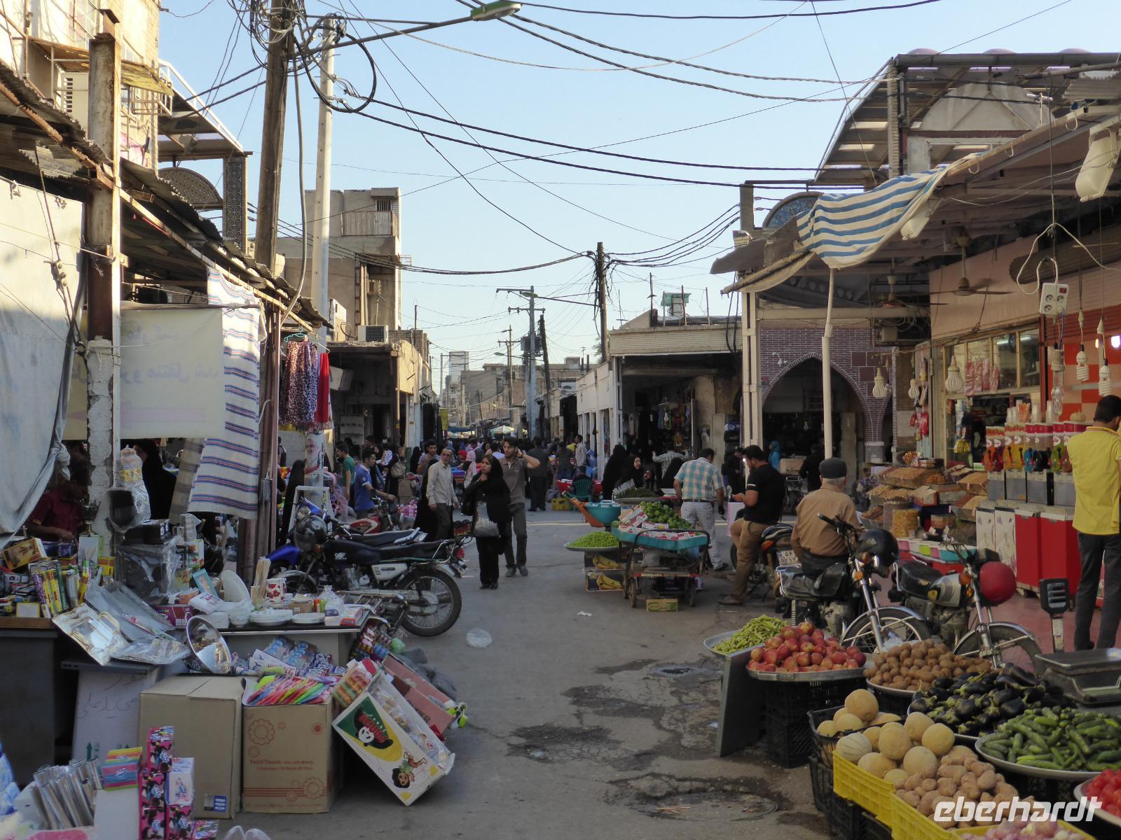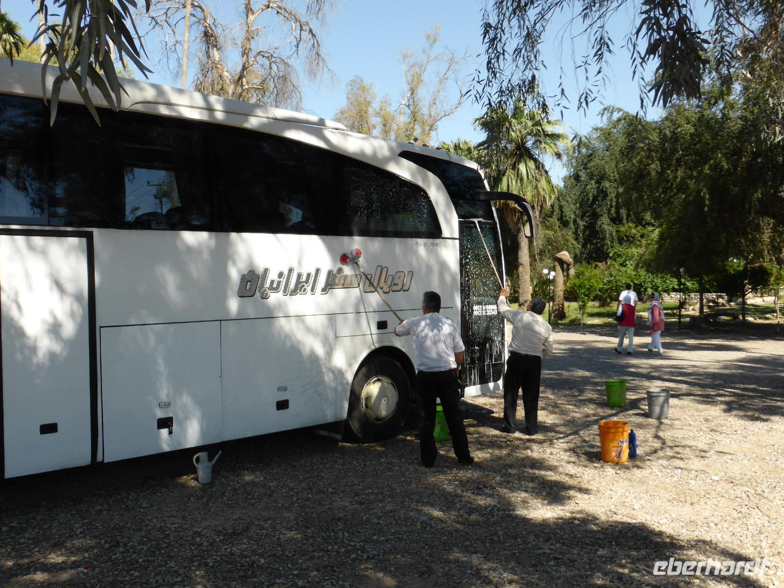 Auf der Weiterfahrt von Choga Zanbil nach Haft Tappeh (Sieben Hügel) sahen wir die Zerstörungen, welche die sintflutartigen Regenfälle der vorangegangenen Tage in der sonst so trockenen Region angerichtet hatten. Die Straßendecke war kilometerlang unterspült und weggebrochen. In den Wasserlöchern links und rechts der Straße beobachteten wir einige badende Wasserbüffel, welche sichtlich die unerwartete Anzahl an Badegelegenheiten genossen. In Haft Tappeh sahen wir das vermutlich älteste Tonnengewölbe-Grab der Welt aus alt-elamischer Zeit. Die Funde der Ausgrabungen konnten wir anschließend im Museumsgebäude ansehen, neben Ausstellungsstücken aus Chogha Zanbil. Nach der Besichtigung fuhren wir wieder nach Ahvaz zurück. Gut die Hälfte unserer Gruppe nutzte die freie Zeit bis zum Abendessen für einen Bummel über den arabischen Basar. Unser Abendessen nahmen wir nicht weit von unserem Hotel entfernt in einem Gartenrestaurant ein. Es war wohltuend, bei den angenehmen Temperaturen im Freien sitzen zu können und den Mond und die Sterne zu beobachten. Das Essen schmeckte wieder einmal fantastisch und als Spezialität gab es gegrillten Fisch aus dem Persischen Golf.