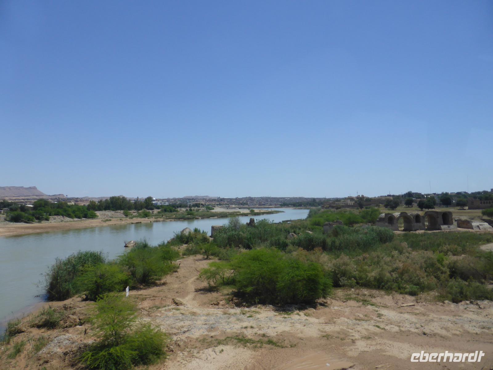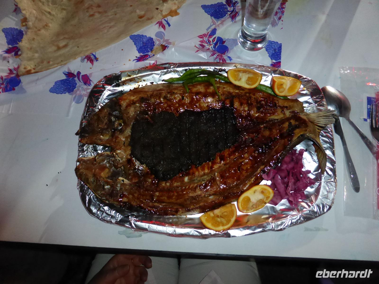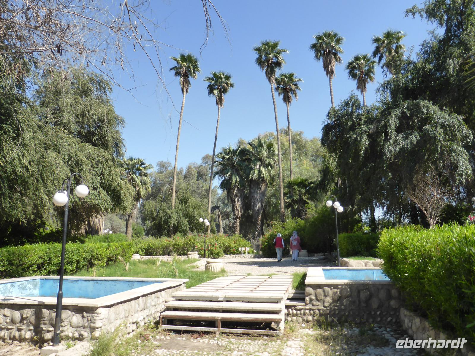 Auf der Weiterfahrt von Choga Zanbil nach Haft Tappeh (Sieben Hügel) sahen wir die Zerstörungen, welche die sintflutartigen Regenfälle der vorangegangenen Tage in der sonst so trockenen Region angerichtet hatten. Die Straßendecke war kilometerlang unterspült und weggebrochen. In den Wasserlöchern links und rechts der Straße beobachteten wir einige badende Wasserbüffel, welche sichtlich die unerwartete Anzahl an Badegelegenheiten genossen. In Haft Tappeh sahen wir das vermutlich älteste Tonnengewölbe-Grab der Welt aus alt-elamischer Zeit. Die Funde der Ausgrabungen konnten wir anschließend im Museumsgebäude ansehen, neben Ausstellungsstücken aus Chogha Zanbil. Nach der Besichtigung fuhren wir wieder nach Ahvaz zurück. Gut die Hälfte unserer Gruppe nutzte die freie Zeit bis zum Abendessen für einen Bummel über den arabischen Basar. Unser Abendessen nahmen wir nicht weit von unserem Hotel entfernt in einem Gartenrestaurant ein. Es war wohltuend, bei den angenehmen Temperaturen im Freien sitzen zu können und den Mond und die Sterne zu beobachten. Das Essen schmeckte wieder einmal fantastisch und als Spezialität gab es gegrillten Fisch aus dem Persischen Golf.