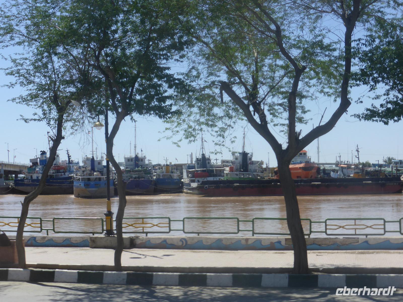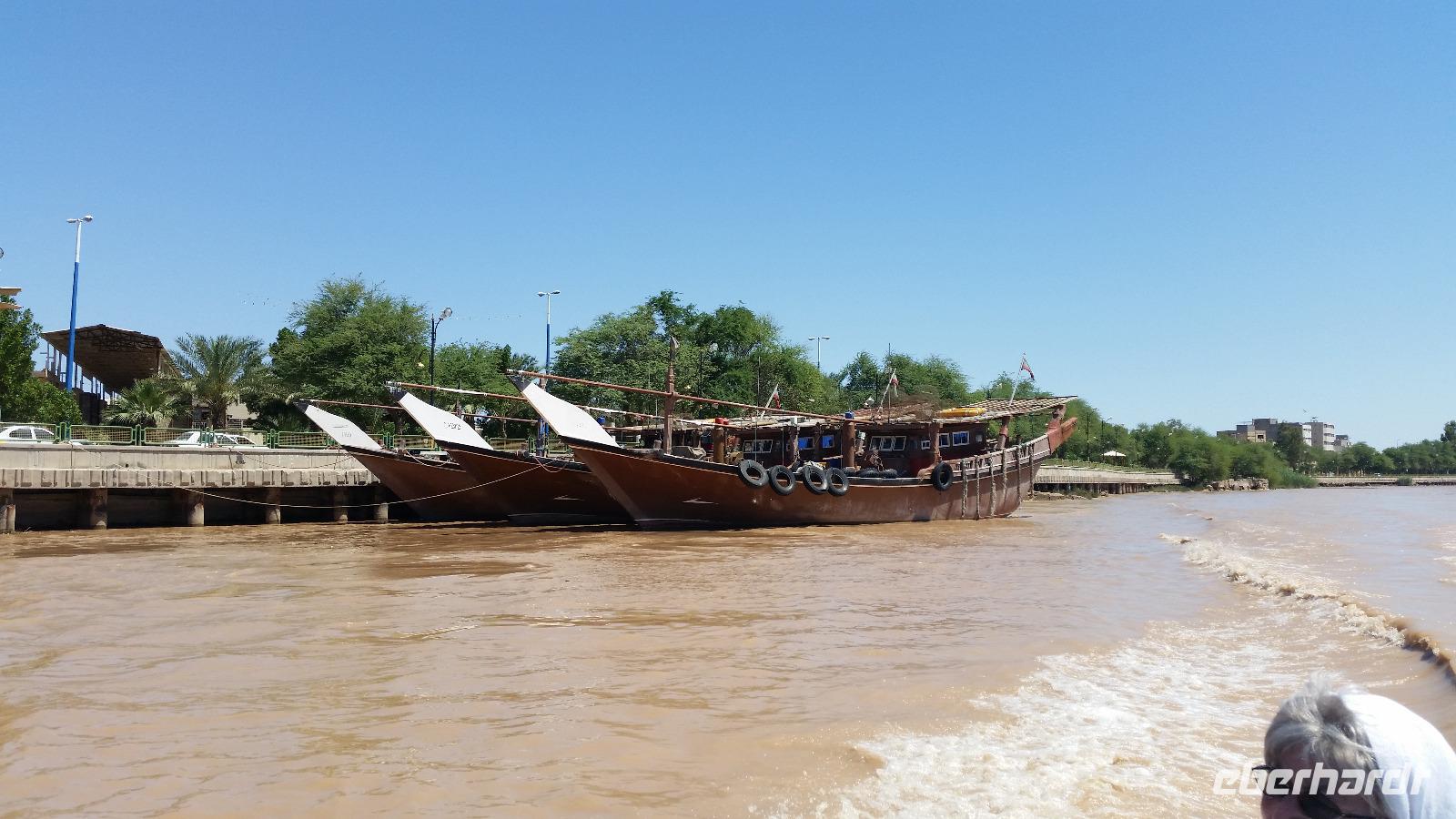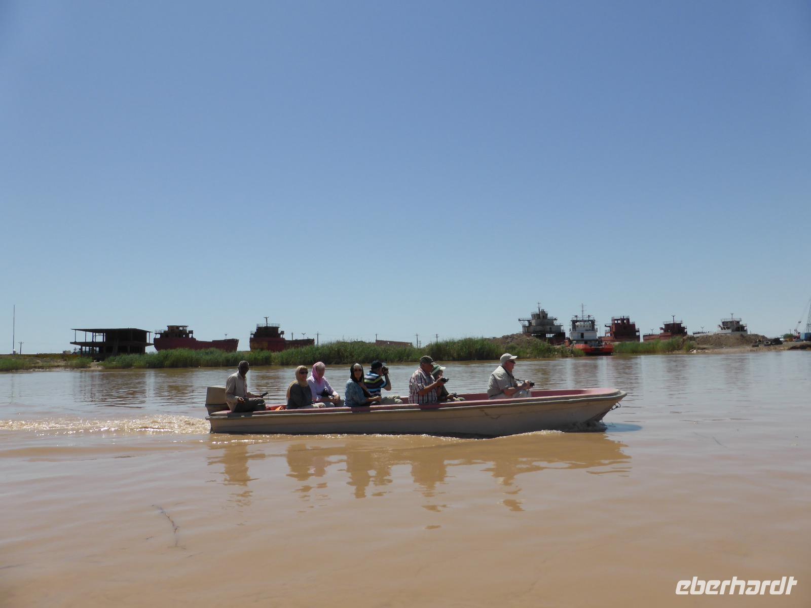 Anschließend unternahmen wir eine Bootsfahrt auf dem Arvand-Rud, welcher auf irakischer Seite Shatt al Arab heißt, und an dieser Stelle bereits die Flüsse Euphrat und Tigris in sich vereint. Wir wurden auf drei Boote aufgeteilt und fuhren zunächst bis zur irakischen Grenze. Das Wasser war aufgrund der Regenfälle braun gefärbt. Wir hatten den schönsten Sonnenschein und der Fahrtwind sorgte für die nötige Kühlung. Dann ging es in die andere Richtung zum Persischen Golf, den wir als geschlossenes Meer allerdings von dieser Stelle aus nicht zu Gesicht bekamen. Nach unserer Bootsfahrt besuchten wir den Fischmarkt von Khorramshahr und bei unserer anschließend geplanten Weiterfahrt blieb ein Baufahrtzeug mitten auf der Straße liegen, so dass uns nichts anderes übrig blieb, als die ganze Strecke im Rückwärtsgang bis zur letzten Kreuzung zurückzufahren. Von Khorramshahr aus ging es weiter nach Abadan, vorbei an der größten Erdölraffinerie-Anlage des Iran und einer der größten der Welt. Die Stadt ist das Zentrum der iranischen Erdölindustrie. Weiter südlich, am Persischen Golf, liegen die Freihandelszone Arvand sowie ein militärisches Sperrgebiet. Auf unserer Rückfahrt von Abadan nach Ahvaz legten wir noch einen Picknick-Stopp ein und sahen die brennenden Fackeltürme der erdgasverarbeitenden Anlagen. In Ahvaz hatten wir bis zum Abendessen Freizeit. Abends versammelten sich vor dem Hotel Fussballfans, welche die Ankunft der Teheraner Mannschaft erwarteten. Offensichtlich sollten die Spieler in unserem Hotel übernachten. Nach stundenlangem Warten hörten wir dann gegen Mitternacht die jubelnden Fangesänge und an Schlaf war in der folgenden Stunde überhaupt nicht mehr zu denken.