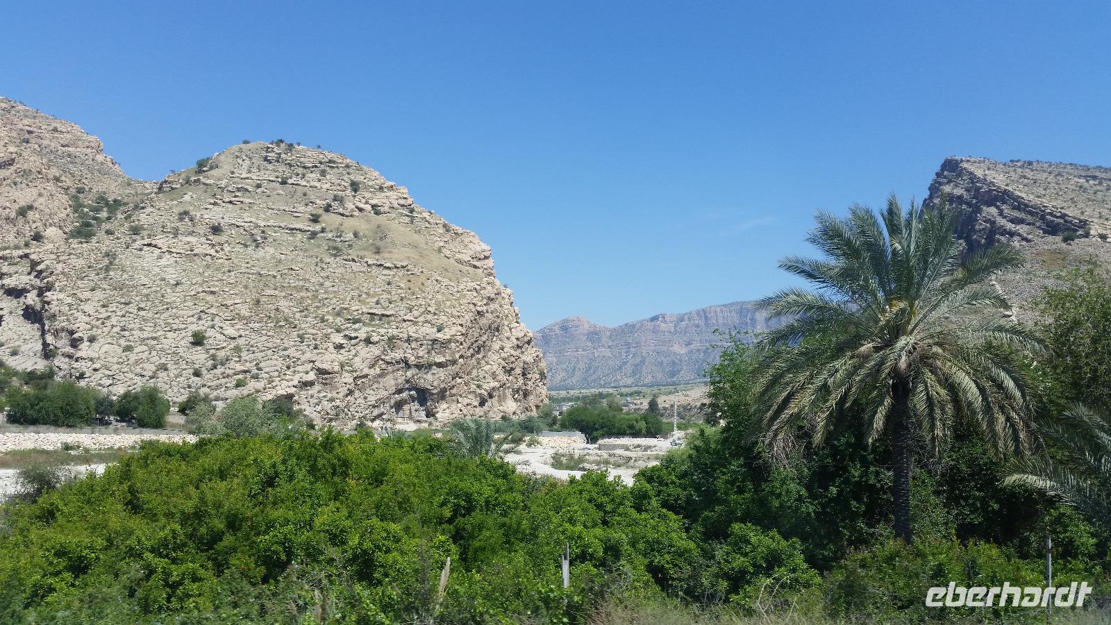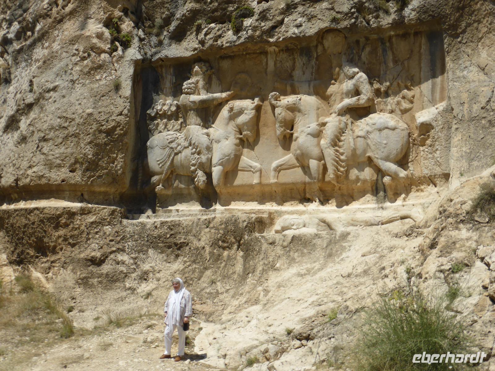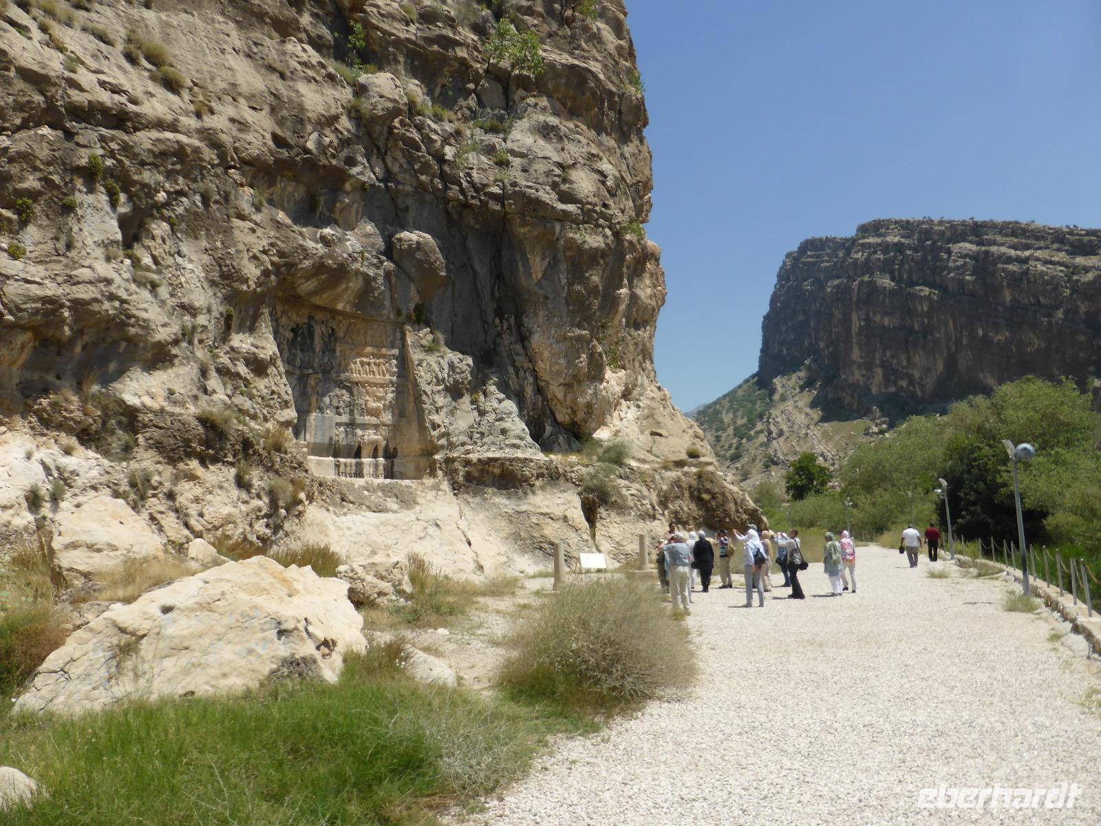 Am letzten Tag unserer Reise verließen wir zeitig unser Hotel. Frühstück gab es bereits um 05.00 Uhr und die Abfahrt war eine Stunde später. Die erste Pause machten wir in Bebahan. Bis dahin hatten die meisten von uns im Bus geschlafen. Ab Bebahan wurde auch die Landschaft wieder interessant, so dass wir einen schönen Fotostopp einlegten. Gegen Mittag hielten wir in Qaemiyeh, um uns mit frischem Obst für unser geplantes Picknick einzudecken, und kurze Zeit später kamen wir an der Tang-e Chowgan-Schlucht an. Der Parkplatz war bereits voll mit iranischen Pkw's. Wir beschlossen, zunächst unsere Picknickpause zu machen und anschließend die Felsreliefs in der Schlucht zu besichtigen. Wie immer beim Kontakt mit Einheimischen, wurden wir auch dieses Mal am Rastplatz freundlich begrüßt. Wir revanchierten uns und verschenkten süße Melonenstücke. Die Felsreliefs der Tang-e Chowgan-Schlucht sind fantastisch erhalten und zeigen den Sieg Shapurs I. über den römischen Kaiser Valerian (260 n.Chr), den Sieg Bahrams II. über die Araber ( 277 n.Chr.) und die Krönung Bahrams I. (273 n.Chr.).