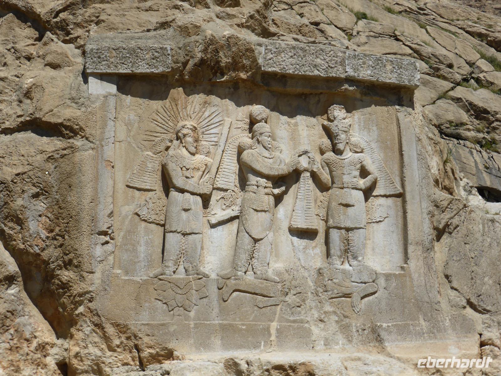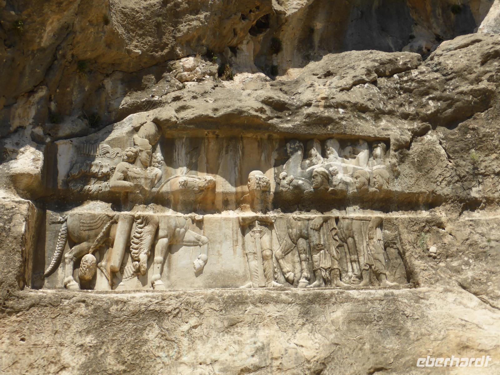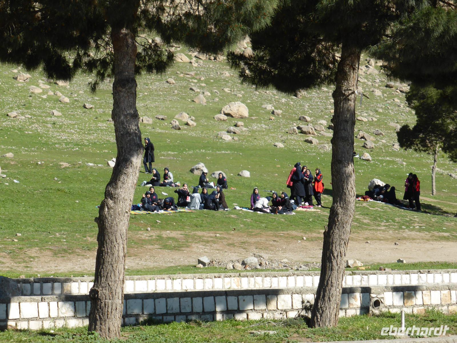 Am letzten Tag unserer Reise verließen wir zeitig unser Hotel. Frühstück gab es bereits um 05.00 Uhr und die Abfahrt war eine Stunde später. Die erste Pause machten wir in Bebahan. Bis dahin hatten die meisten von uns im Bus geschlafen. Ab Bebahan wurde auch die Landschaft wieder interessant, so dass wir einen schönen Fotostopp einlegten. Gegen Mittag hielten wir in Qaemiyeh, um uns mit frischem Obst für unser geplantes Picknick einzudecken, und kurze Zeit später kamen wir an der Tang-e Chowgan-Schlucht an. Der Parkplatz war bereits voll mit iranischen Pkw's. Wir beschlossen, zunächst unsere Picknickpause zu machen und anschließend die Felsreliefs in der Schlucht zu besichtigen. Wie immer beim Kontakt mit Einheimischen, wurden wir auch dieses Mal am Rastplatz freundlich begrüßt. Wir revanchierten uns und verschenkten süße Melonenstücke. Die Felsreliefs der Tang-e Chowgan-Schlucht sind fantastisch erhalten und zeigen den Sieg Shapurs I. über den römischen Kaiser Valerian (260 n.Chr), den Sieg Bahrams II. über die Araber ( 277 n.Chr.) und die Krönung Bahrams I. (273 n.Chr.).