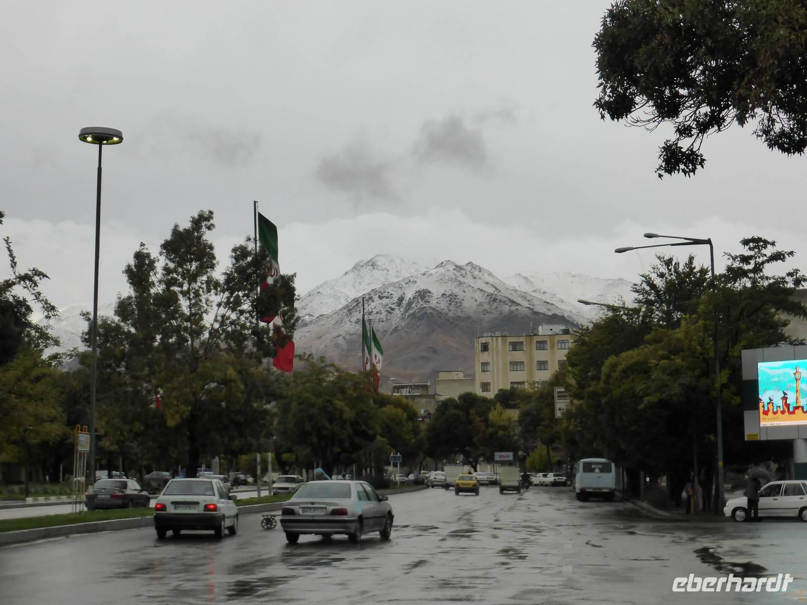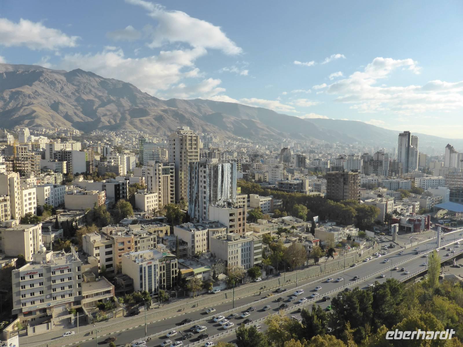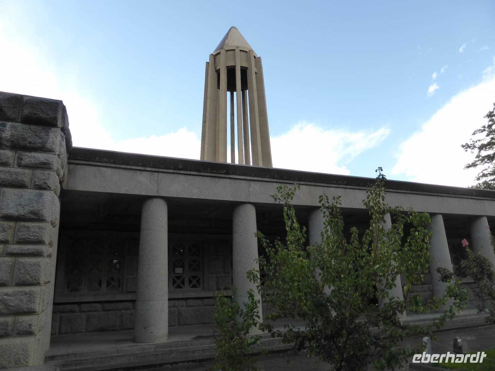 Bereits von unseren Hotelzimmern aus konnten wir am Stadtrand die schneebedeckten Berge des Elburz-Gebirges sehen. In diesem Gebirgszug liegt auch der mit 5671 Metern höchste Berg des Iran, der Damavand. Nach dem reichhaltigen Frühstück im Hotel fuhren wir zum Nationalmuseum (Muze-ye Melli-ye Iran), dem ältesten und bedeutendsten Museum Teherans. Ausgestellt sind Funde aus der Steinzeit bis zur Mitte des 1. Jahrtausends. Nach dem Museumsbesuch spazierten wir durch die Altstadt Teherans und anschließend holte uns unser Fahrer Mohammed Ali zur Weiterfahrt nach Qazwin ab. Die Fahrt führte uns auch zum Azadi-Monument, einem Bauwerk, welches 1971 anläßlich der 2500-Jahrfeier des iranischen Reiches vom letzten Shah eingeweiht wurde. Die Übersetzung des Namens „Azadi" bedeutet „Freiheit".