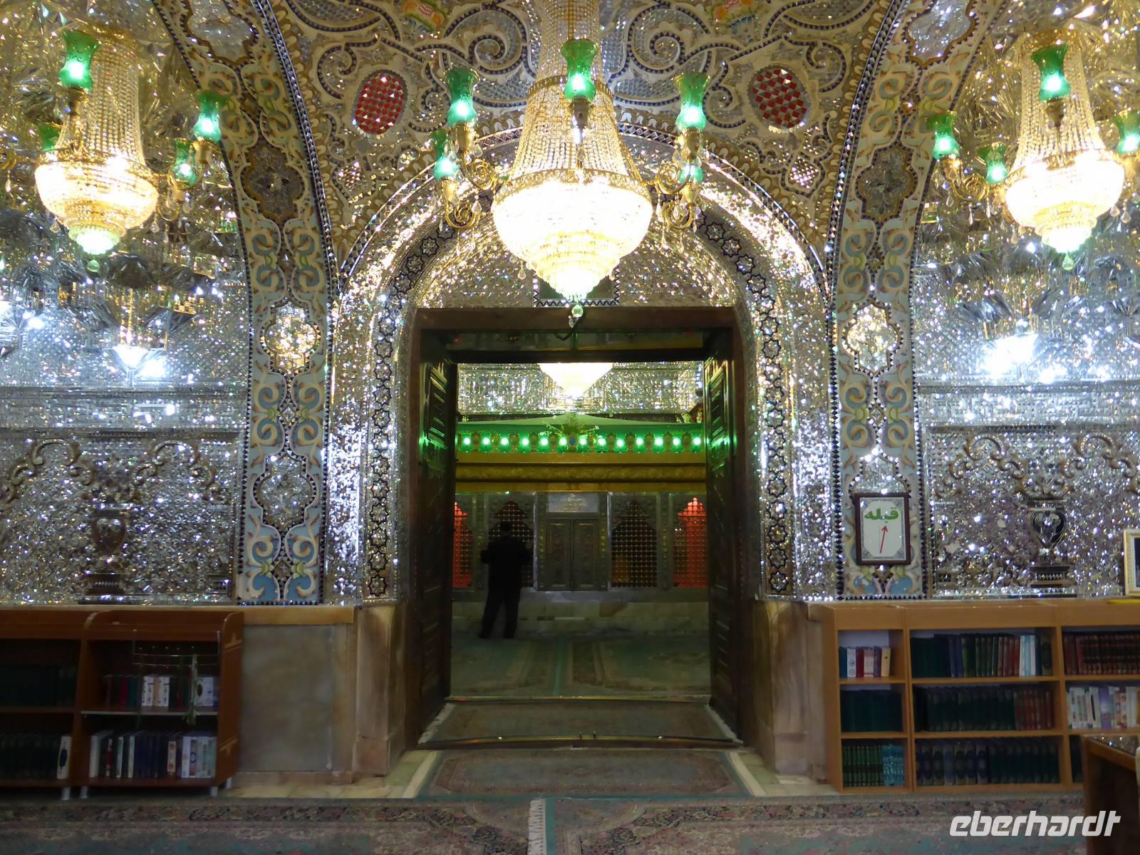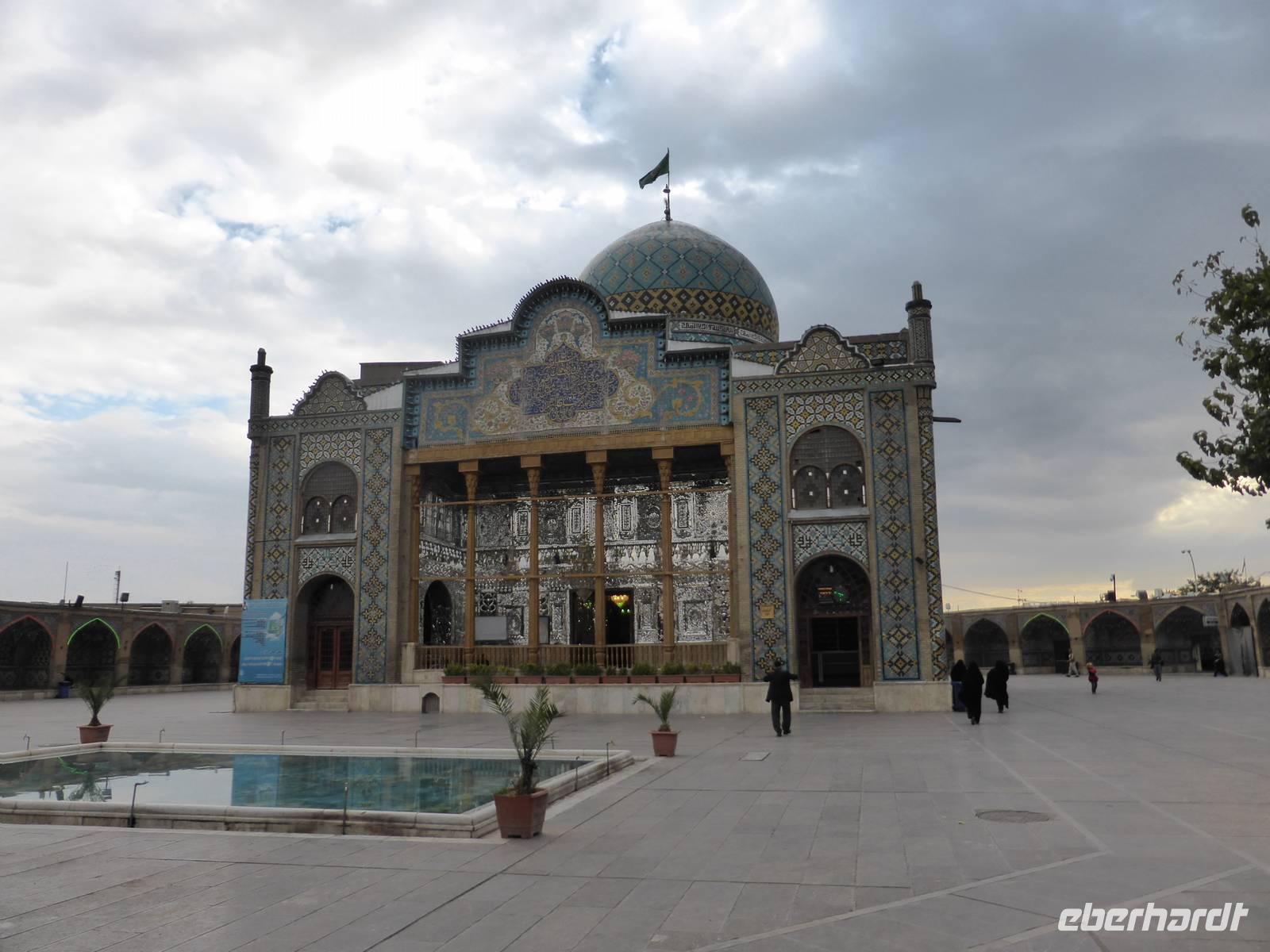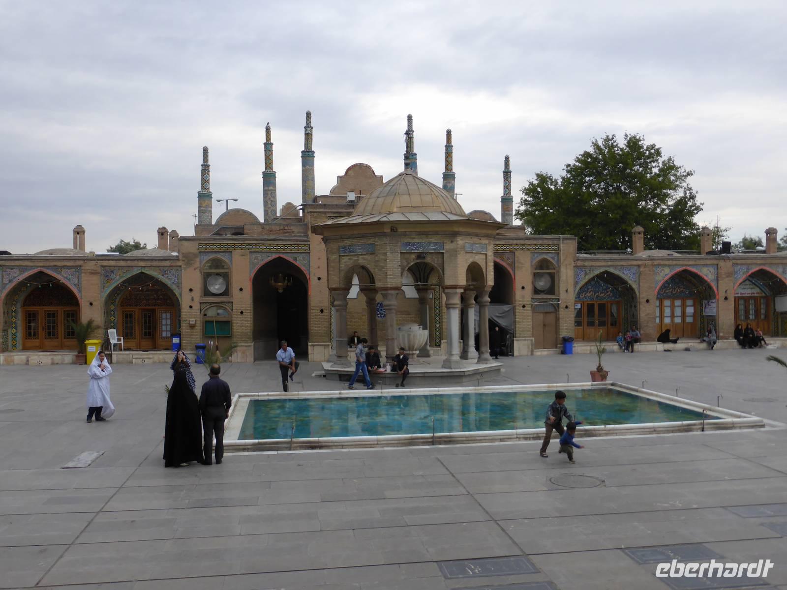 Am Nachmittag fuhren wir zum Shah Cheragh-Mausoleum. Hazrat-e Mir Seyyed Ahmad (Shah Cheragh) war ein Bruder des 8. Imams Reza und die Anlage ist das drittwichtigste Heiligtum der Schiiten im Iran. Obwohl die Anlage für Nicht-Muslime lange Zeit nicht zugänglich war, durften wir den Innenhof und das Mausoleum besichtigen. Im Anschluss besuchten wir an diesem Tag noch den Najarestan-Garten, einen Verwaltungssitz aus dem Ende des 19.Jh., der eher den Eindruck einer Palastanlage mit persischem Garten hinterlässt. Bevor wir zum Hotel zurück fuhren, hielten wir für einen Fotostopp am Koran-Tor, in dessen mittleren Bogen ein Koran enthalten sein soll, welcher die Reisenden beschützt und segnet.