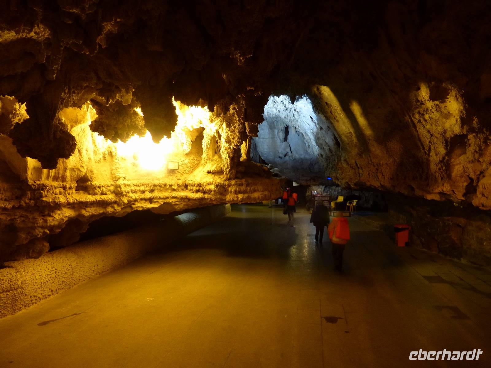 In Ali Sadr besichtigten wir einen Teil des gigantischen, ca. 136-190 Millionen Jahre alten Höhlensystems, von dem etwa 11 km² erforscht und 3,5 km für die Öffentlichkeit zugänglich und beleuchtet sind. Durch Zufall entdeckte ein Hirte, eine seiner Ziegen suchend, das Höhlensystem in den 1950er Jahren. Wir konnten das Höhlensystem während einer Bootsfahrt erkunden. Zuerst bekam jeder von uns eine Schwimmweste. Dann stiegen wir in die Höhle hinab und liefen zur Bootsanlegestelle. Drei bis vier Plasteboote waren immer in Reihe zusammengebunden und im vordersten saßen der Höhlenführer und unser Reiseleiter Ali. Nachdem wir bei der Bootsfahrt trocken geblieben waren, goss es auf dem Weg zum Bus in Strömen. Wir versuchten uns von Marktstand zu Marktstand zu retten und waren am Ende trotzdem nass. Von Ali Sadr fuhren wir zu unserem Hotel „Baba Taher" in Hamadan.